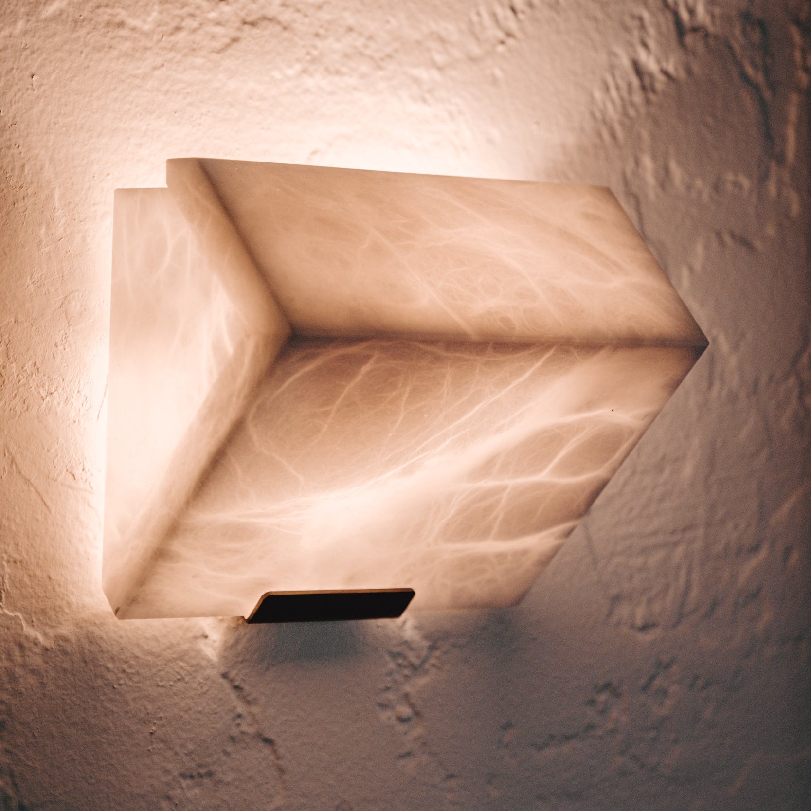 Executed in the highest quality solid alabaster mounted on a Minimalist satin-finished black oxidized steel bracket, this ultra-refined design adds a sculptural element and focal point of incomparable beauty.