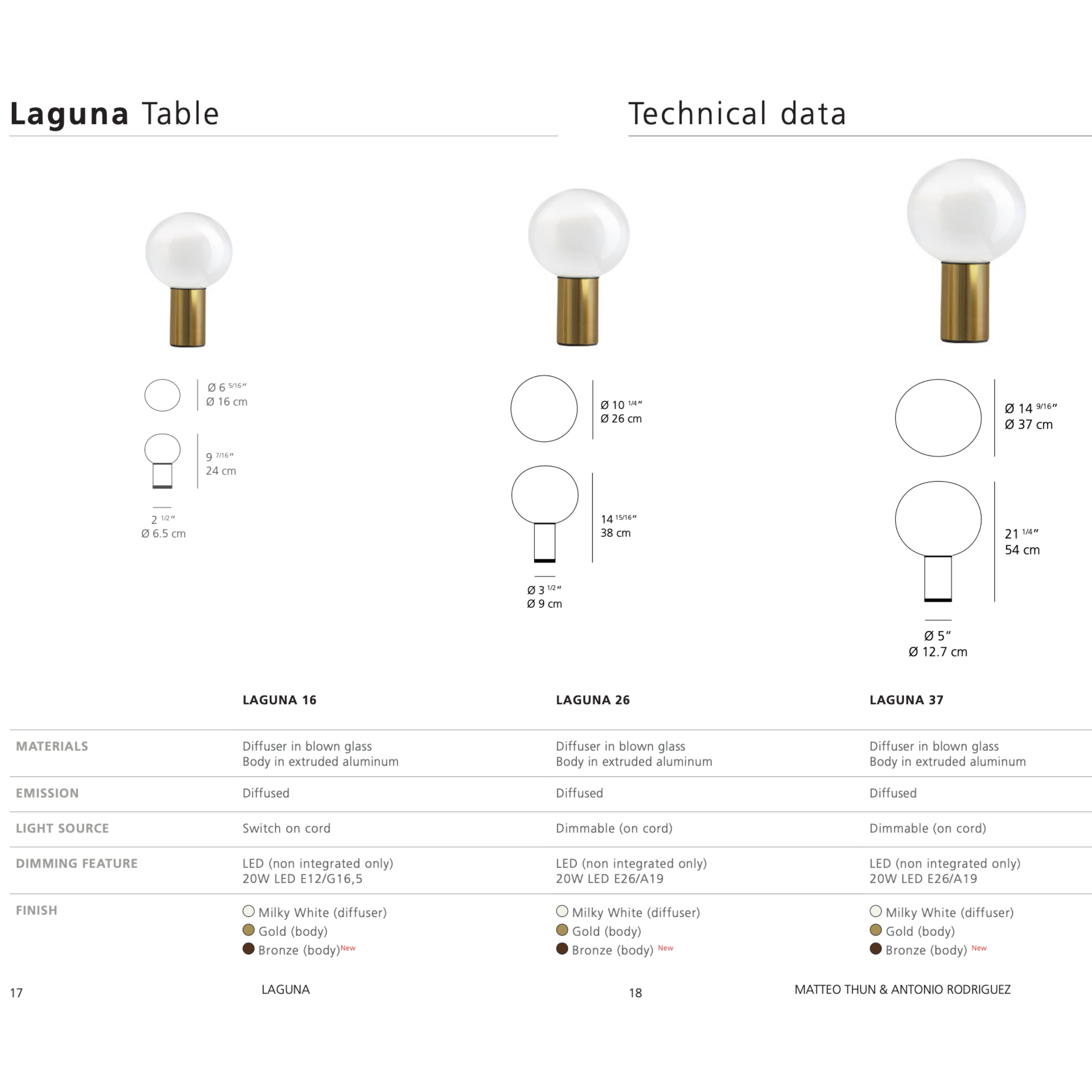 The Laguna's lyrical design casts a warm and diffused light. Executed in handblown milky white glass with crystal finish at the top and mounted on a brass or gold finished extruded aluminum base. According to Thun, "The lagoon of Venice was the main inspiration: Its fascinating atmosphere, its light, and its mist. The character of the collection reflects its main material: handblown glass from Venice."