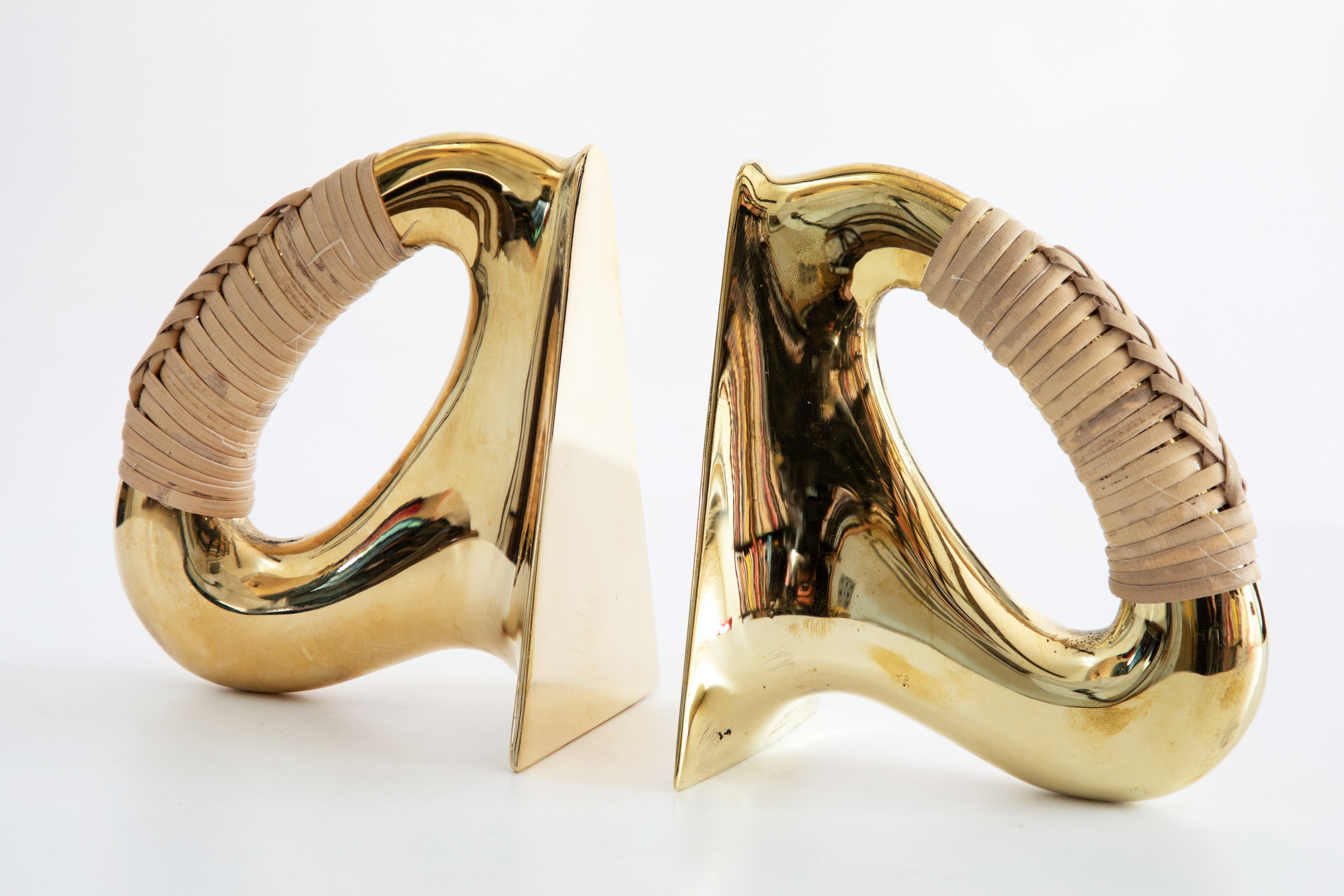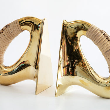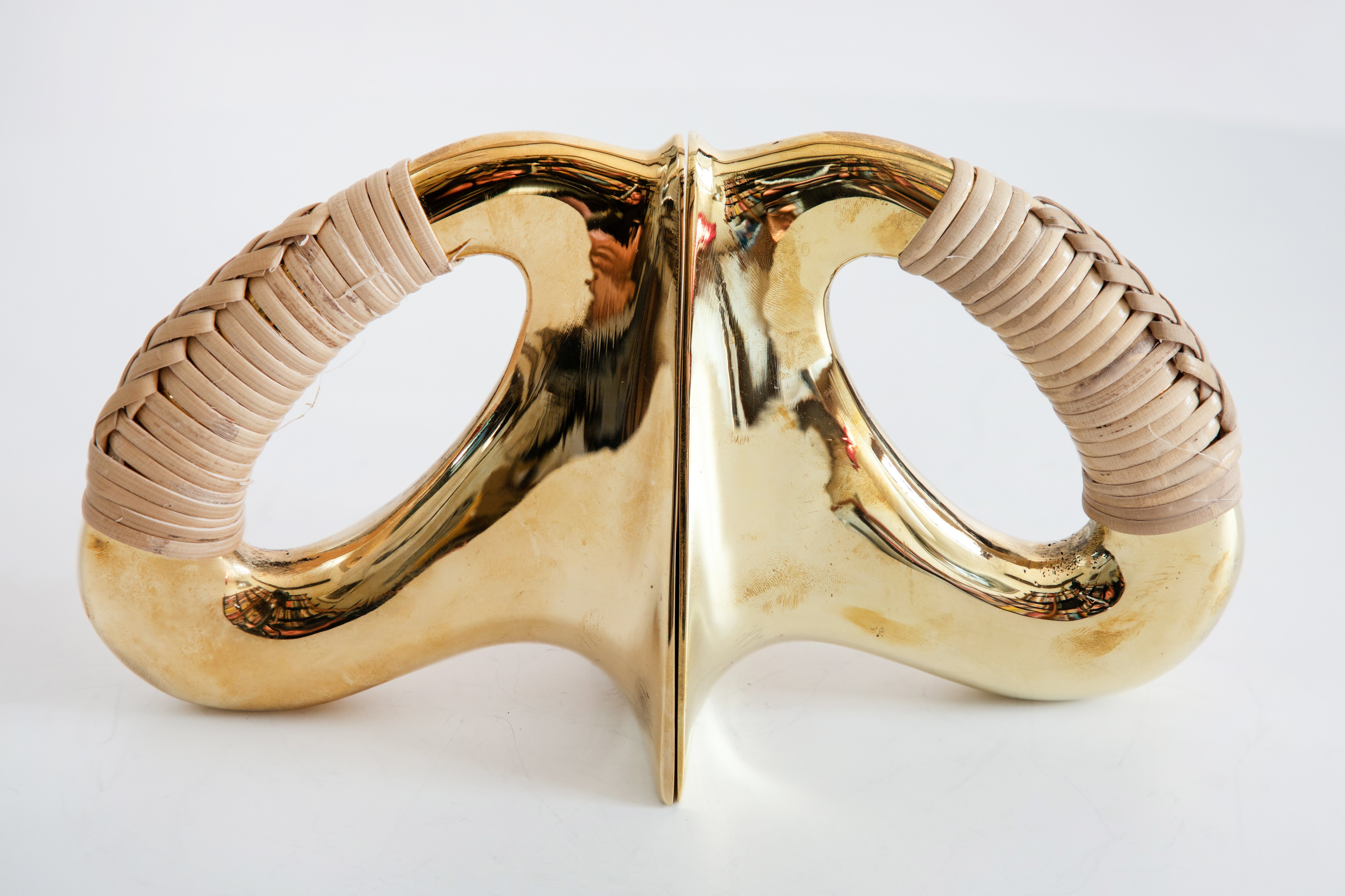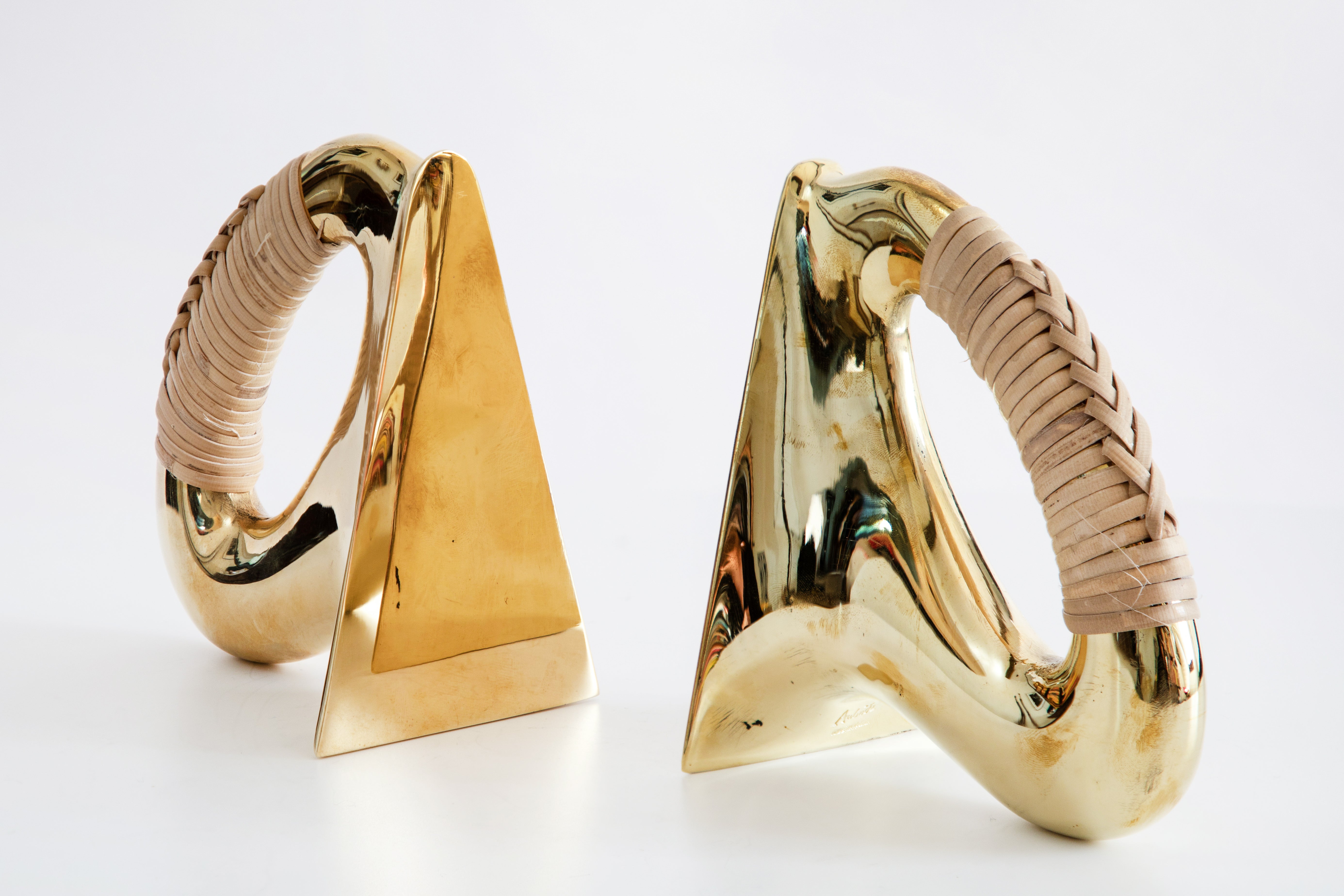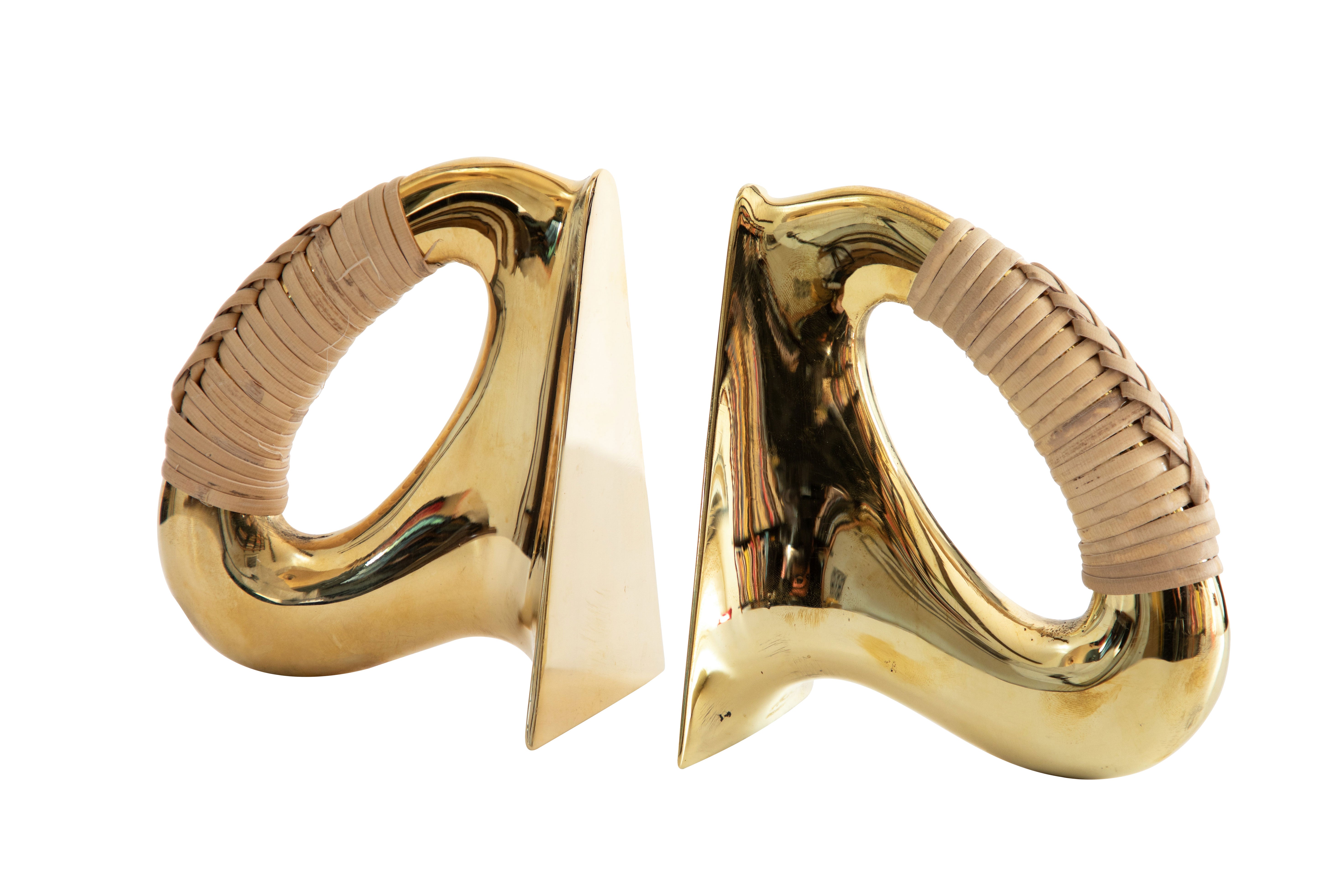 Designed in the 1950s, this incredibly refined and sculptural pair of bookends are executed in polished or patinated brass and handwoven cane work on the handles. Each piece bears the "Auböck" stamp.