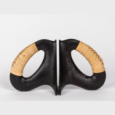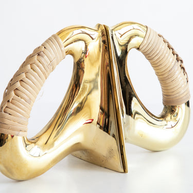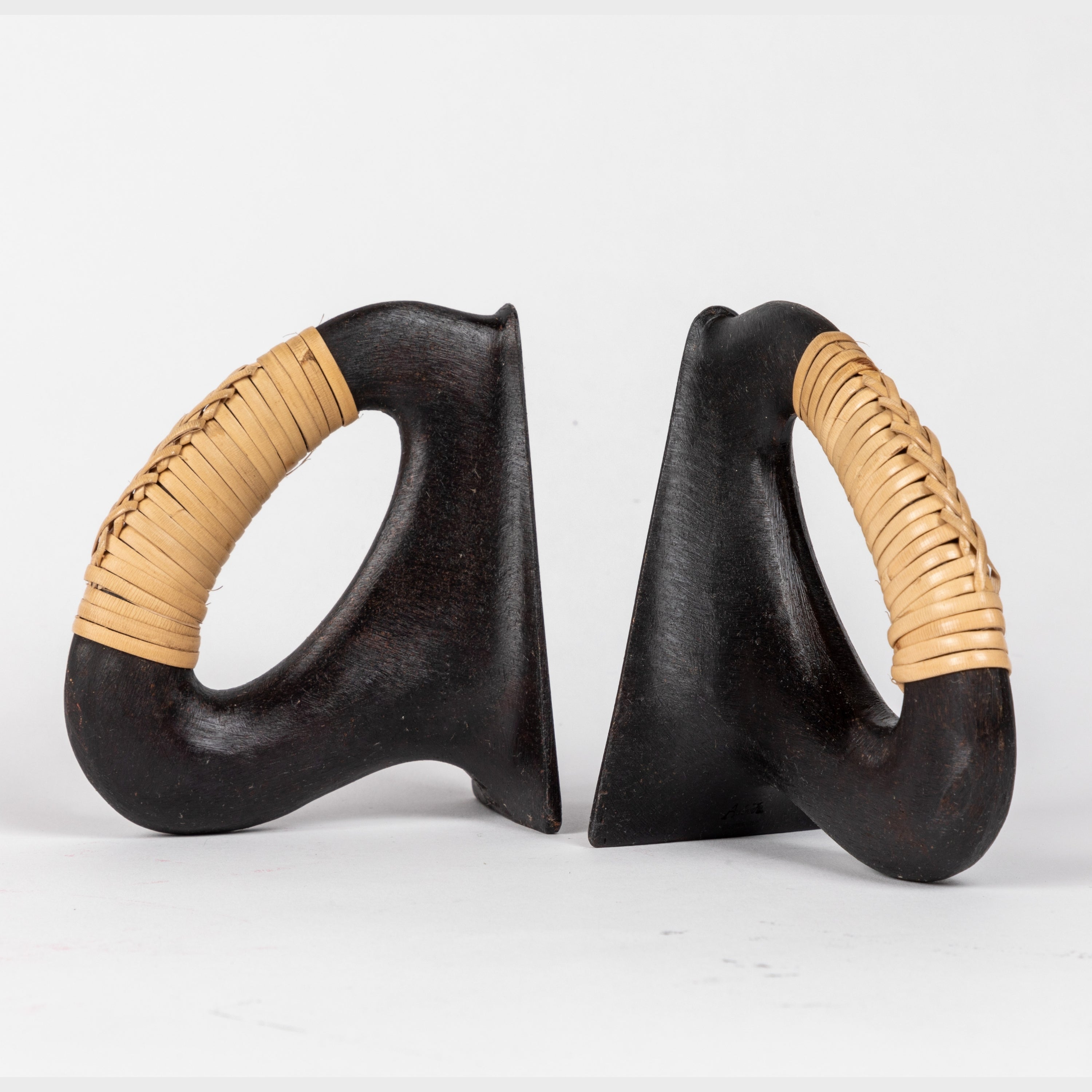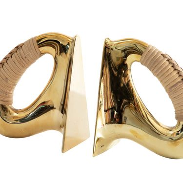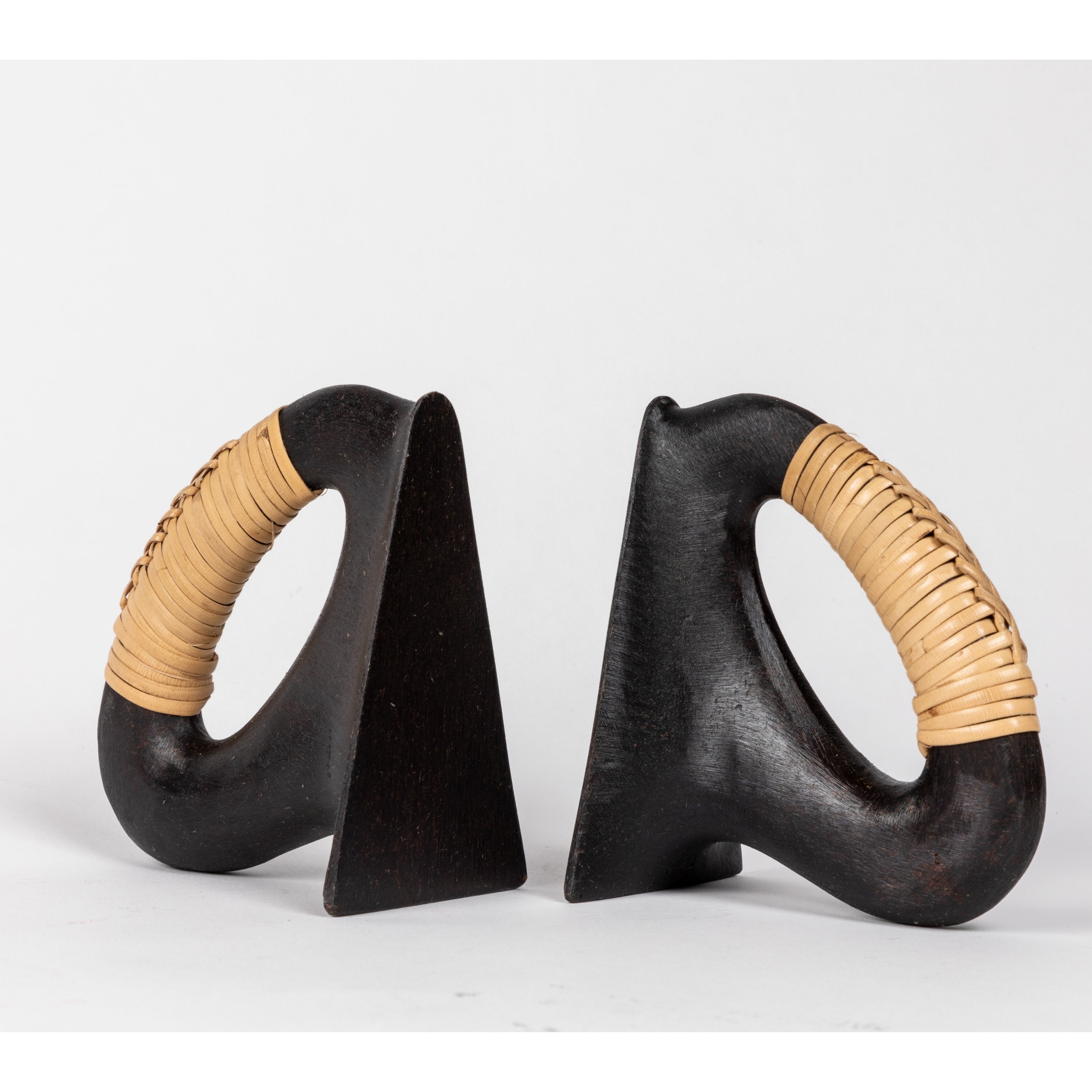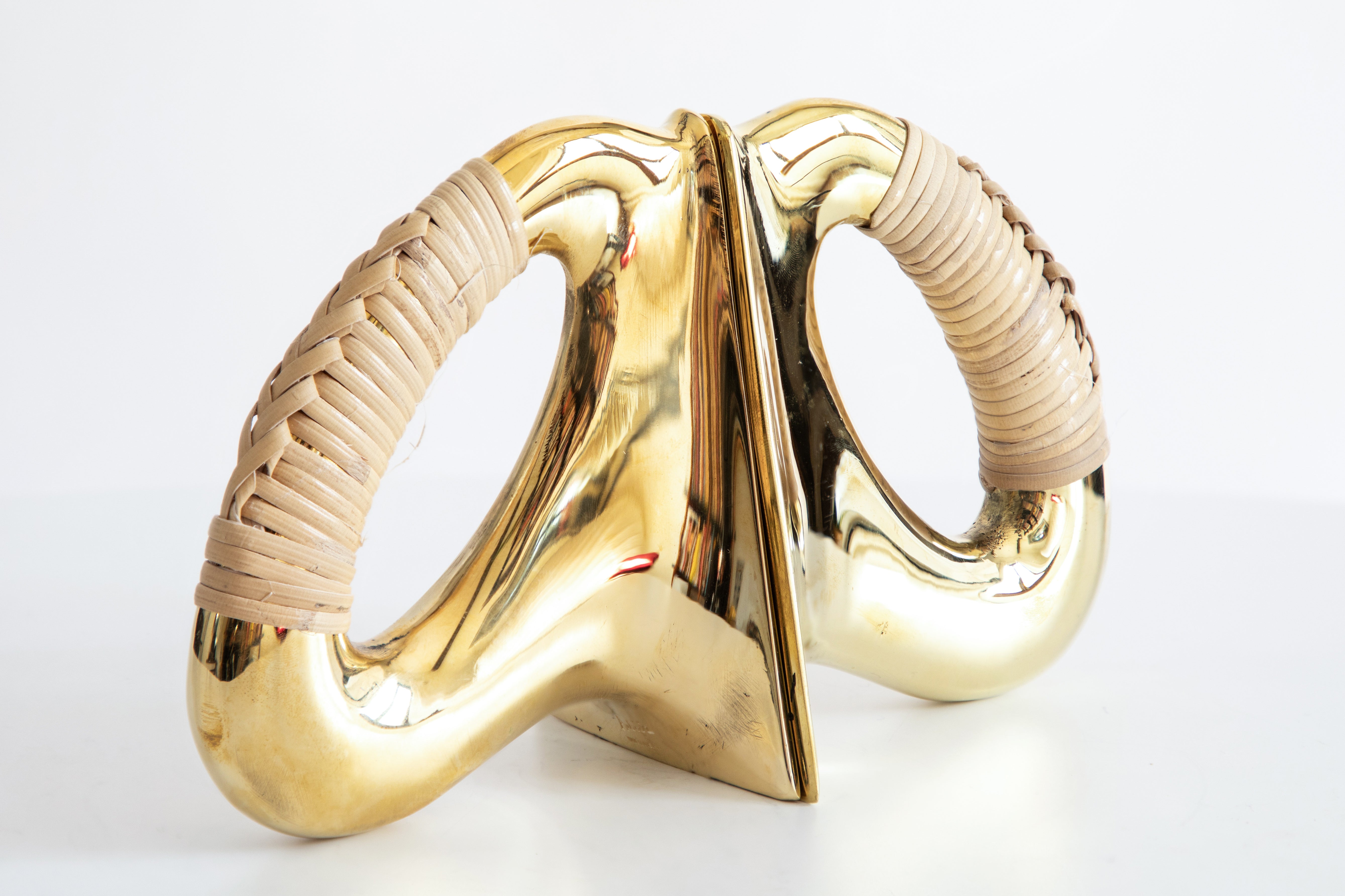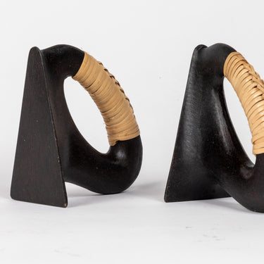 Designed in the 1950s, this incredibly refined and sculptural pair of bookends are executed in polished or patinated brass and handwoven cane work on the handles. Each piece bears the "Auböck" stamp.