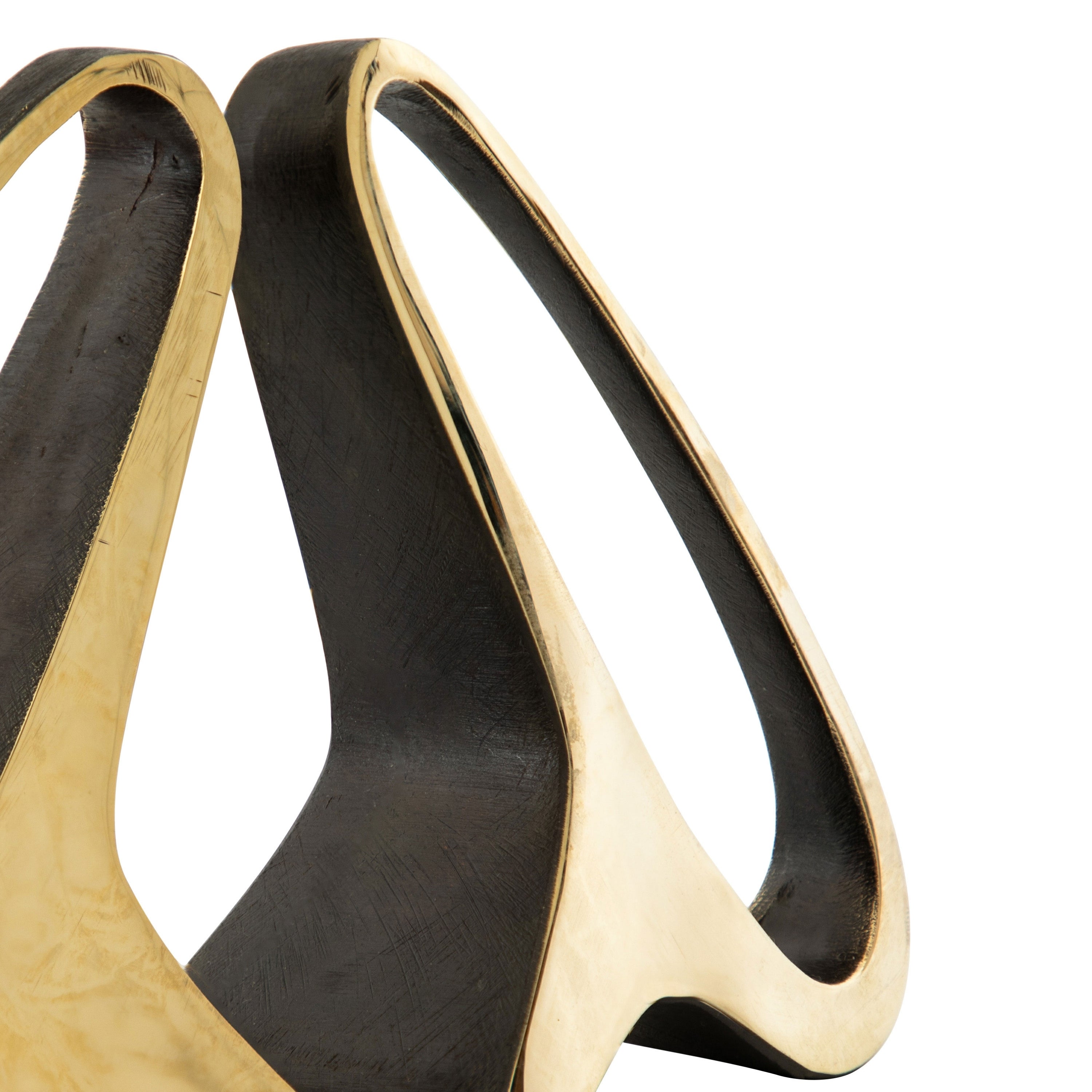 Designed in the 1950s, this refined and sculptural pair of bookends are executed in polished and patinated brass. The Auböck bookends provide an organic midcentury minimalist design for bookshelves or desks. Each piece is stamped "Auböck."