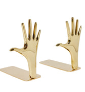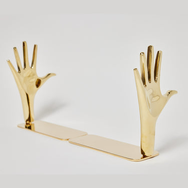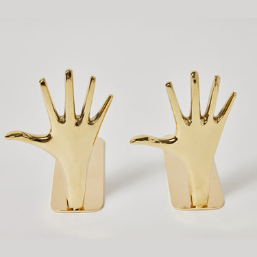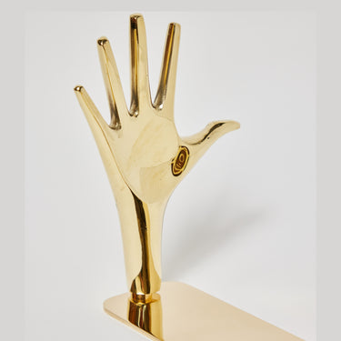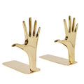 Designed in the 1950s, this incredibly refined and sculptural pair of bookends are executed in polished brass. Hand fully rotates on a screw and can be positioned palm outward or inward depending upon preference. These substantial pieces are ideal for art books and vinyl LPs. Each piece bears the "Auböck" stamp.