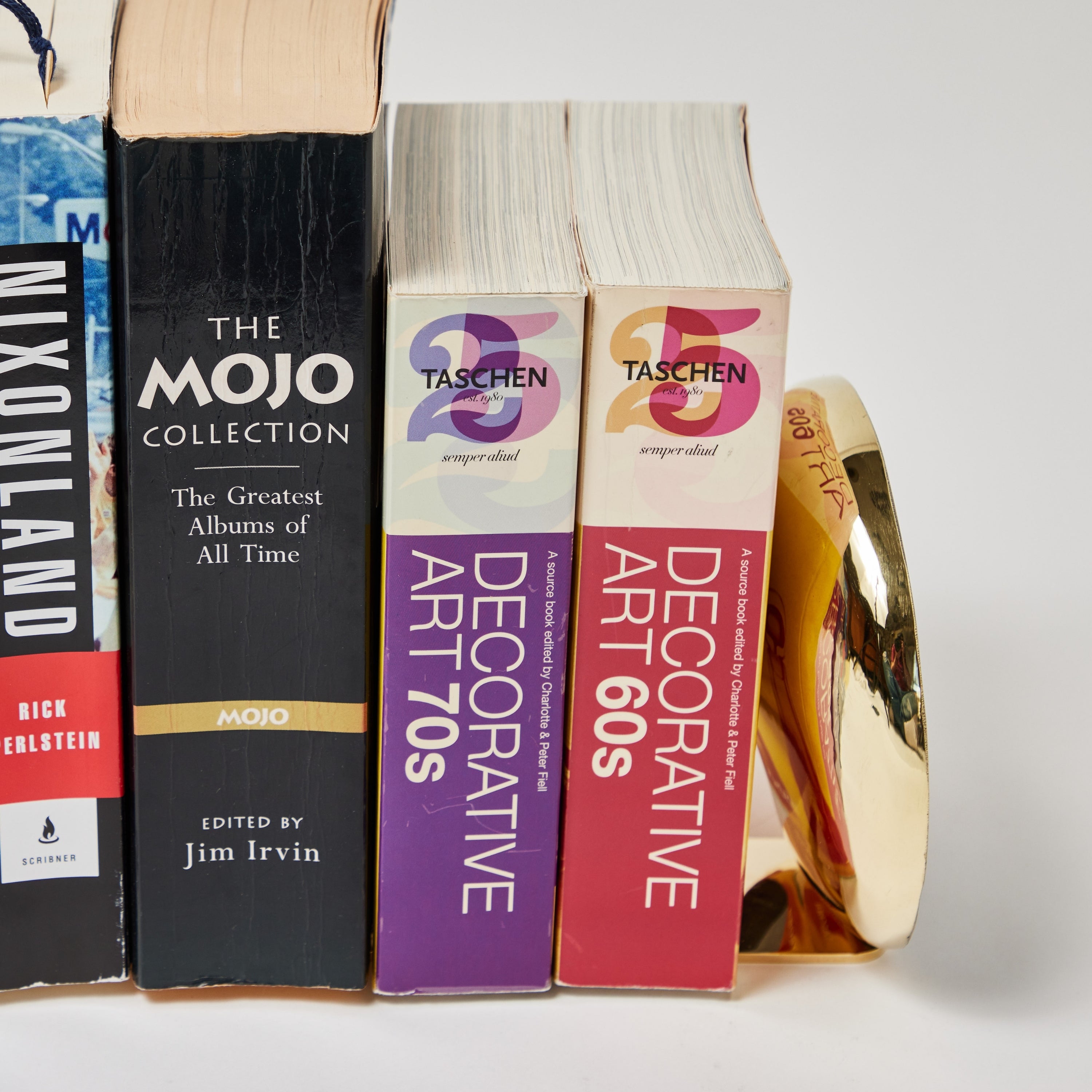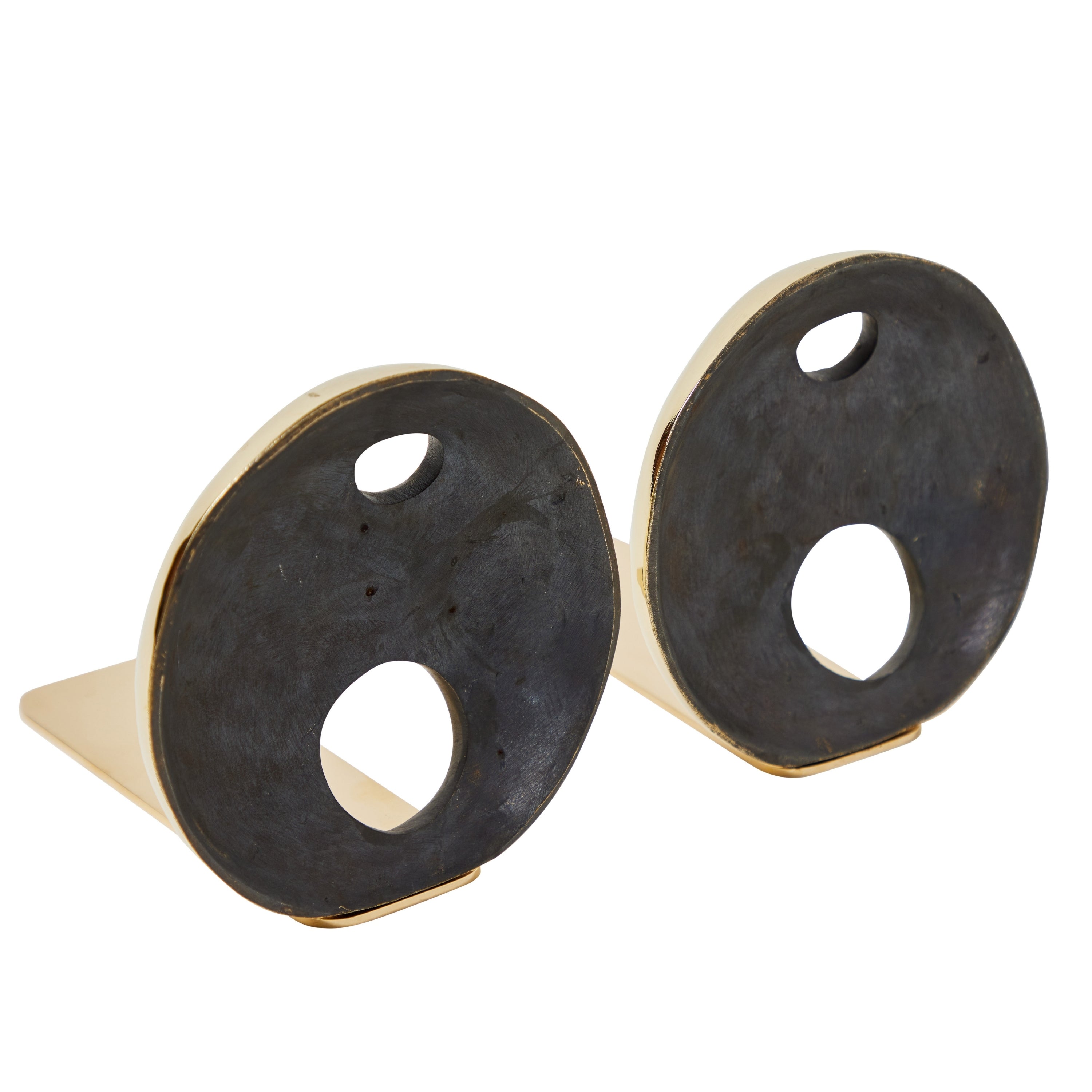 Designed in the 1950s, this refined and sculptural pair of bookends are executed in patinated and polished brass, which can be mounted outward or inward-facing depending upon preference. These substantial pieces are ideal for art books and vinyl LPs. Also known as the #4101 bookend, this design is a nod to the silent film director Georges Méliès. Each piece is stamped "Auböck."