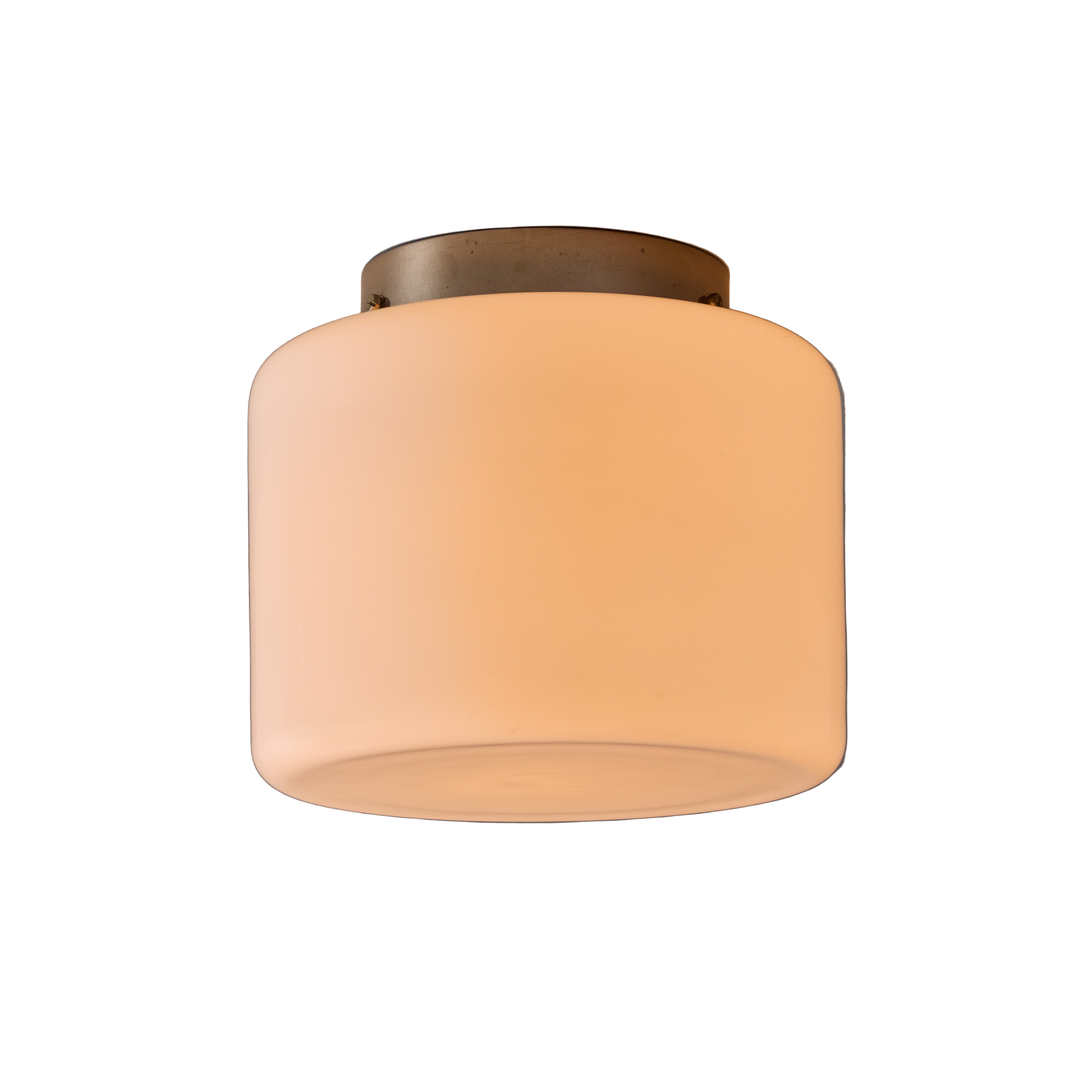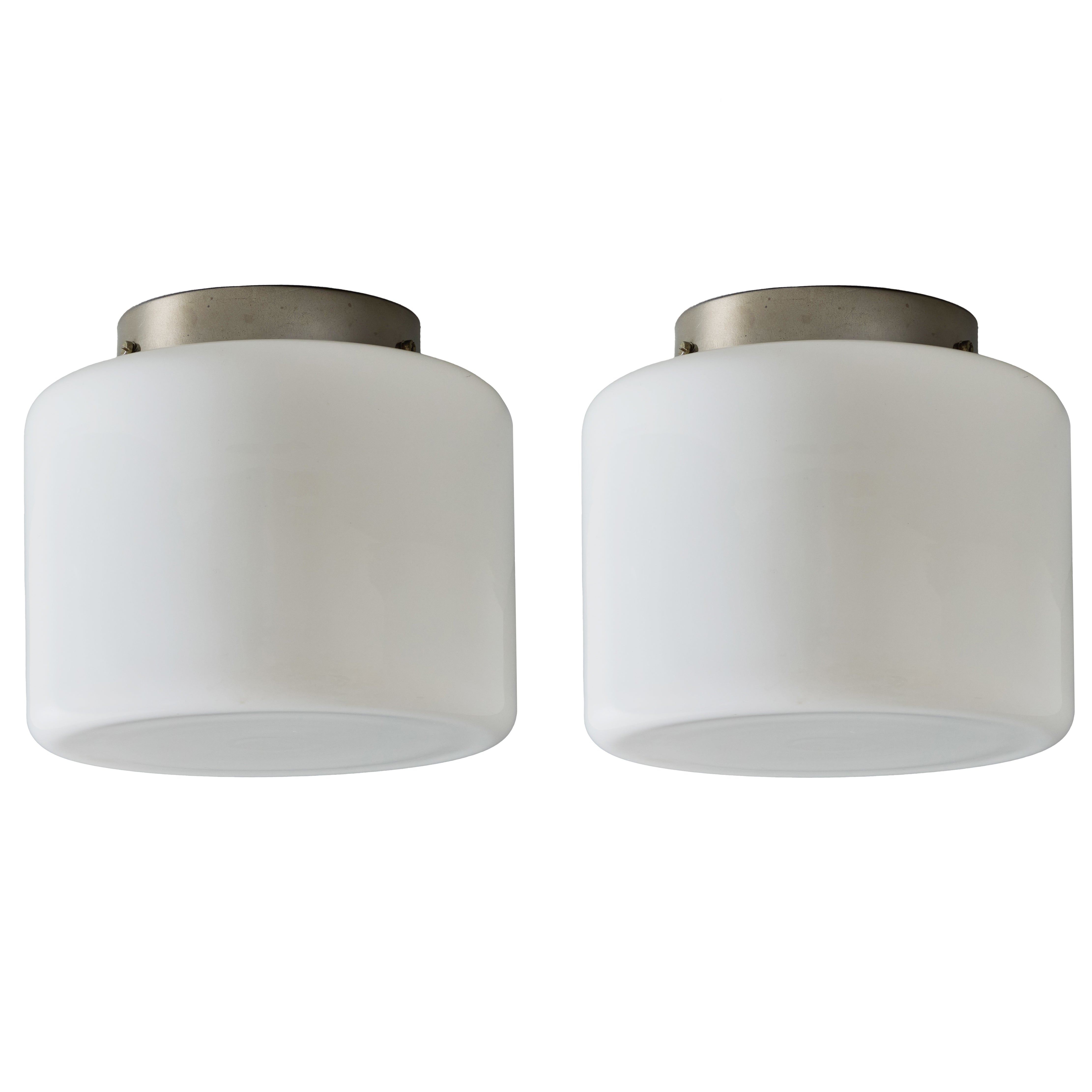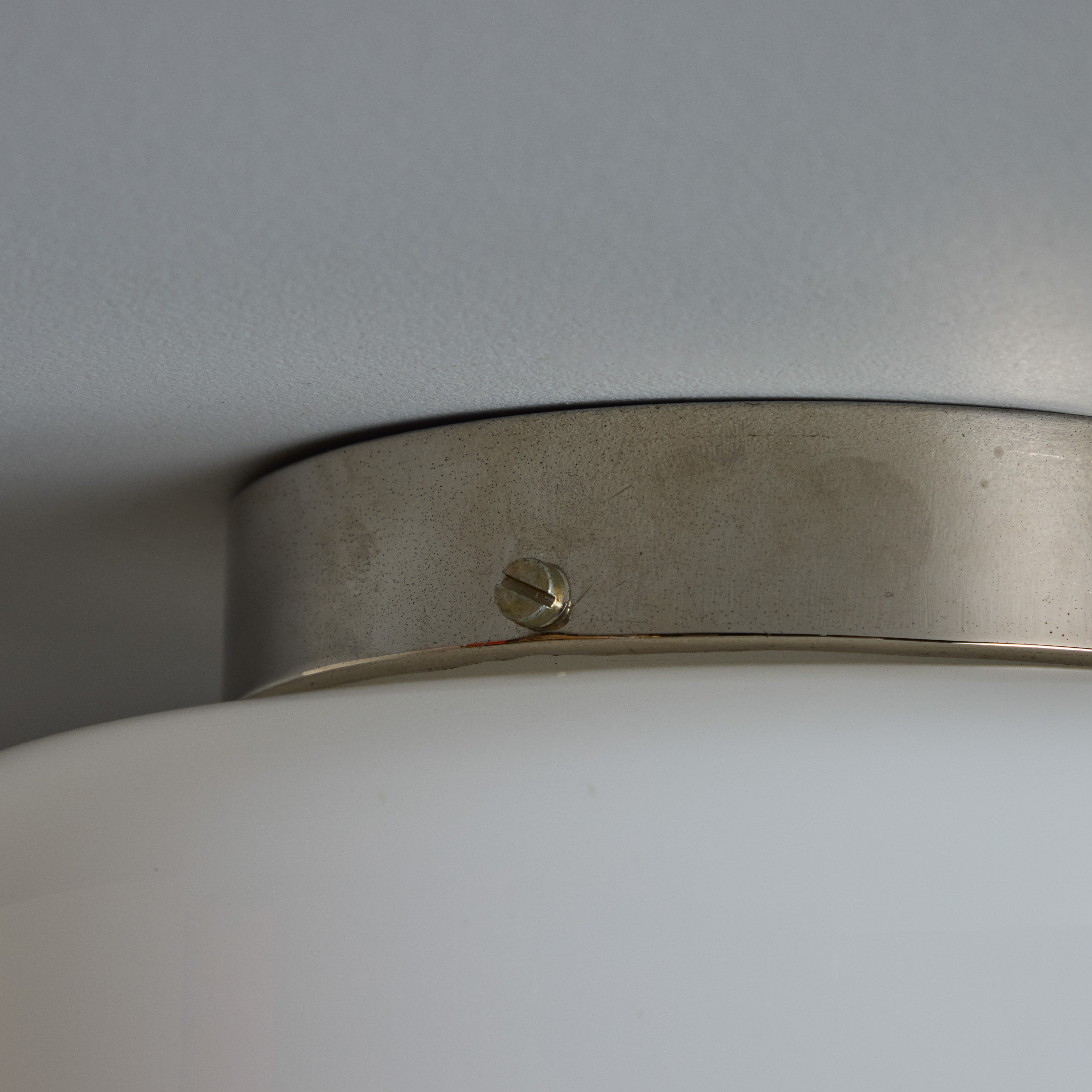 This rare flush mount is executed in white opaline glass and metal. Manufactured by Taito in the late 1940s, this is a fine unsigned example of a Tynell's iconic refinement. Beautiful thick opaline glass casts a soft diffuse glow. Reference: Idman Catalog 1937-38, p.37.