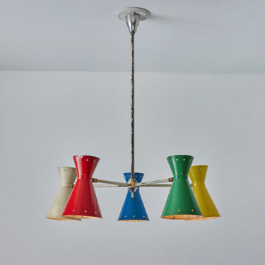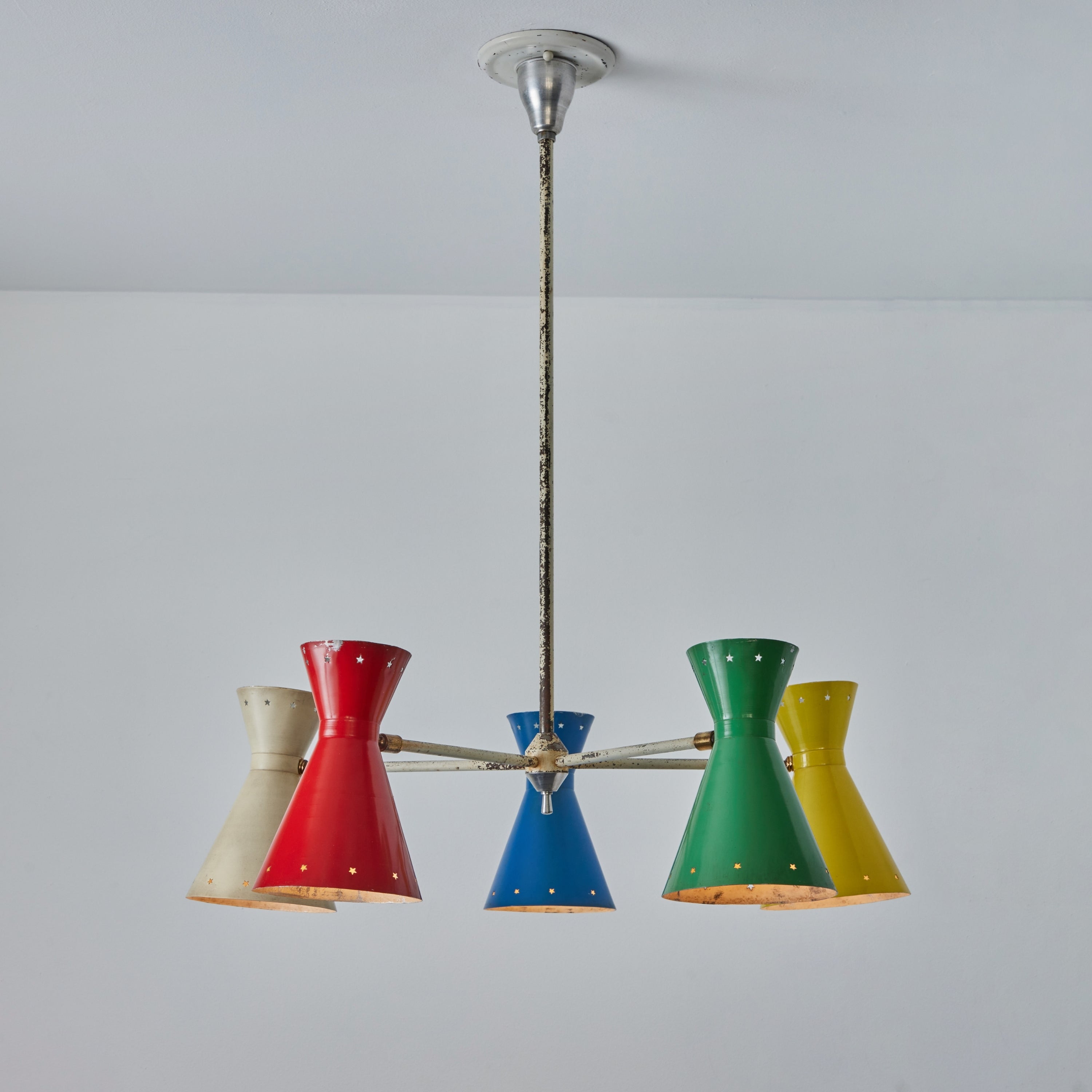 Executed in multi color original painted metal diabolo shades with star perforations. Beautiful vintage patina on the stem and shades. A bright and sculptural chandelier highly indicative of the iconic mid-century Italian designs of Stilnovo and their influence on the work of Robert Mathieu and French lighting.