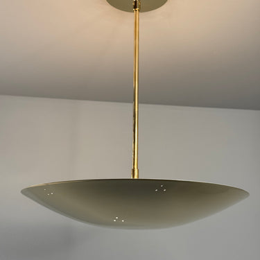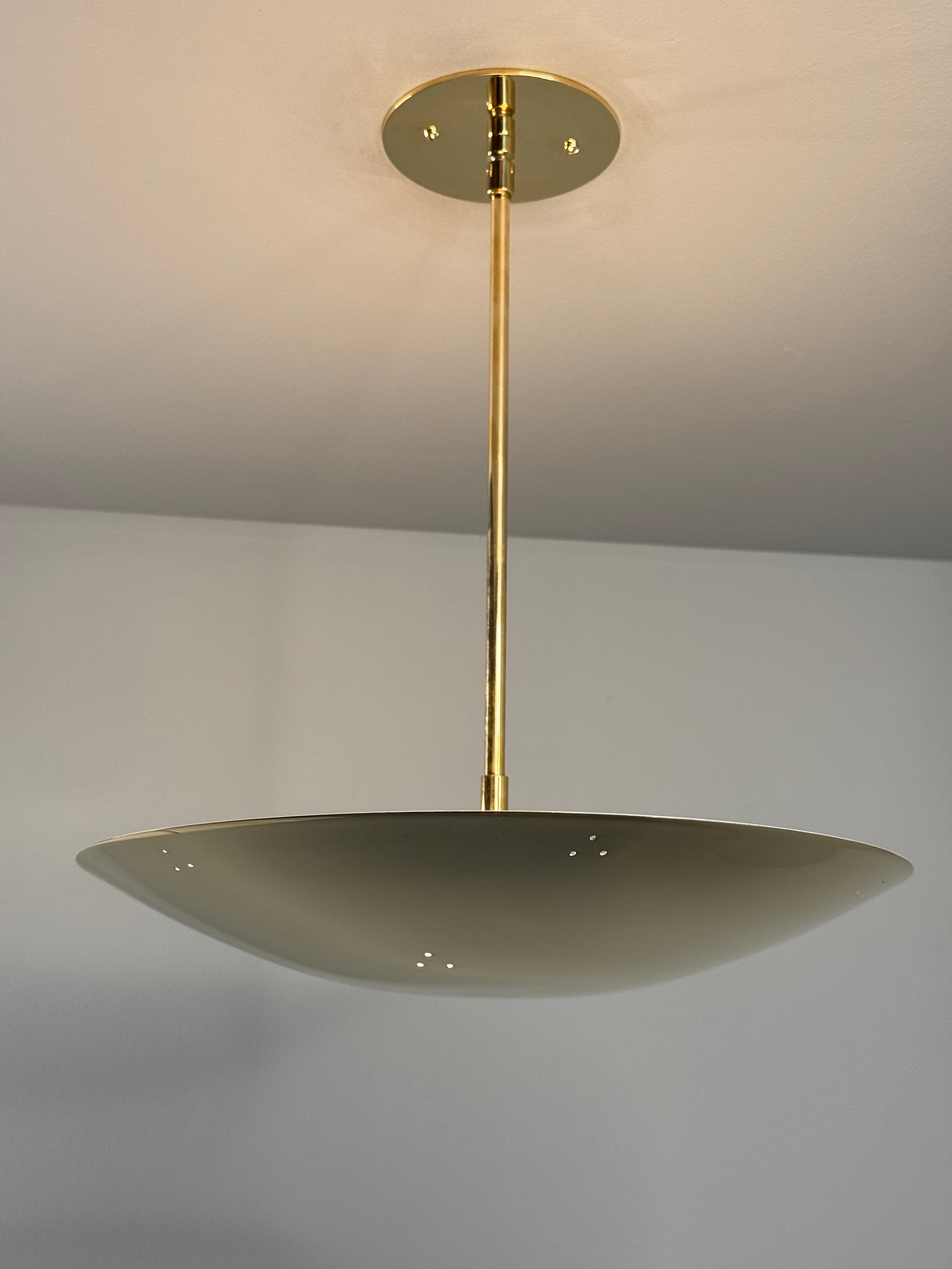 Hand-fabricated in Los Angeles, these highly refined chandeliers are reminiscent of the iconic Mid-Century Finnish designs of Paavo Tynell and Lisa Johansson Pape. Executed in perforated brass with a finish in choice of polished brass, patinated brass, painted white, or painted black. Polished and painted variants ship with a polished brass canopy and stem; patinated brass variant ships with matching patinated canopy and stem.