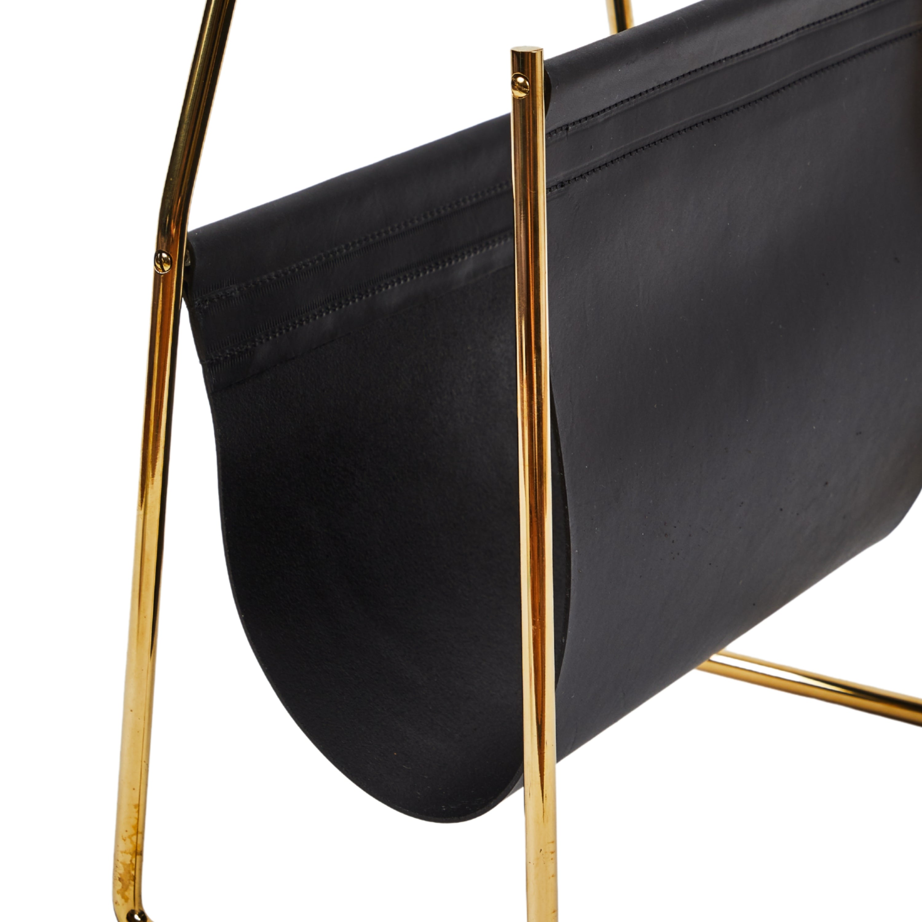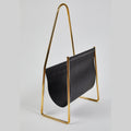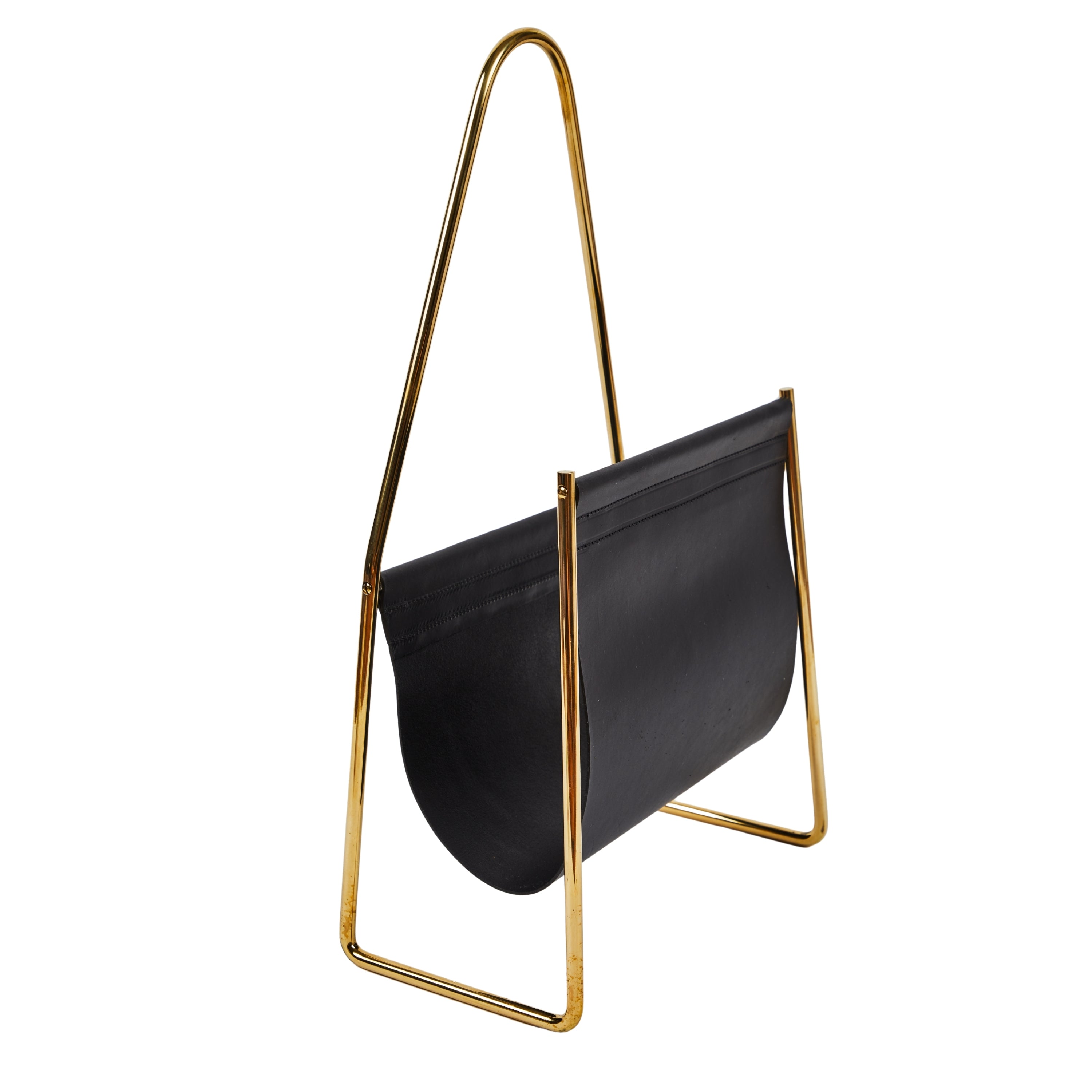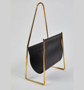 This incredibly refined and sculptural magazine rack originally designed in the 1950s is executed in beautifully grained black or brown leather and polished brass.