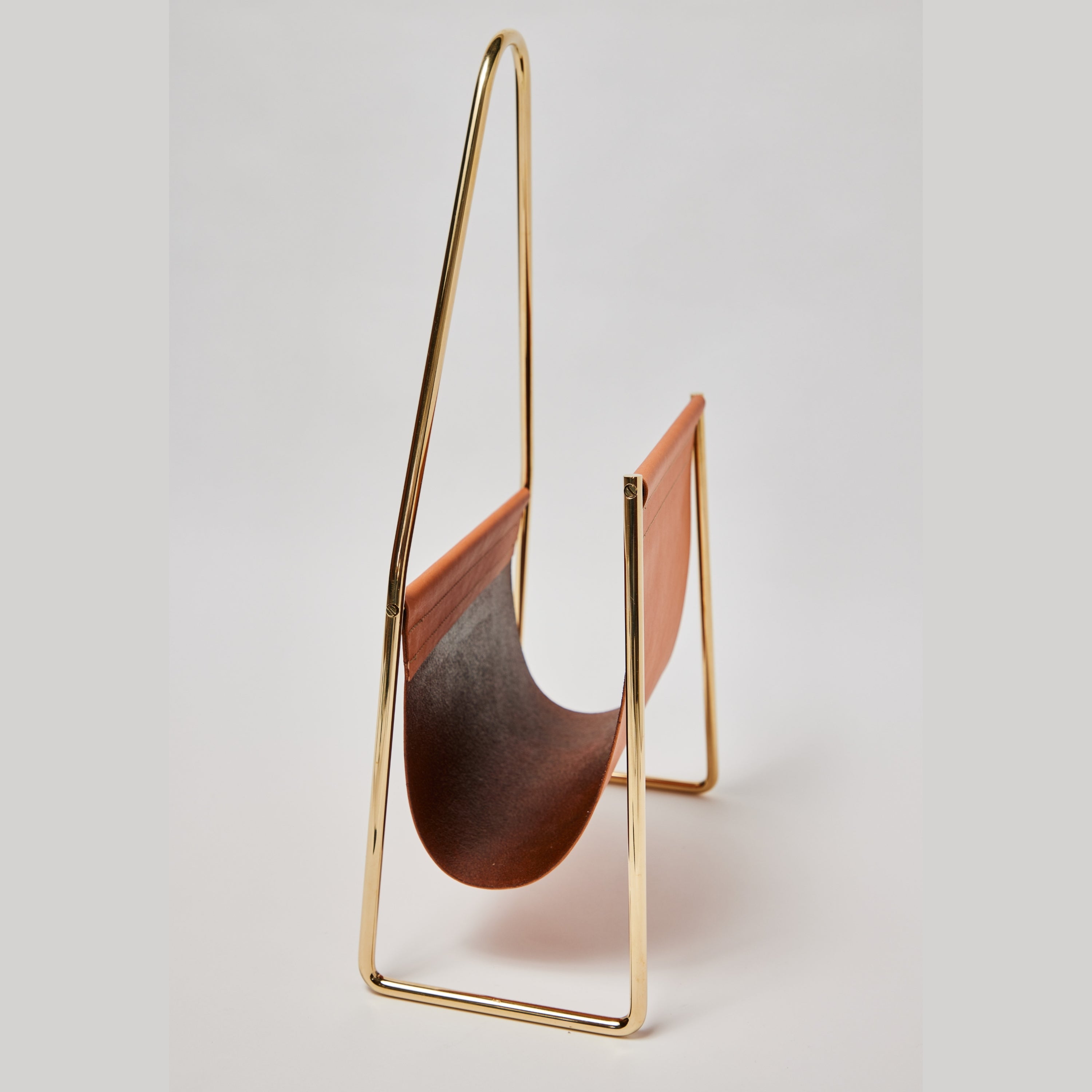 Carl Auböck model #3808 leather and brass magazine rack.