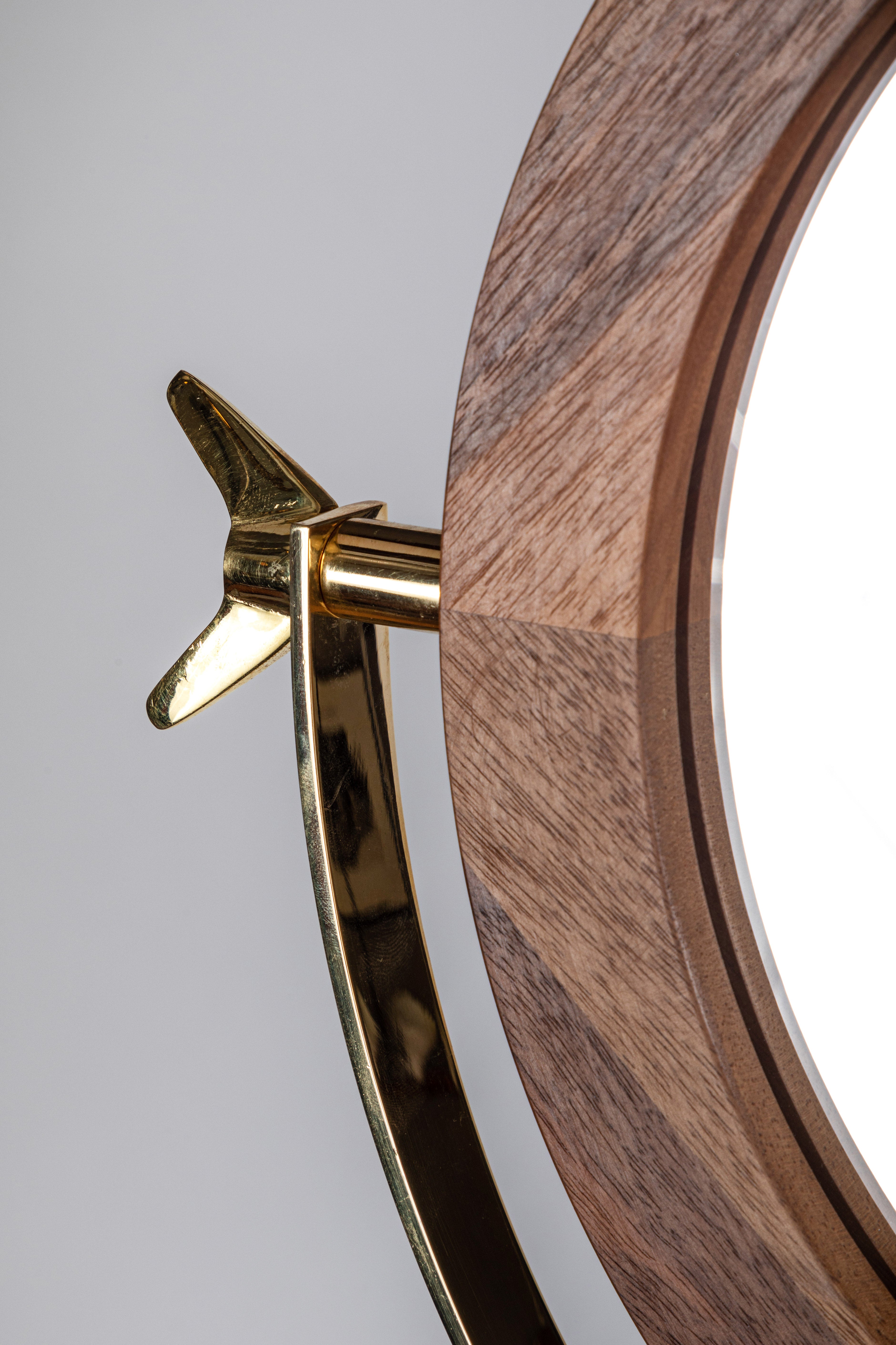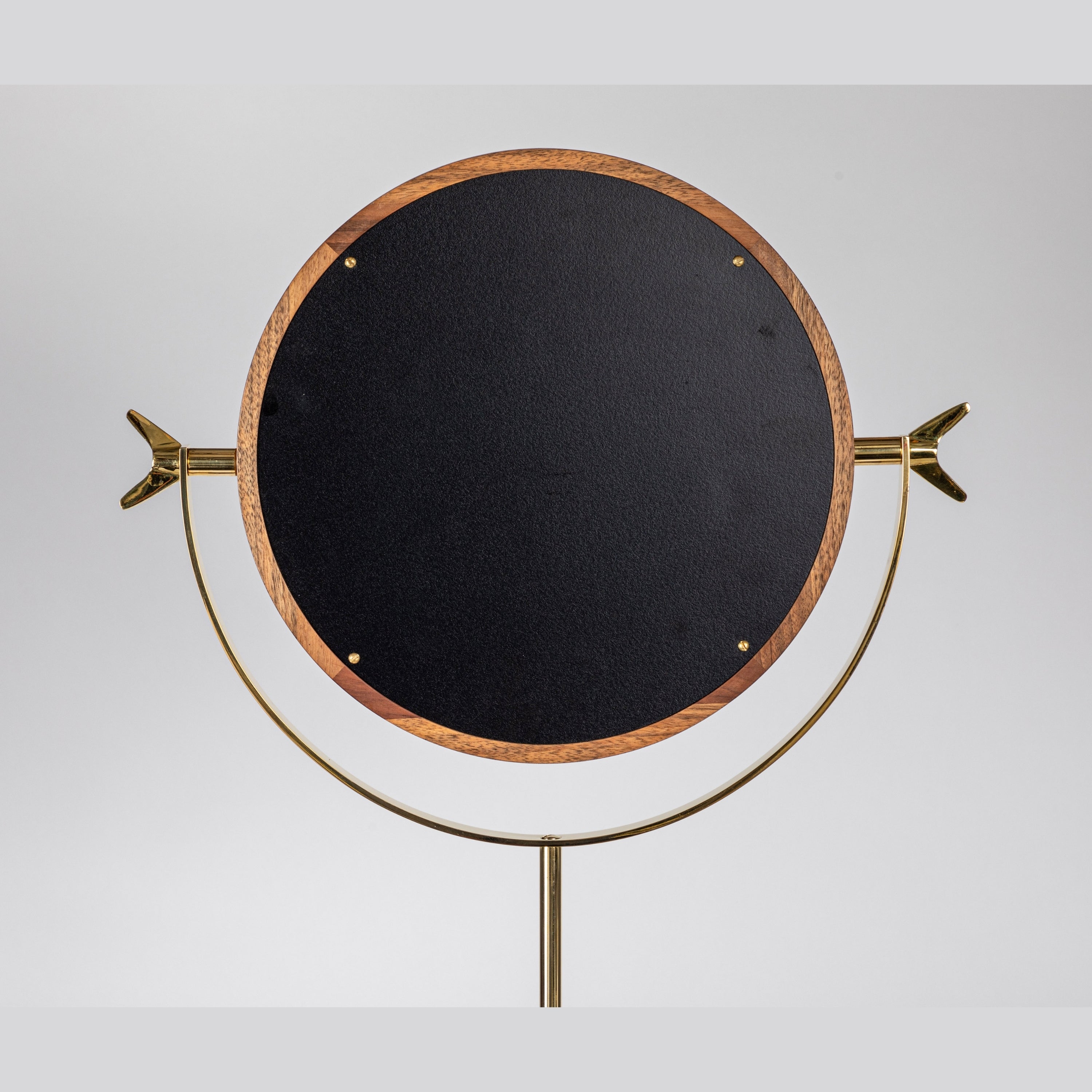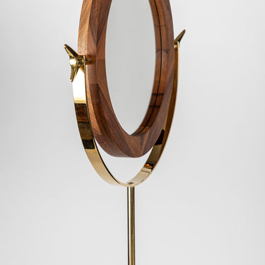 Designed in the 1950s, this incredibly refined and sculptural free-standing mirror is executed in beautifully grained walnut, polished brass with a heavy cast iron base. Stamped "Auböck" on the wing screws that all the mirror to pivot up and down.