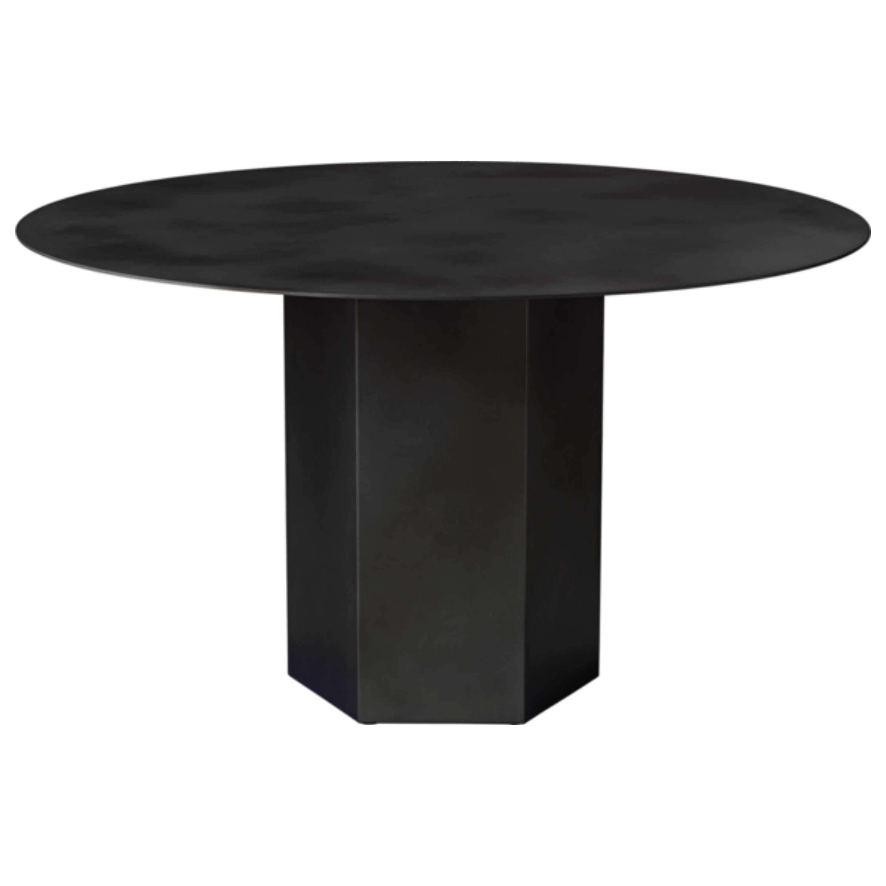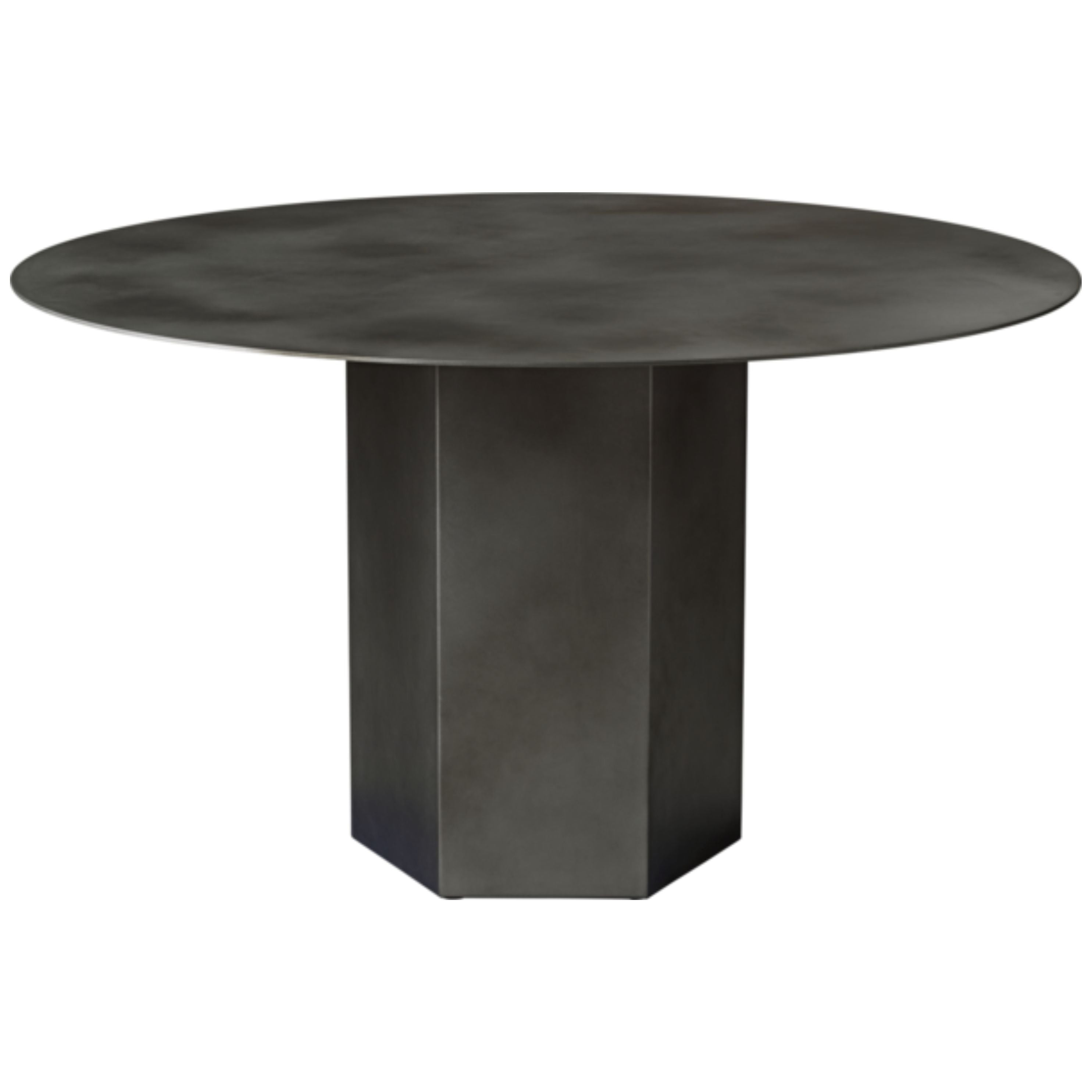 Designed by Danish-Italian duo GamFratesi, the Steel 'Epic' Table series for GUBI is executed in solid steel. The metal is galvanized, lacquered, and hand-finished to create a contemporary take on classical architectural elements. The hexagonal base and a circular top combine to create a striking sculptural piece that carries a subtle reference to the iconic columns of Ancient Greece.