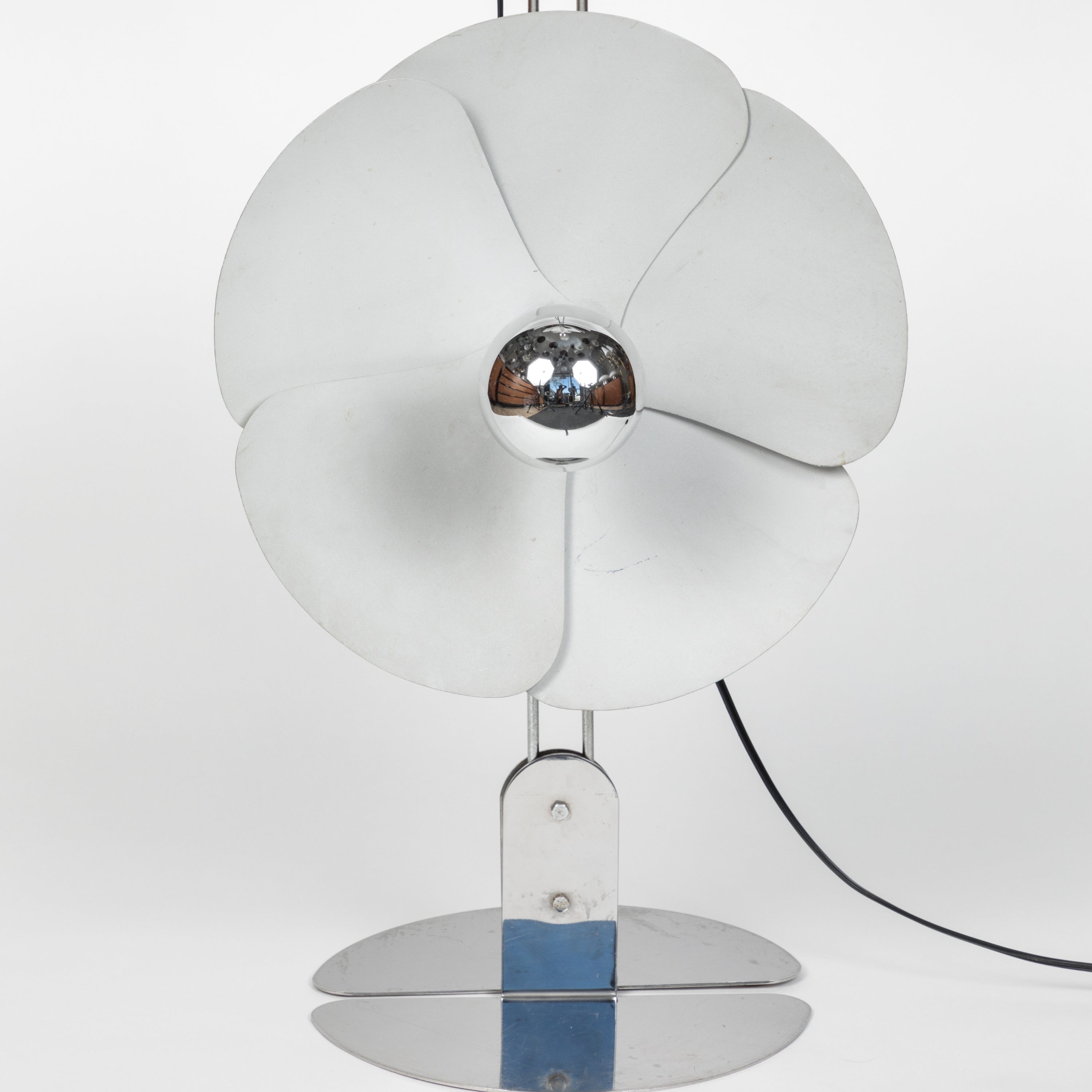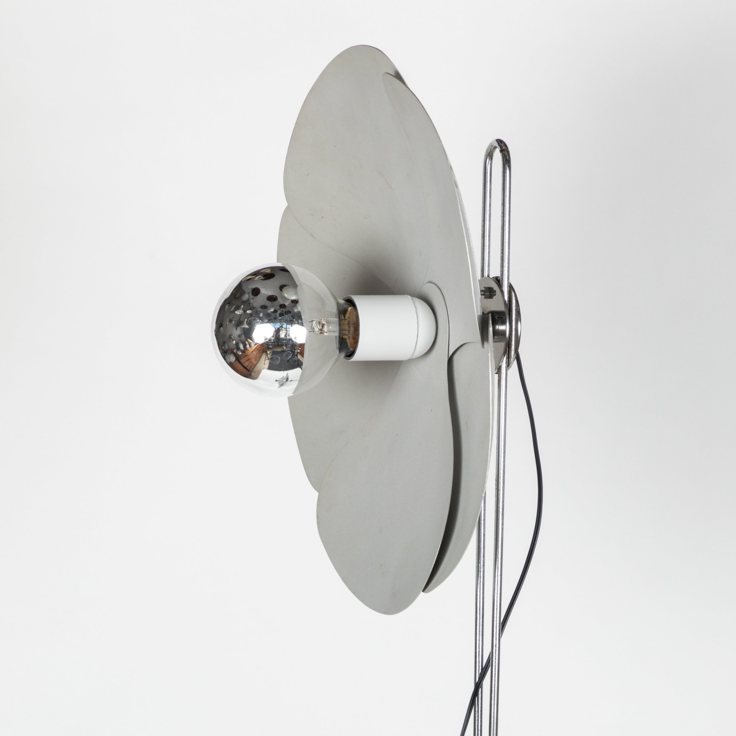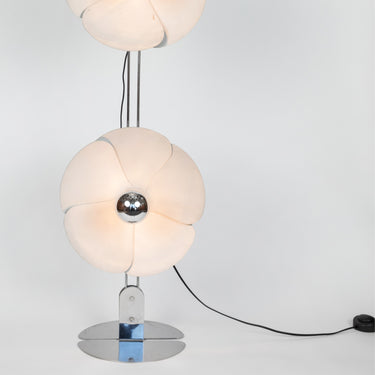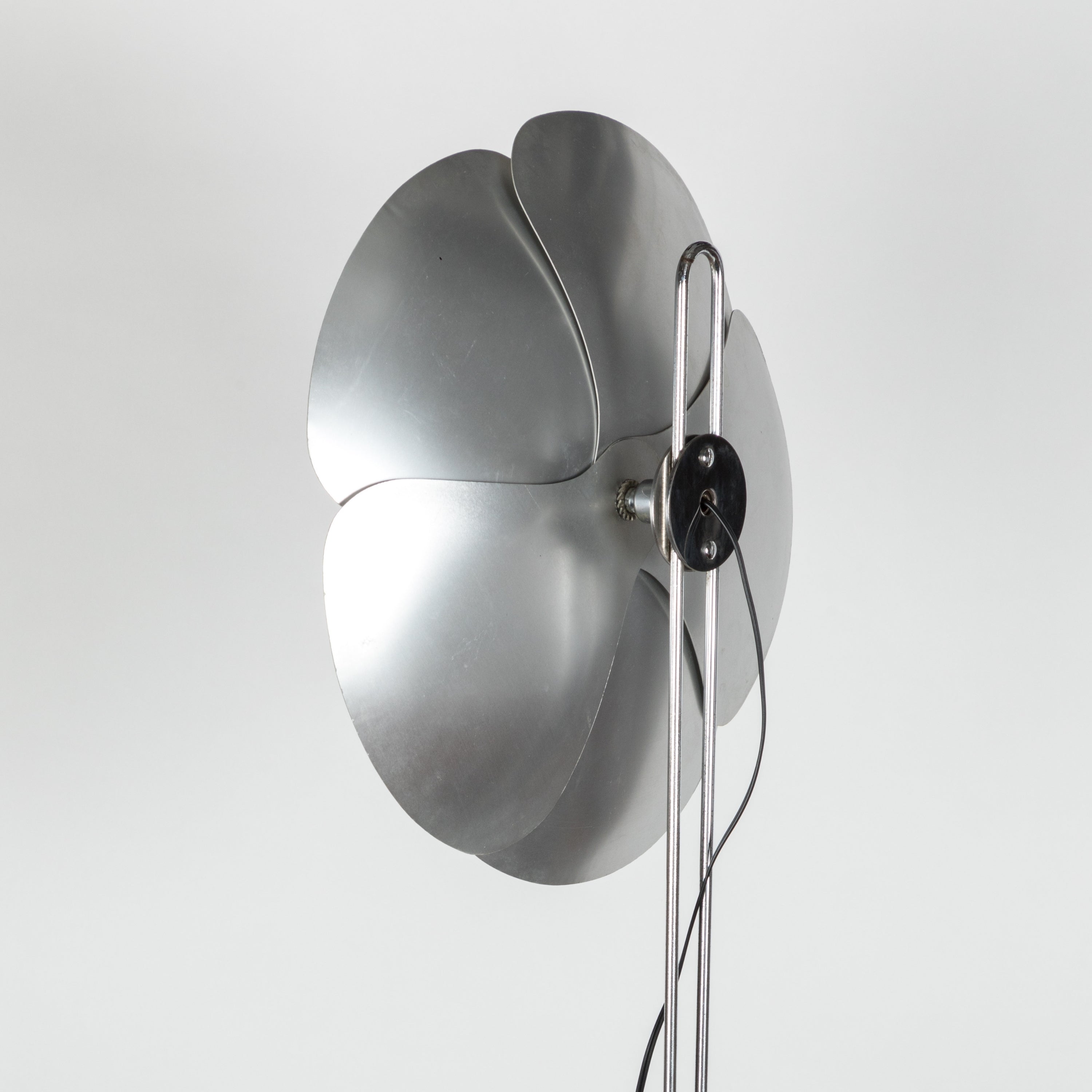 In 1967, Olivier Mourgue designed a flower-shaped light, made of aluminum petals fixed on two chromed metal wires. The line included sconces, ceiling lights, and floor lamps. Mourgue's use of the silver-capped bulb, which was new at the time, produces a soft diffusion of the light across the petals.