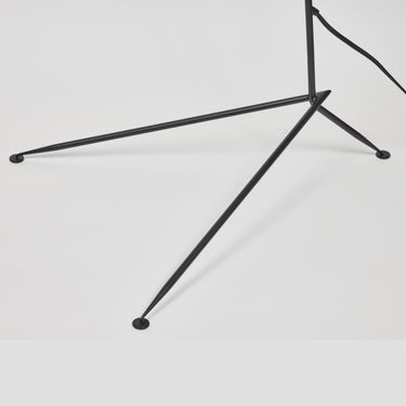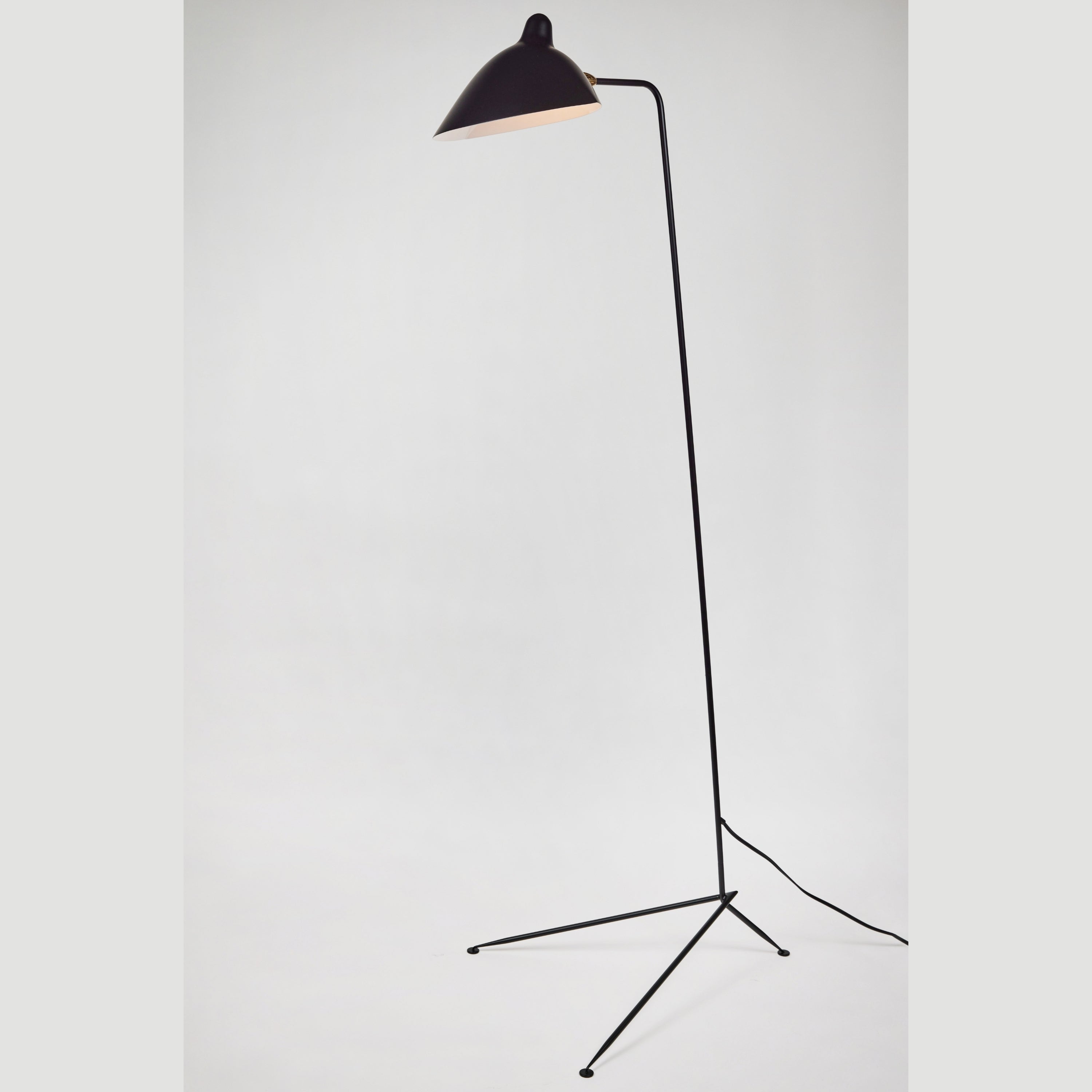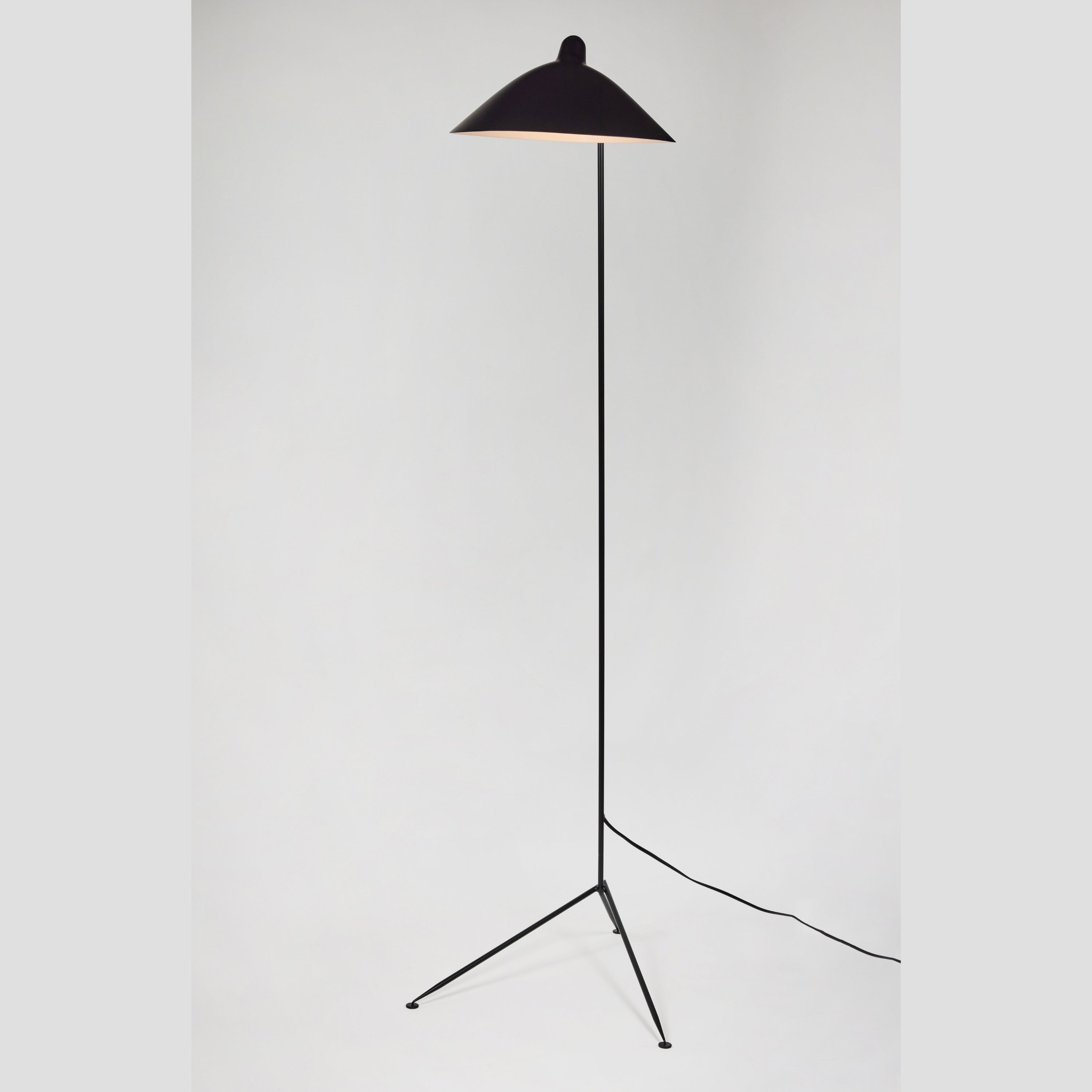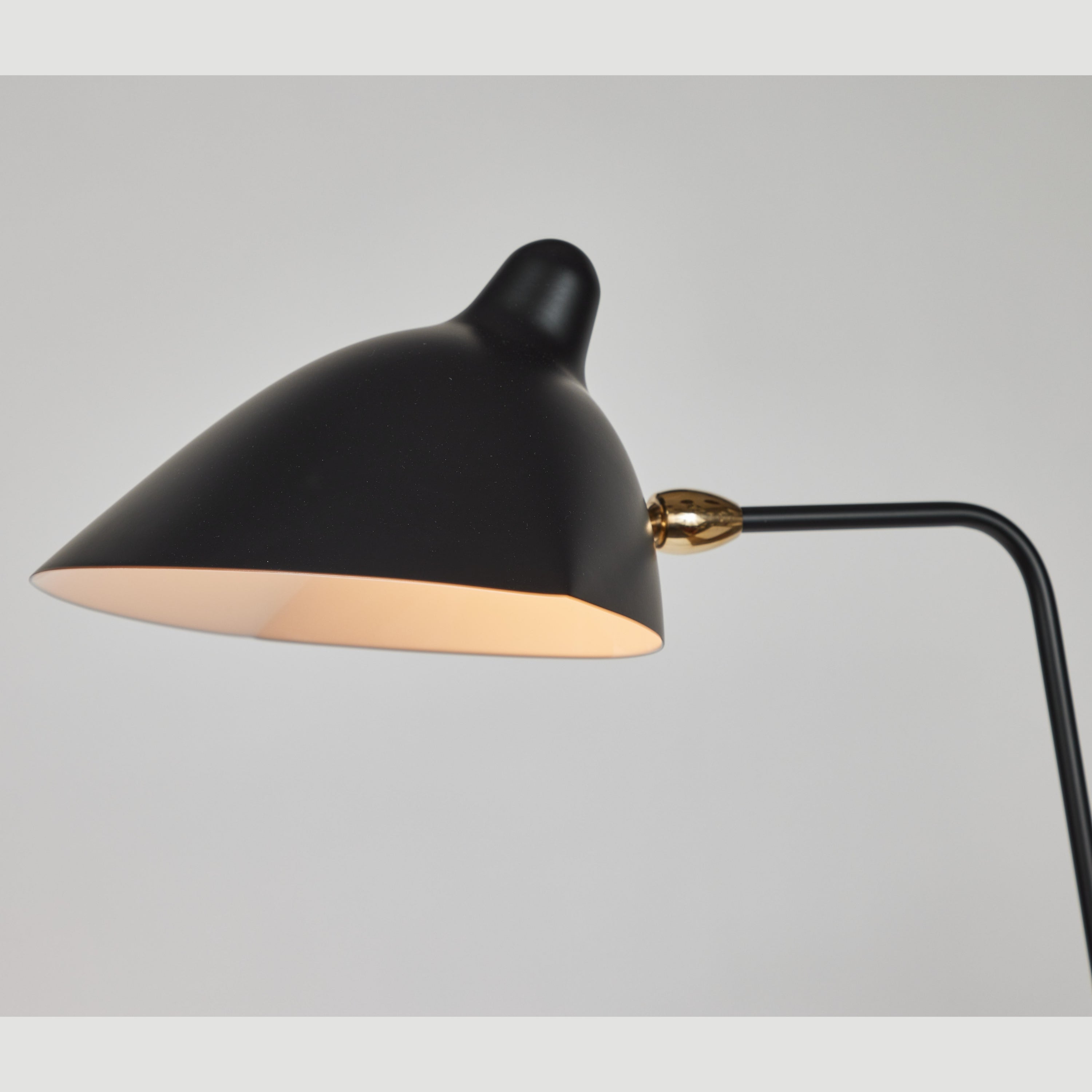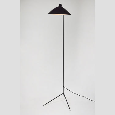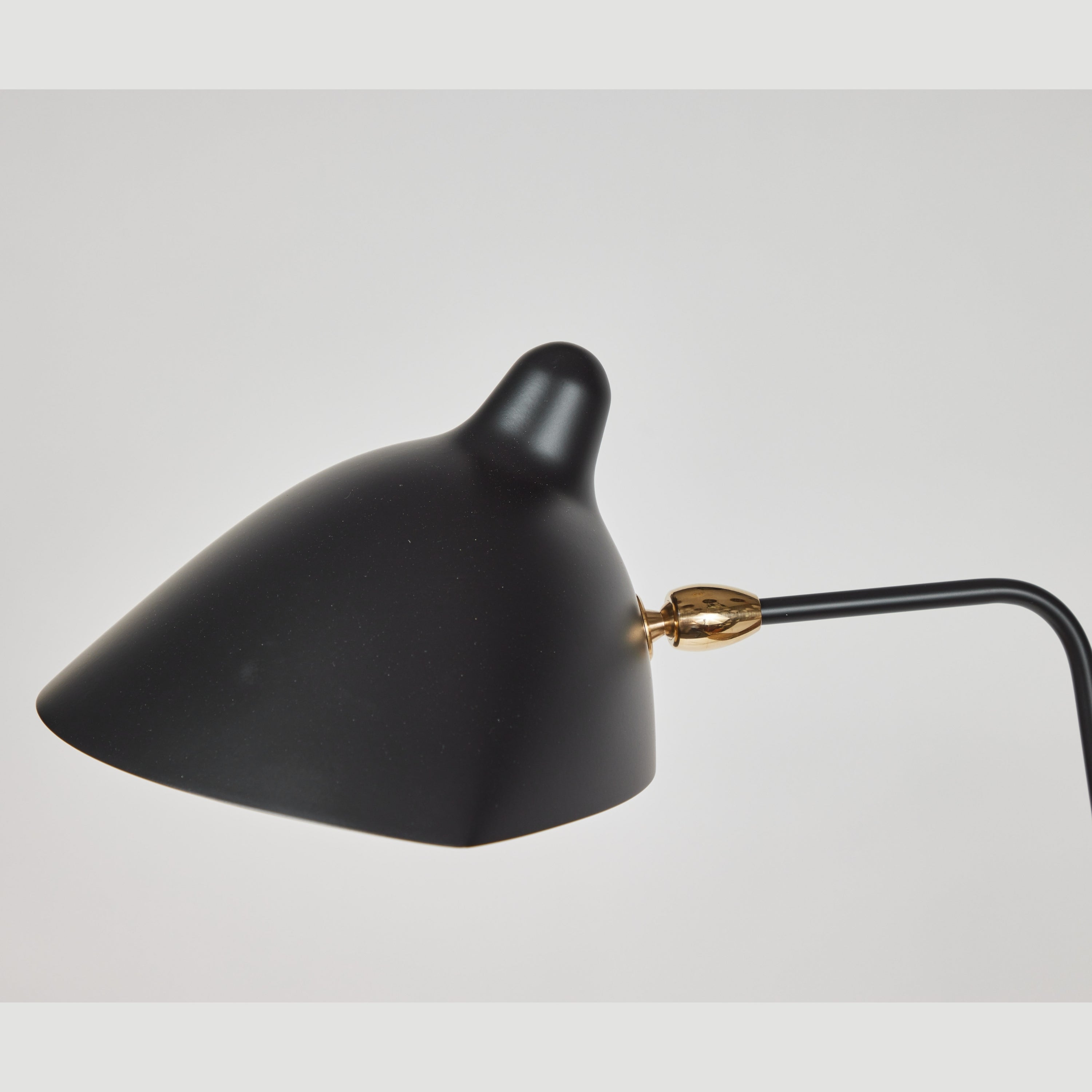 Originally designed in 1953, this iconic lamp is still made by Editions Serge Mouille in France using many of the same small-scale manufacturing techniques and scrupulous attention to detail, materials and craftsmanship. Executed in a tripod base with an elegant black or white steel arm topped with black or white painted aluminum shade and brass swivel for shade adjustability. Includes “Certificate of Authenticity” and engraved serial number.