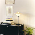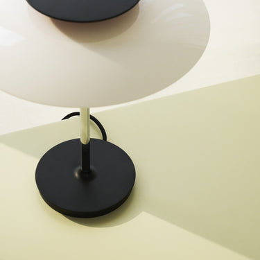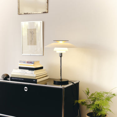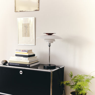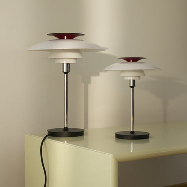 The 'PH 80' Table Lamp is executed with white opal acrylic shades which provide attractively diffused ambient light, and a top reflector in red polycarbonate for the chrome plated version, black polycarbonate for the black variant, or white polycarbonate for the white variant. The variant with the red reflector features a high luster chrome plated stem and textured black base. The all-white variant features a powder coated steel stem with a smooth finish.