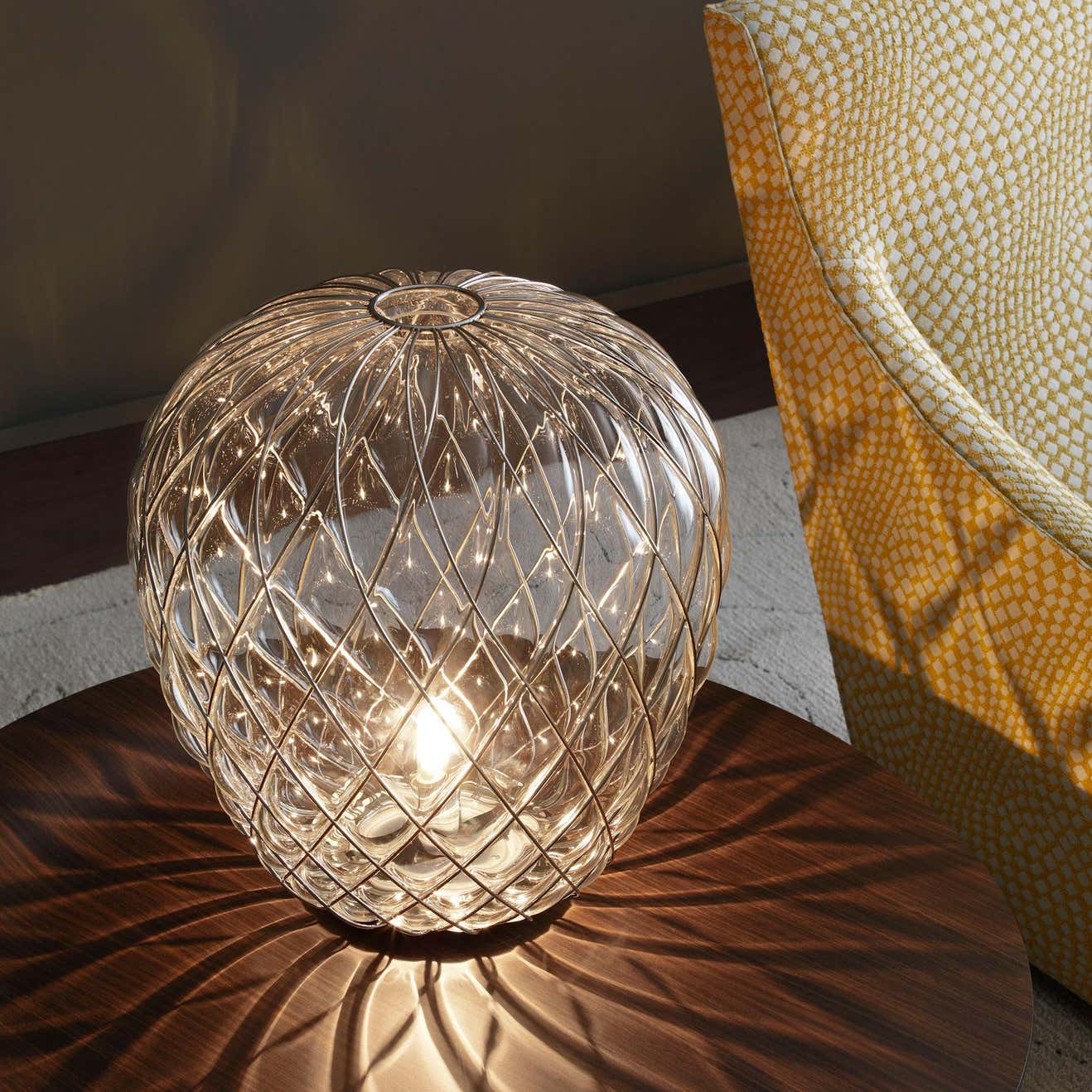 Designed by Paola Navone, the diffuser is expertly handcrafted using the ancient caged-blown glass technique. Here, the glassmaker blows the molten glass into a metal cage, which only partly contains the glass's natural expansion. The transparent version reveals a two-fold structure that multiplies the scenic effect, while the metal cage pattern projects kaleidoscopic shade effects on the surrounding surfaces. The opaline version's glass envelops the cage surface and enhances its geometric pattern, generating an elegant and visually pleasing diffuse light. A striking presence whether lit or unlit.