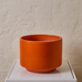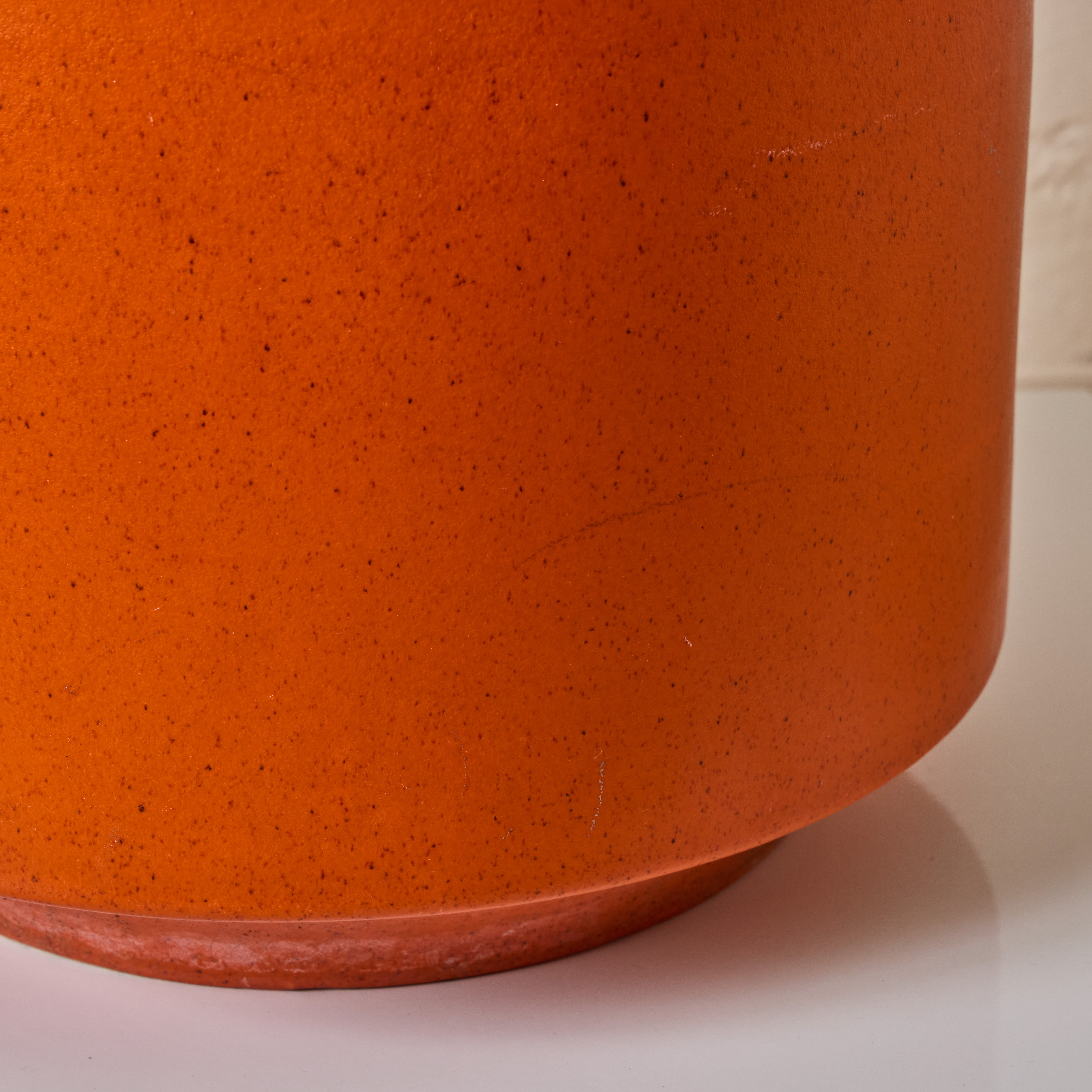 Executed in matte orange glazed ceramic. A very clean and increasingly rare example attributed to iconic ceramics manufacturer Gainey Ceramics, circa 1960s. Drilled, structurally sound and highly presentable. Retains original manufacturer's signature on the underside of the planter.