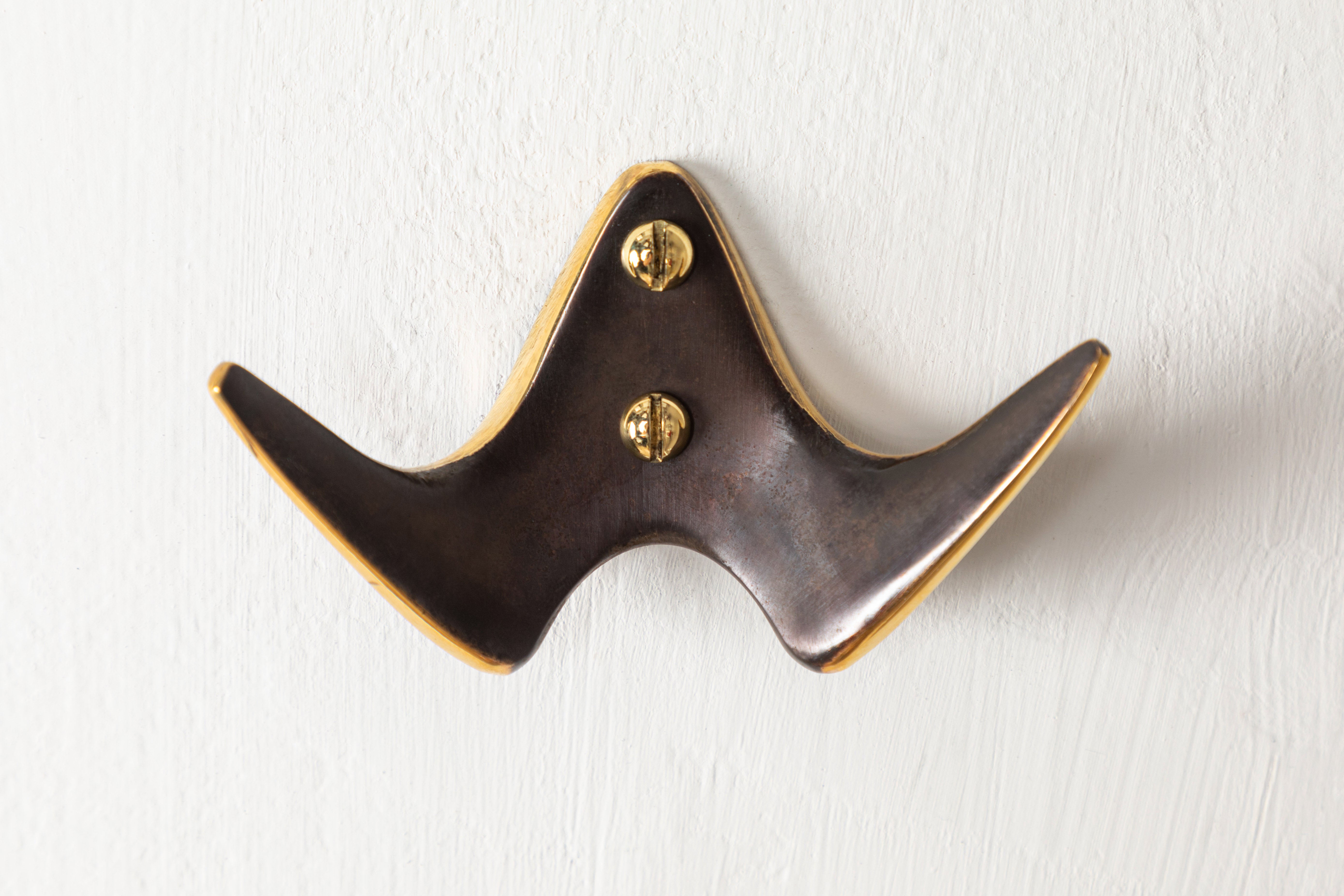 Designed in the 1950s, this versatile and minimalist midcentury wall hook is executed in choice of polished brass, patinated brass, or brushed nickel by Werkstätte Carl Auböck, Austria. Each piece bears the "Auböck" stamp on the back. Screws included. Ideal for bathrooms, hallways, or entryways that need beautiful hardware for keys, hats, coats, or towels.