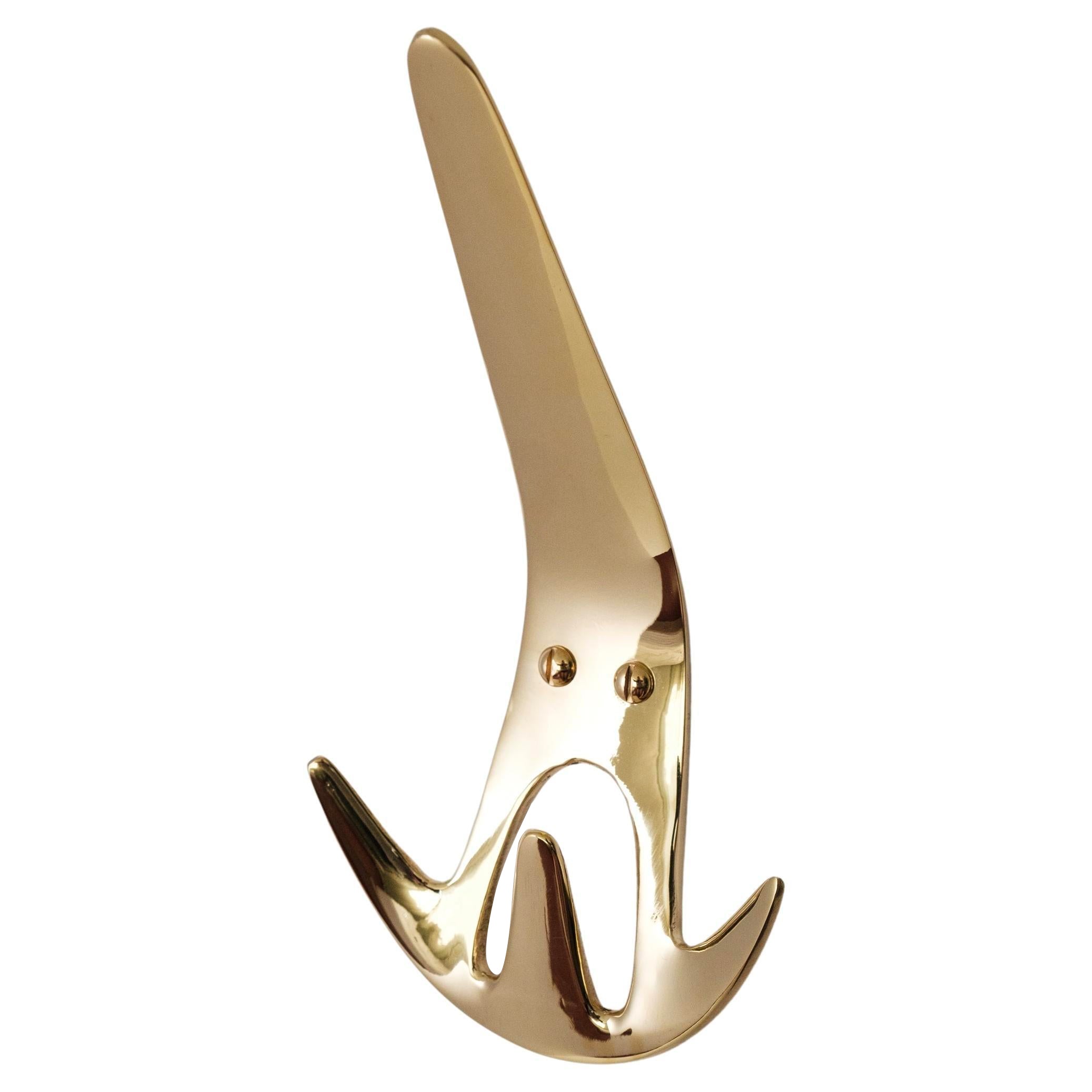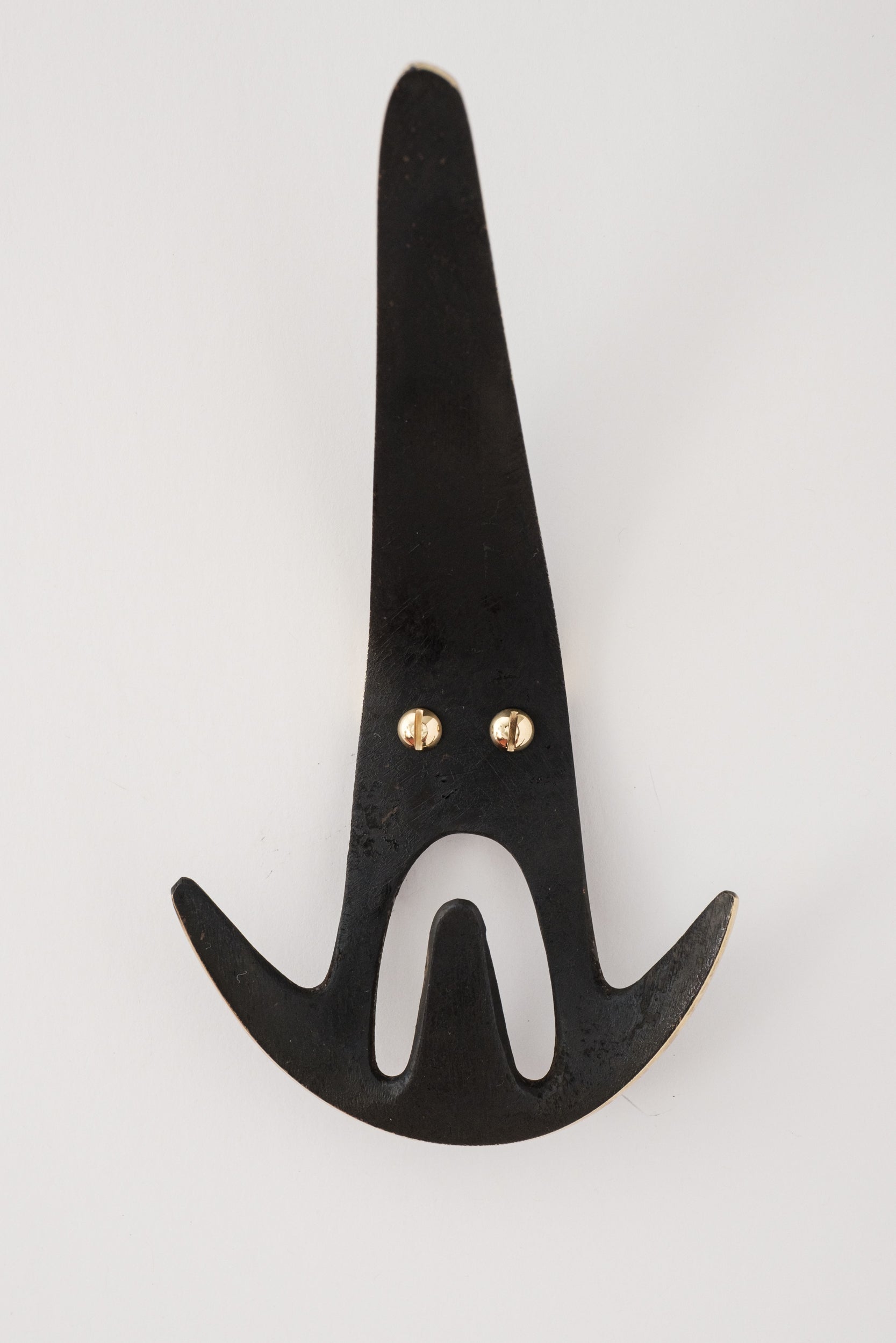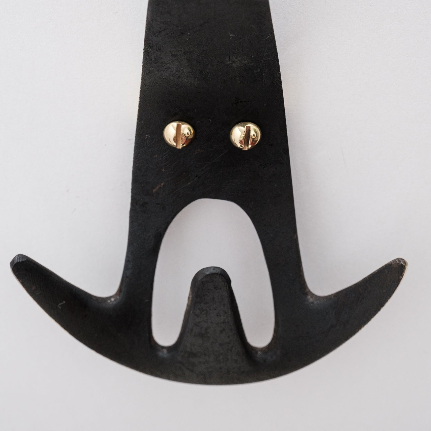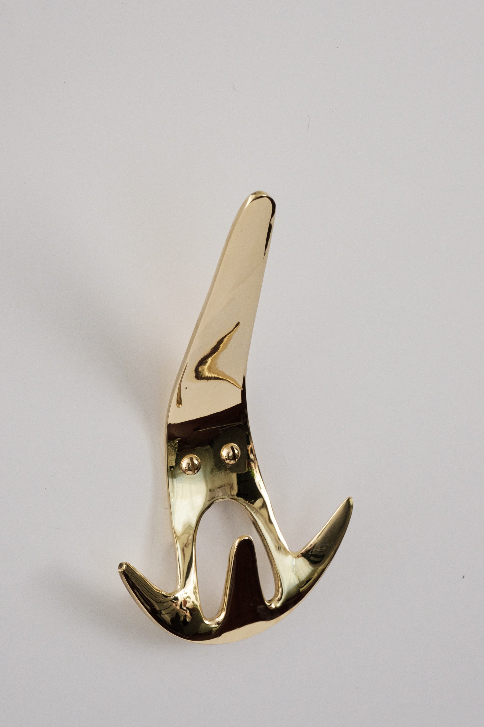 Designed in the 1950s, this versatile and minimalist Viennese hook is executed in patinated or polished brass by Werkstätte Carl Auböck, Austria. Each piece is stamped "Auböck." Screws included.