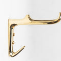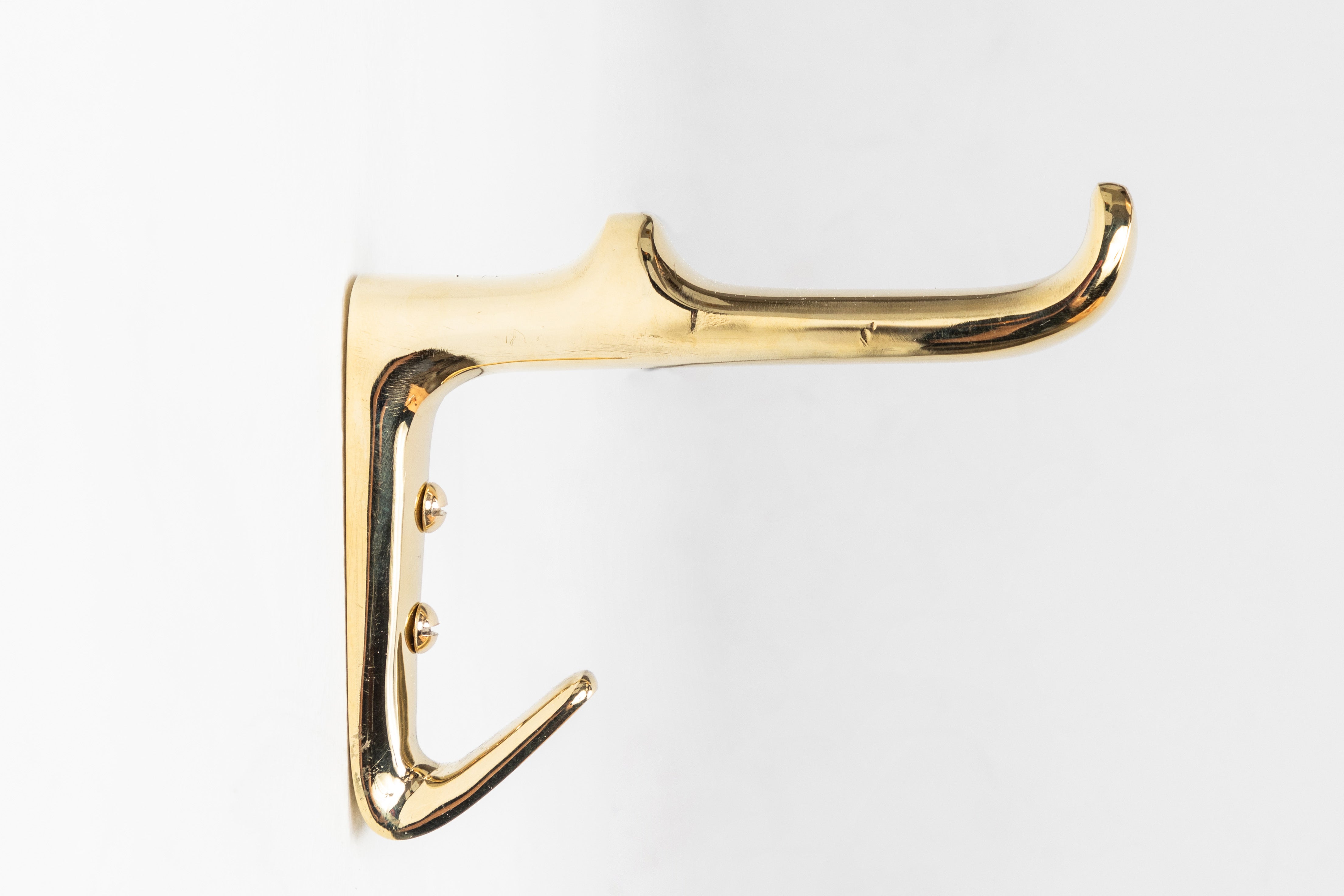 Designed in the 1950s, this versatile and Minimalist Viennese hook is executed in choice of nickel, darkly patinated or polished brass by Werkstätte Carl Auböck. This substantial hook extends at a right angle from the wall and allows for multiple handbags, towels, or various items to be hung in powder rooms, entryways, closets, and more.