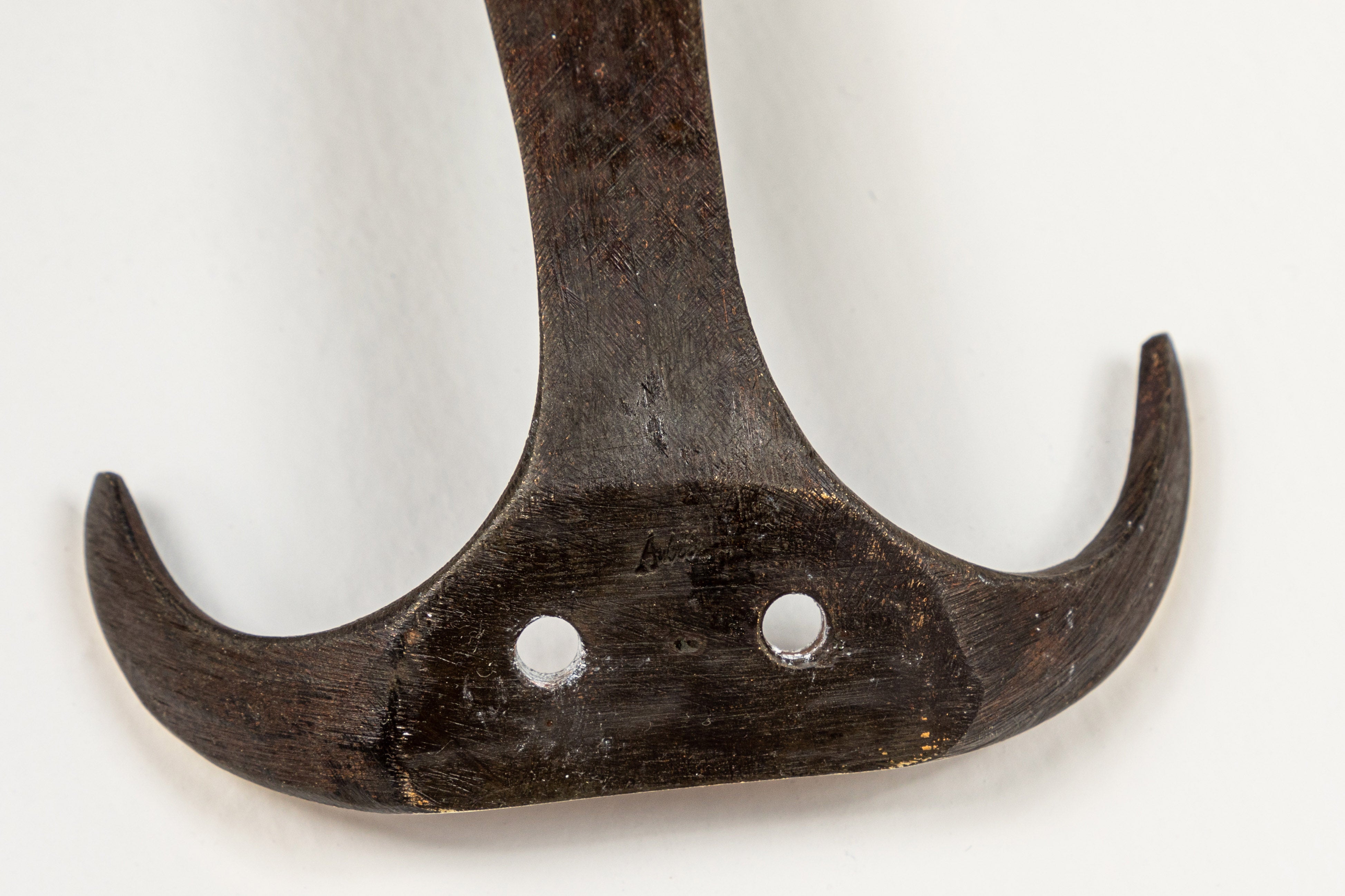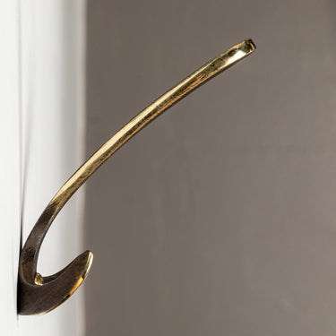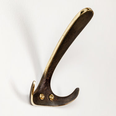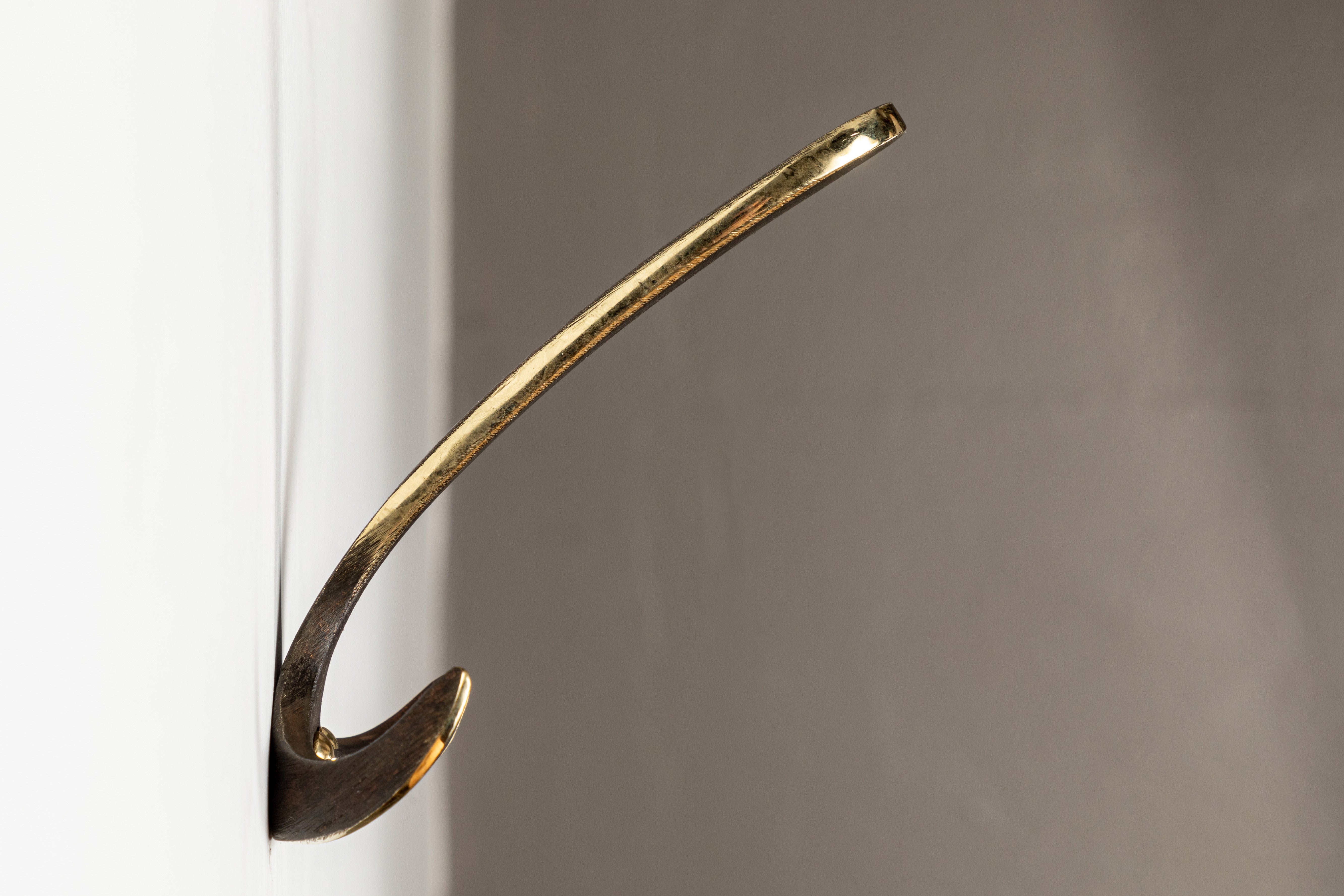 Designed in the 1950s, this versatile and minimalist midcentury Viennese hook is executed in choice of brushed nickel, patinated brass or polished brass by Werkstätte Carl Auböck, Austria. Each piece bears the workshop's "Auböck" stamp.