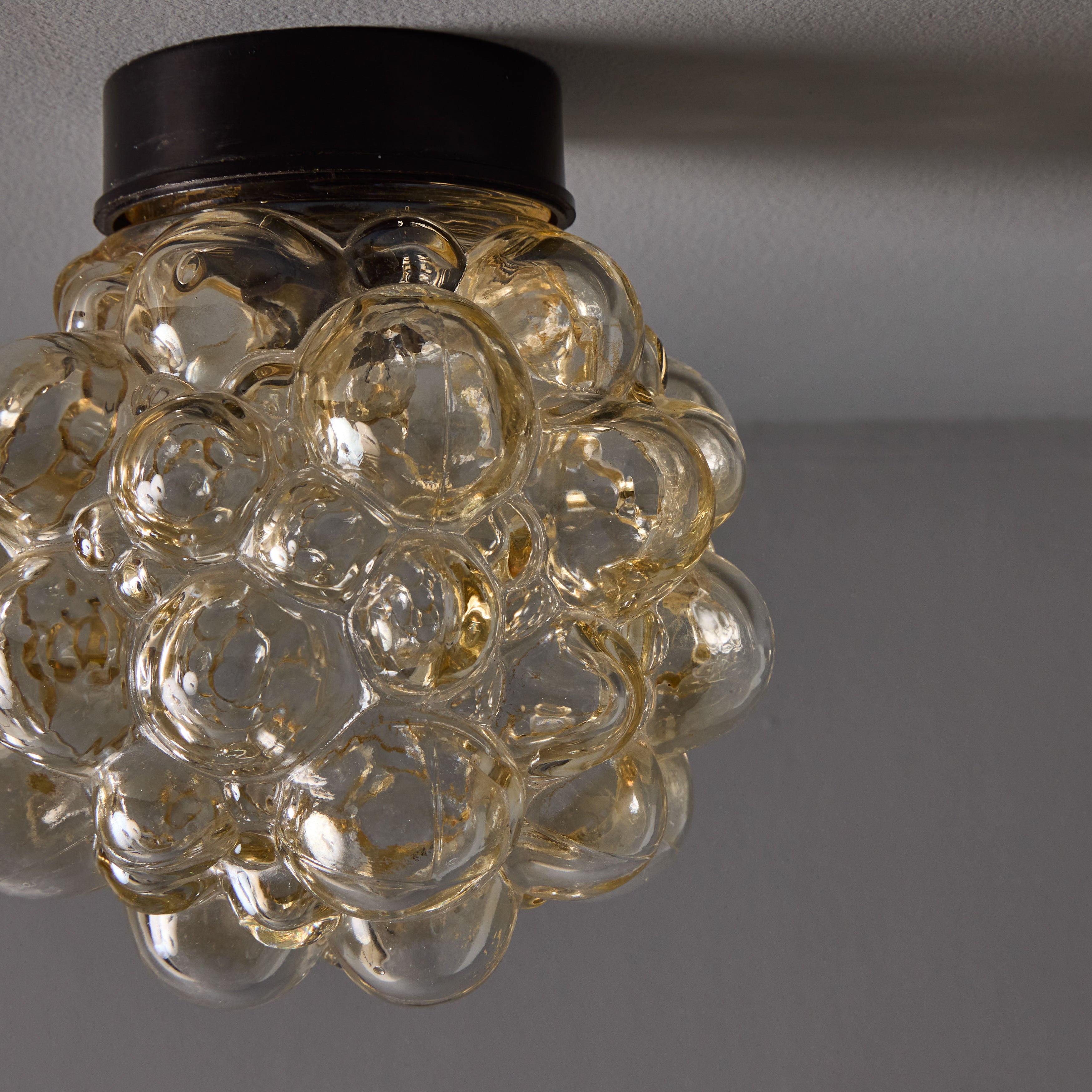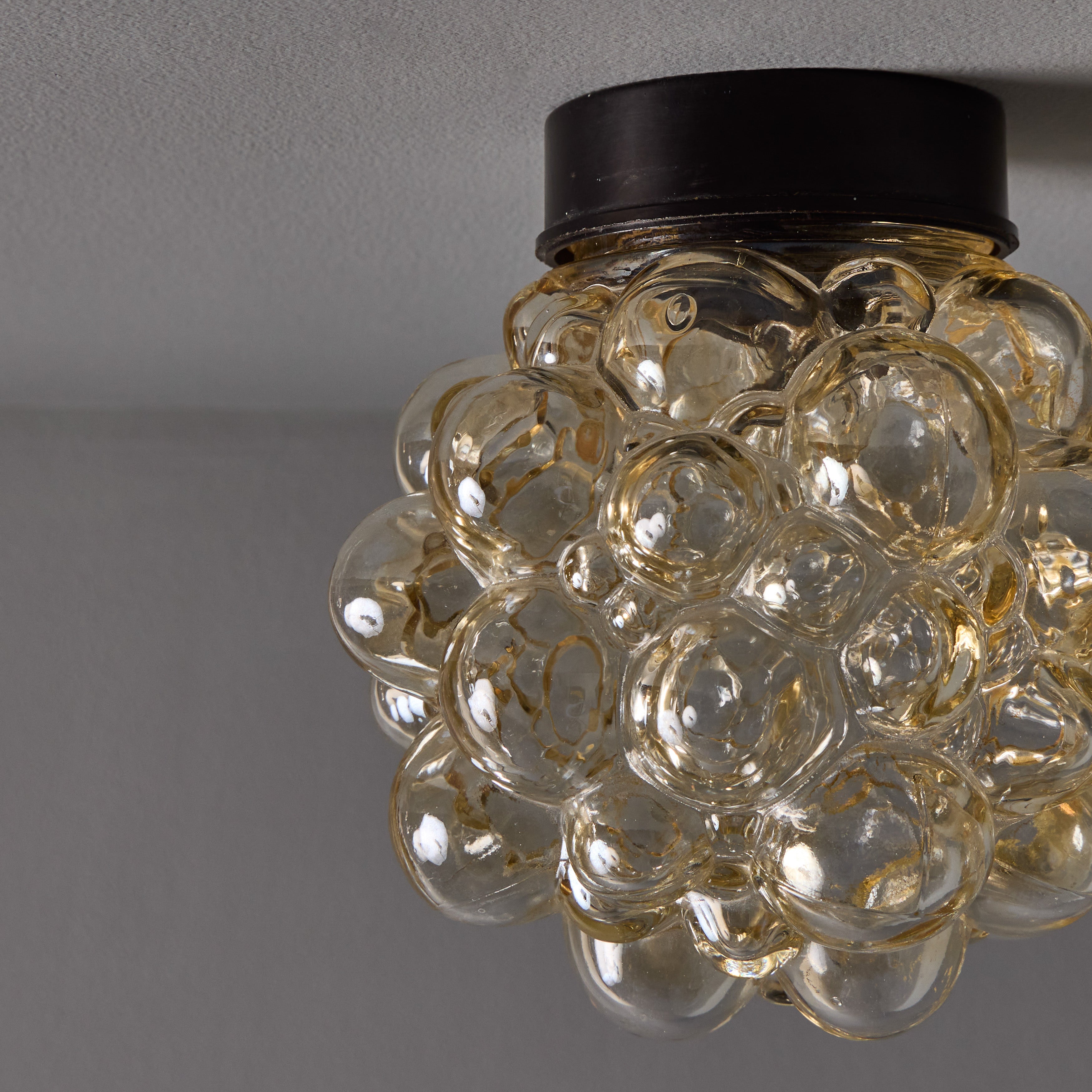 Executed in thick and heavy textured light amber bubble glass and original black plastic mount. Can be mounted on the ceiling or used as a wall lamp. Fabricated in Limburg, Germany circa 1960s. A contemporary of Paavo Tynell, the refined work of Helena Tynell has become increasingly valued by discerning collectors.