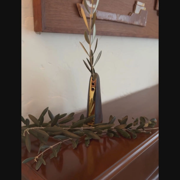 Designed in the 1950s, this incredibly refined and sculptural vase features three holes for dried flowers. Executed in the trademark patinated brass, with a polished accent side.