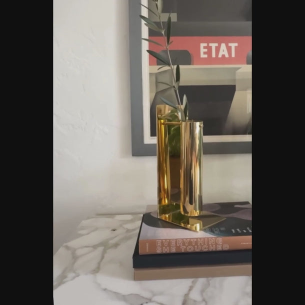 Designed in the 1950s, this incredibly refined and modern vase is executed in polished brass by Werkstätte Carl Auböck, Austria. The vase gently "swings" on a rod that extends from the L-shaped frame. Vase diameter is 3.14 inches. Each piece is stamped "Auböck."