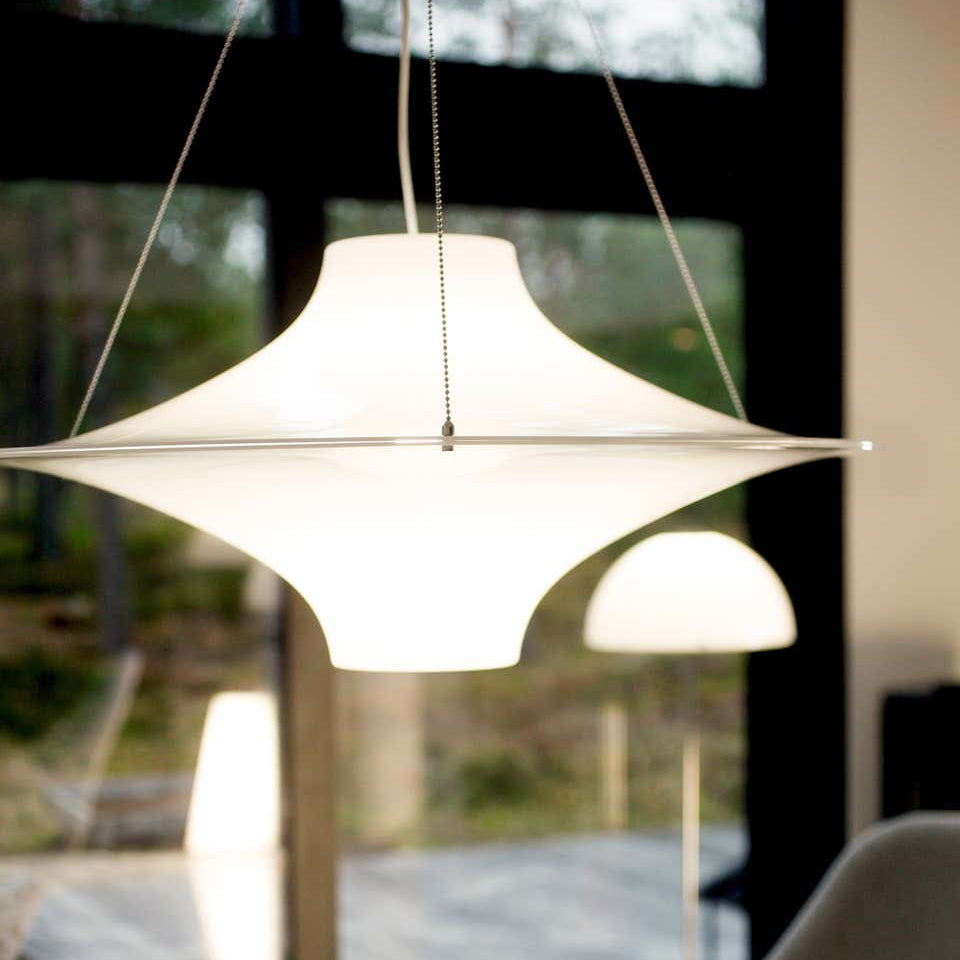 Designed in 1960, Nummi's innovative 'Lokki' is one of the best-known Finnish design classics. The name Lokki comes from the Finnish word for seagull. As Nummi once astutely observed, "People don’t buy lamps, they buy light”. This pendant lamp in opaline perspex casts filtered glare-free light that defines any space. Ideal for dining rooms or areas in need of soft overhead lighting. This authorized re-edition is made in Finland with the highest quality materials by Innolux Oy.