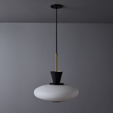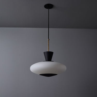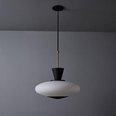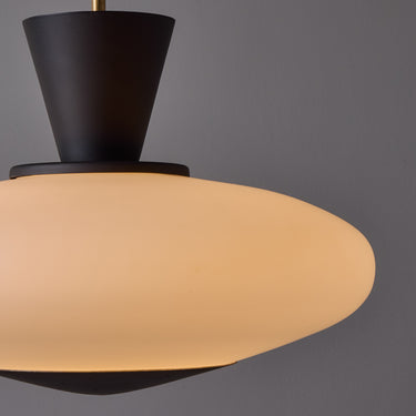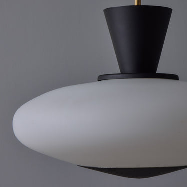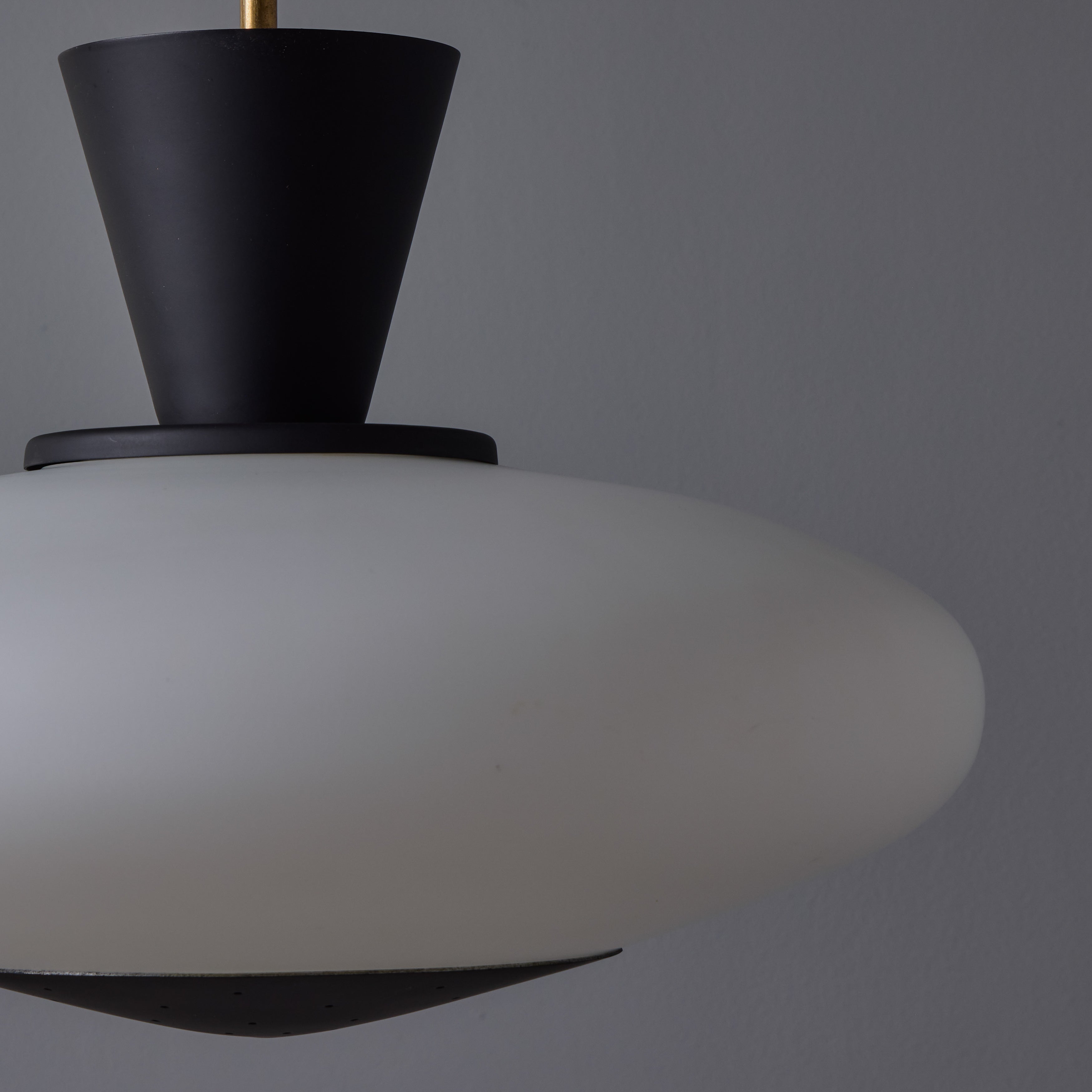 Executed in sculptural oval opaline glass with metal hardware. Perforated black metal accent piece on the bottom of the glass. A ceiling light of attractive scale and incomparable refinement. Unmarked.