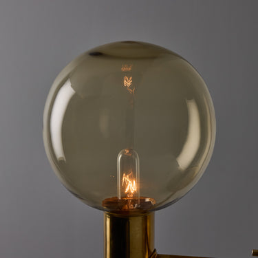 An incredibly refined vintage design that is quintessentially Swedish. Executed in sculpturally bent brass and blown round smoked glass shades that give off a soft glow when lit. Retains original AB Markaryd label on base.