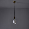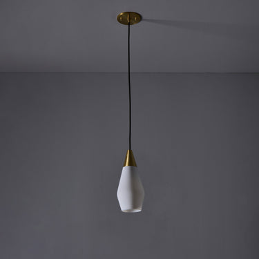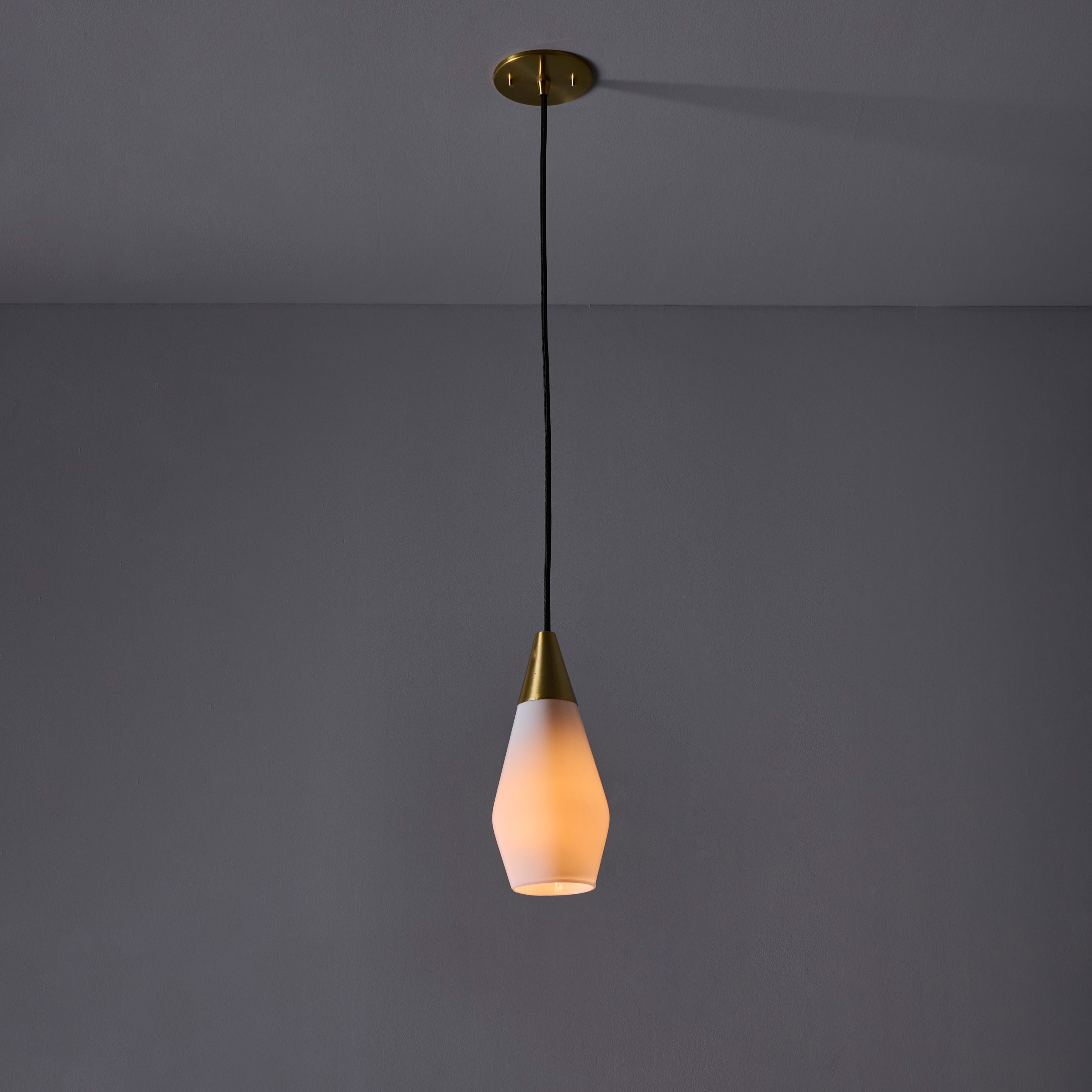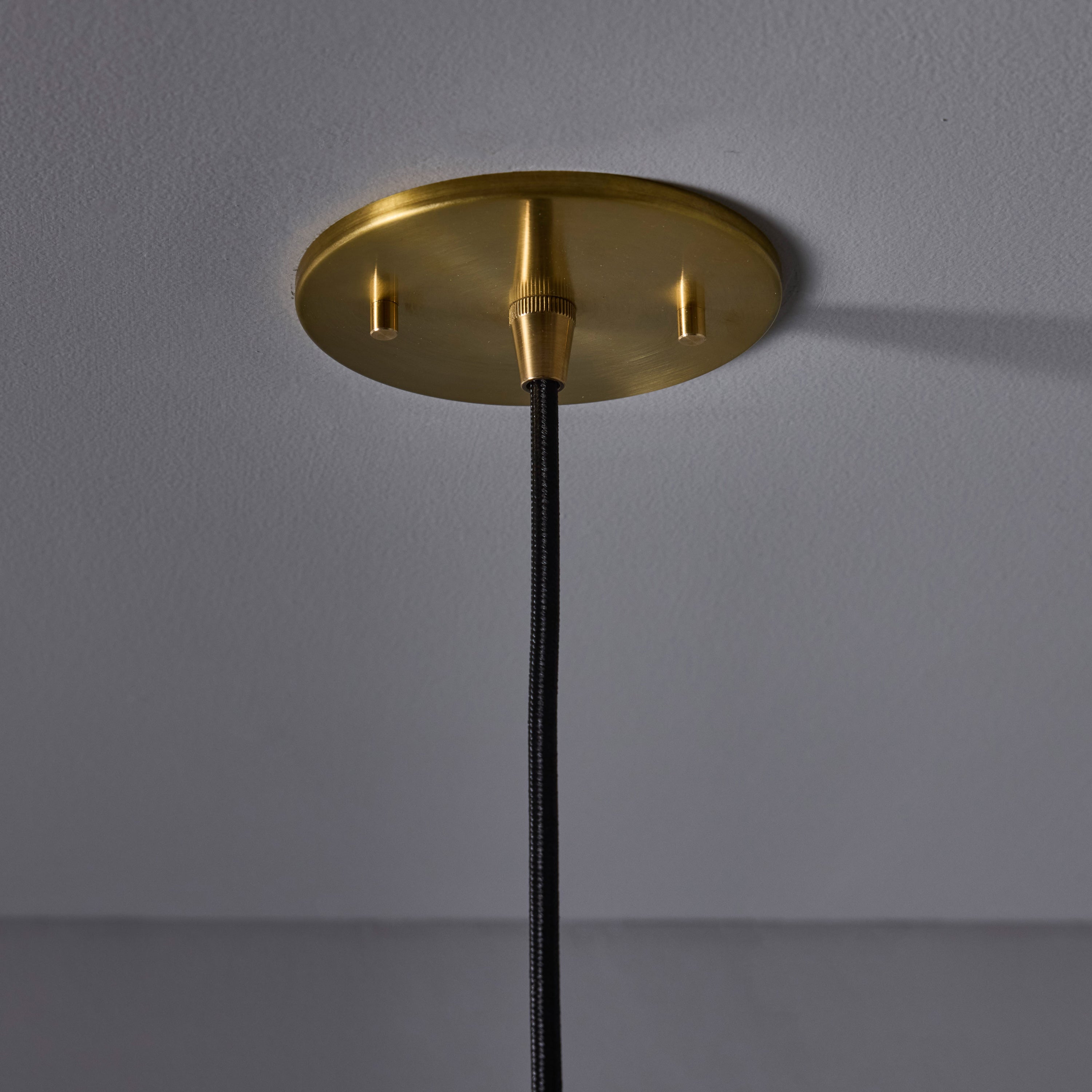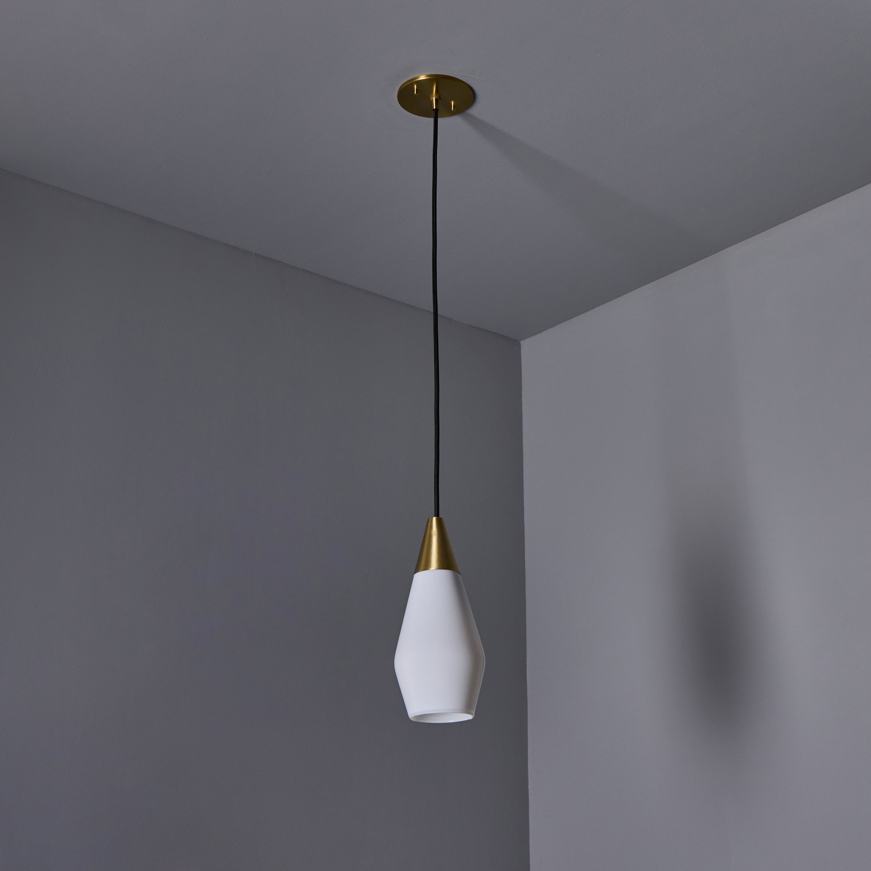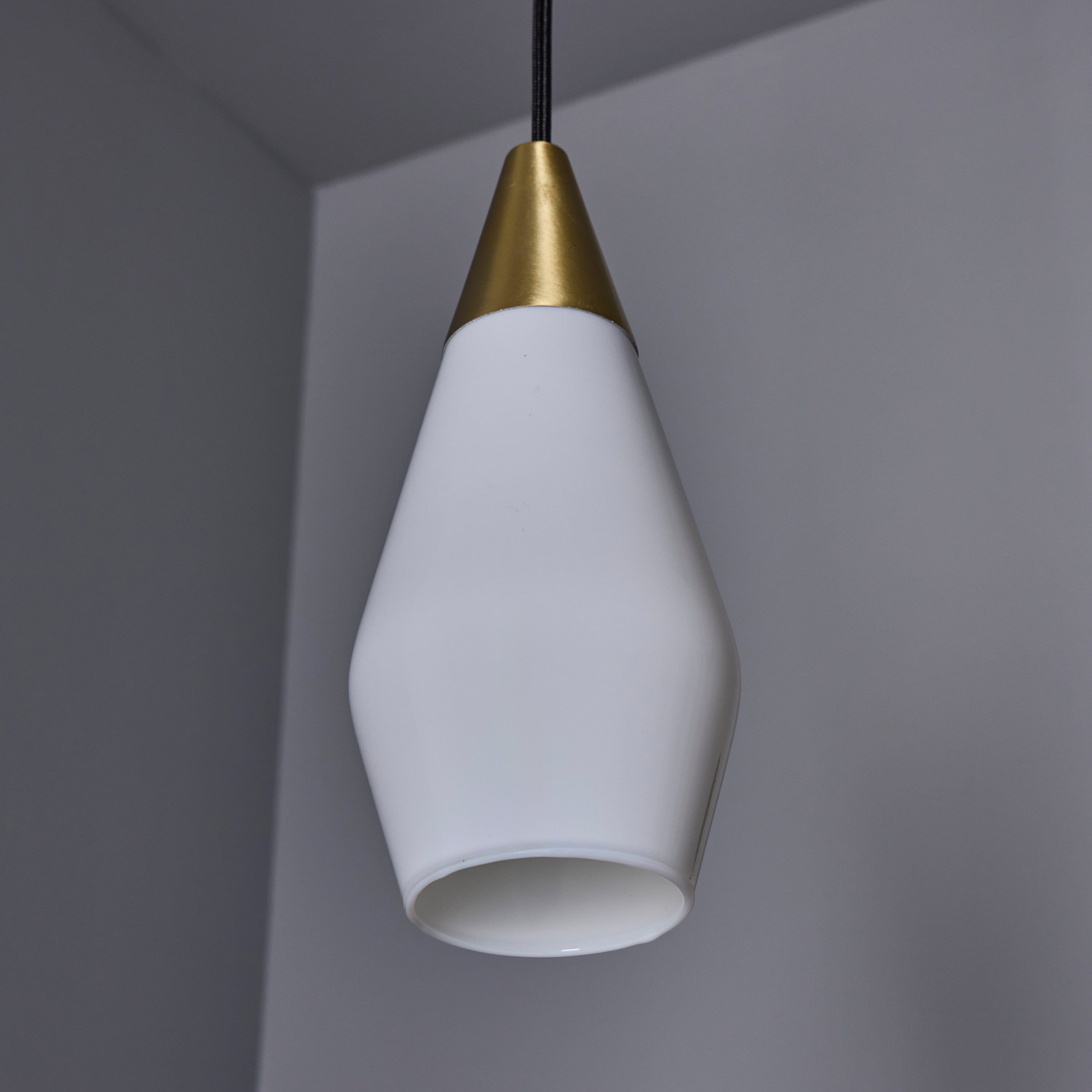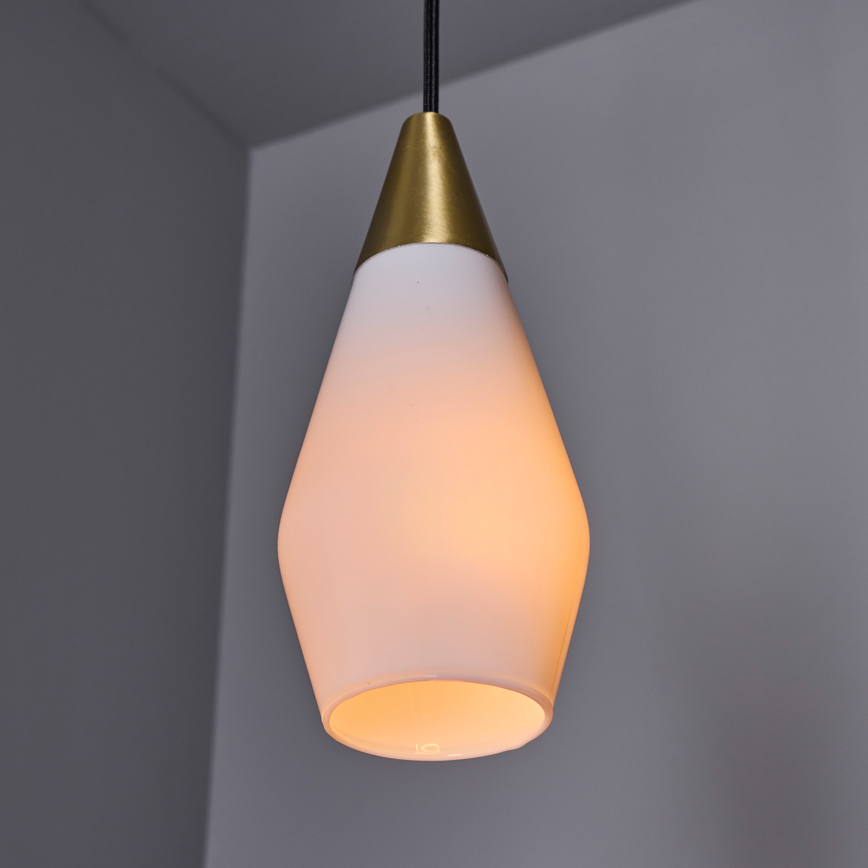 Executed in glossy opaline glass and brass with black cloth cord and custom fabricated period style brass canopy for mounting over a standard American j-box. Highly reminiscent of Paavo Tynell's iconic designs for Taito Oy. An incredibly refined design that is quintessentially Finnish.