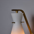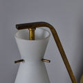 Executed in attractively patinated brass with a sculptural diabolo opaline glass shade. An incomparably refined design characteristic of midcentury Italian lighting at its highest level. Unmarked.