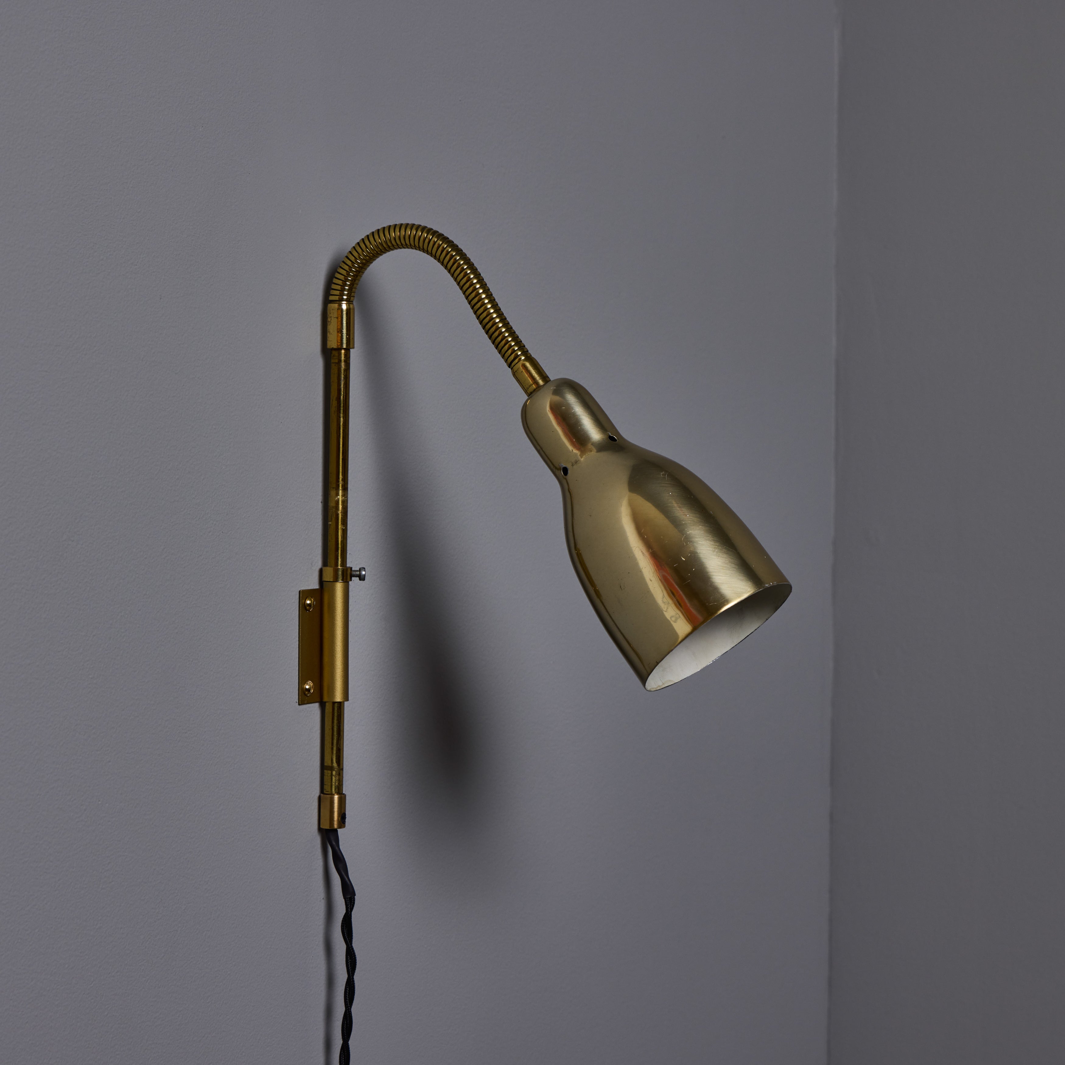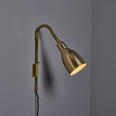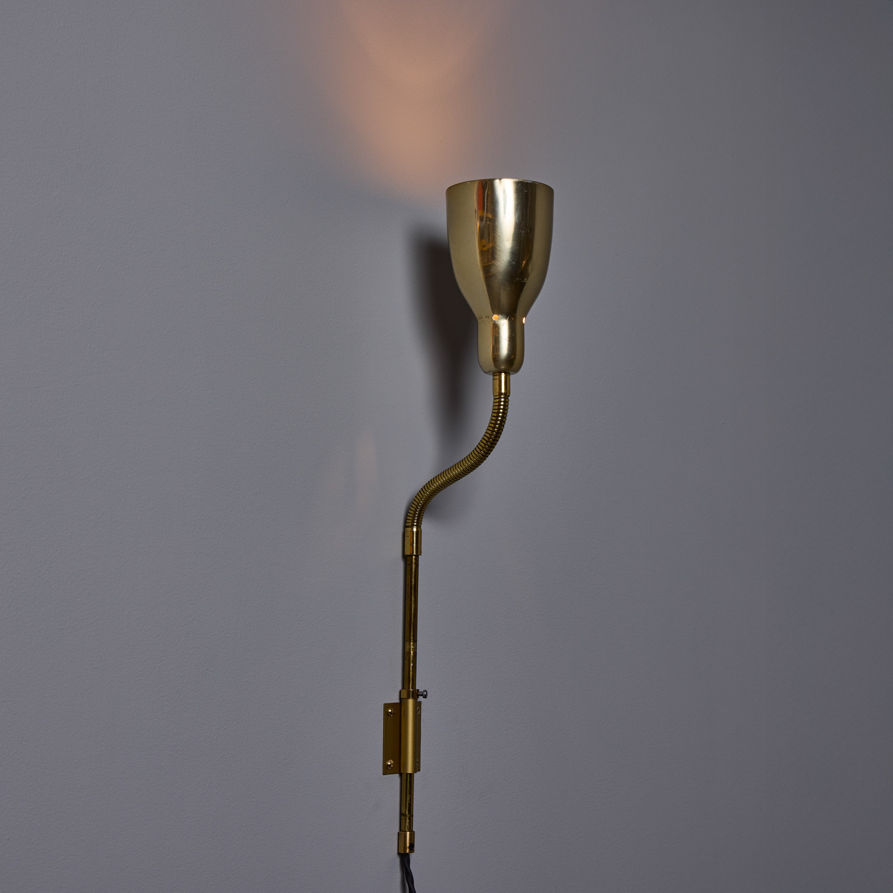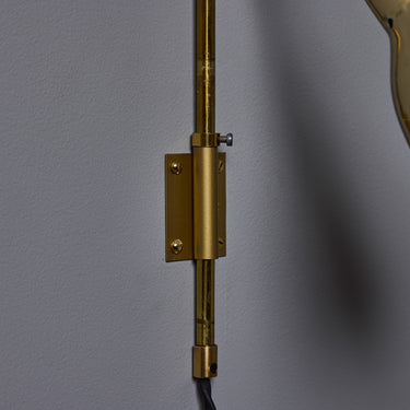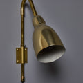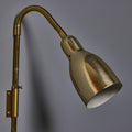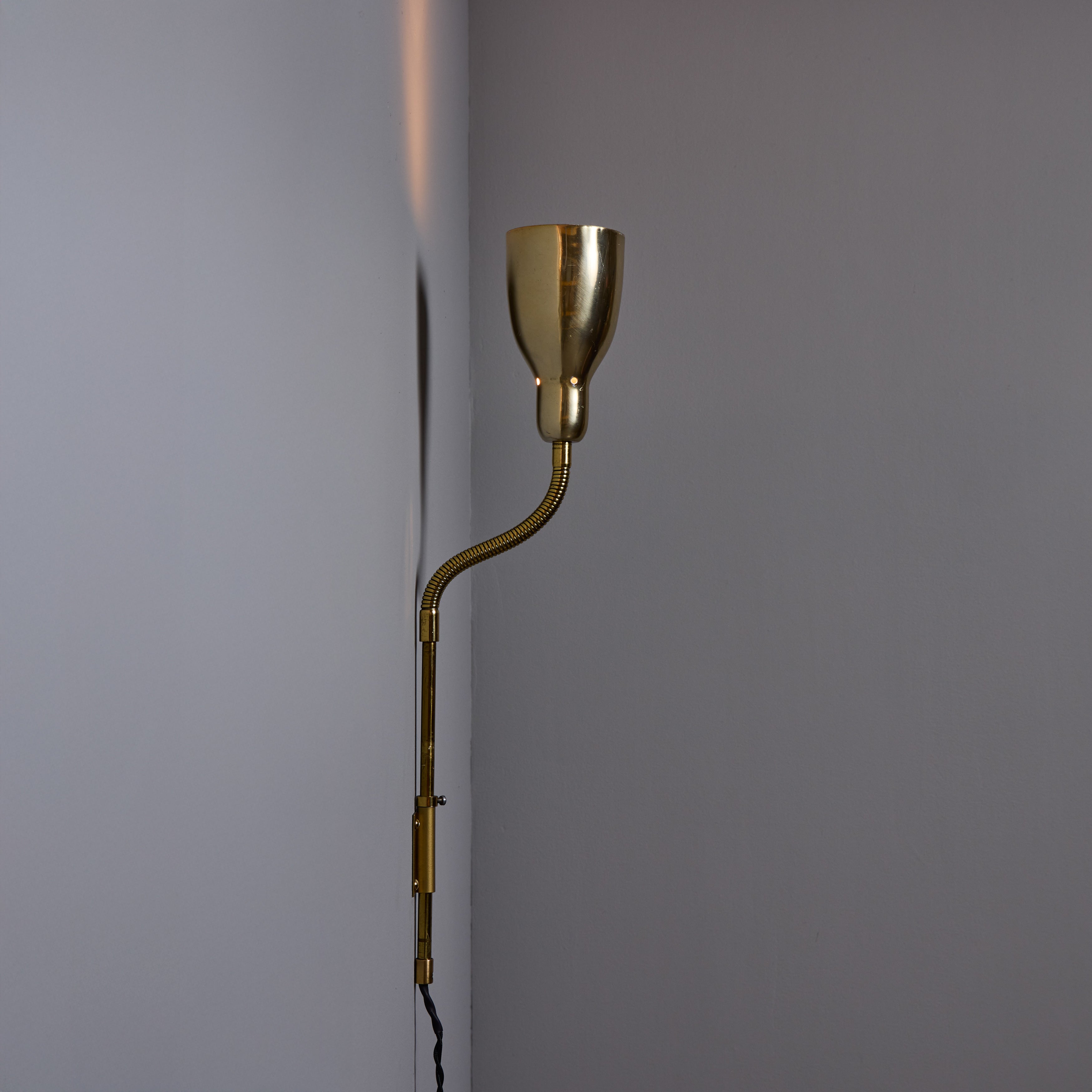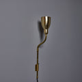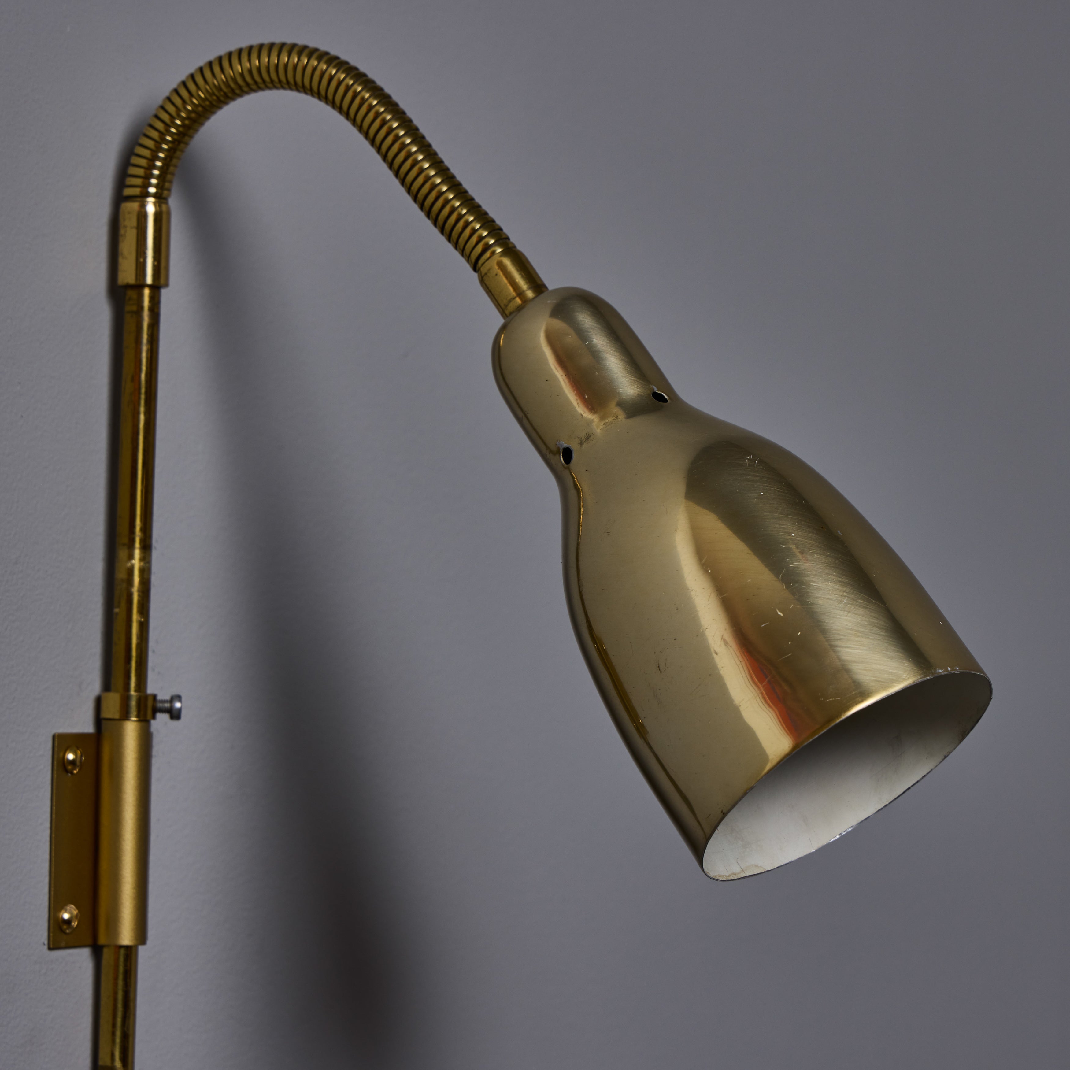 A pair of highly sculptural and functional wall lamps executed in brass with an elegant polished gooseneck adjustable brass stem to direct the light up or down.