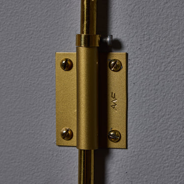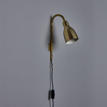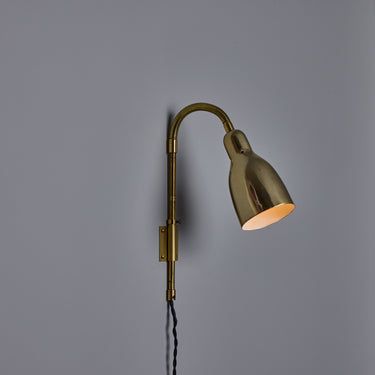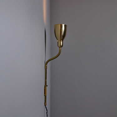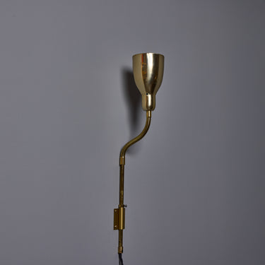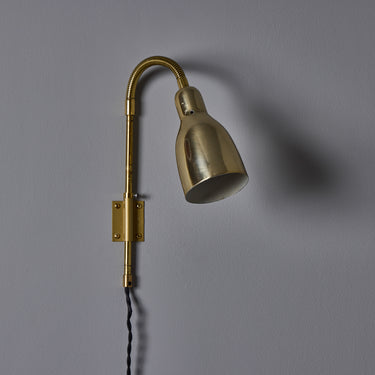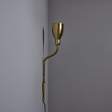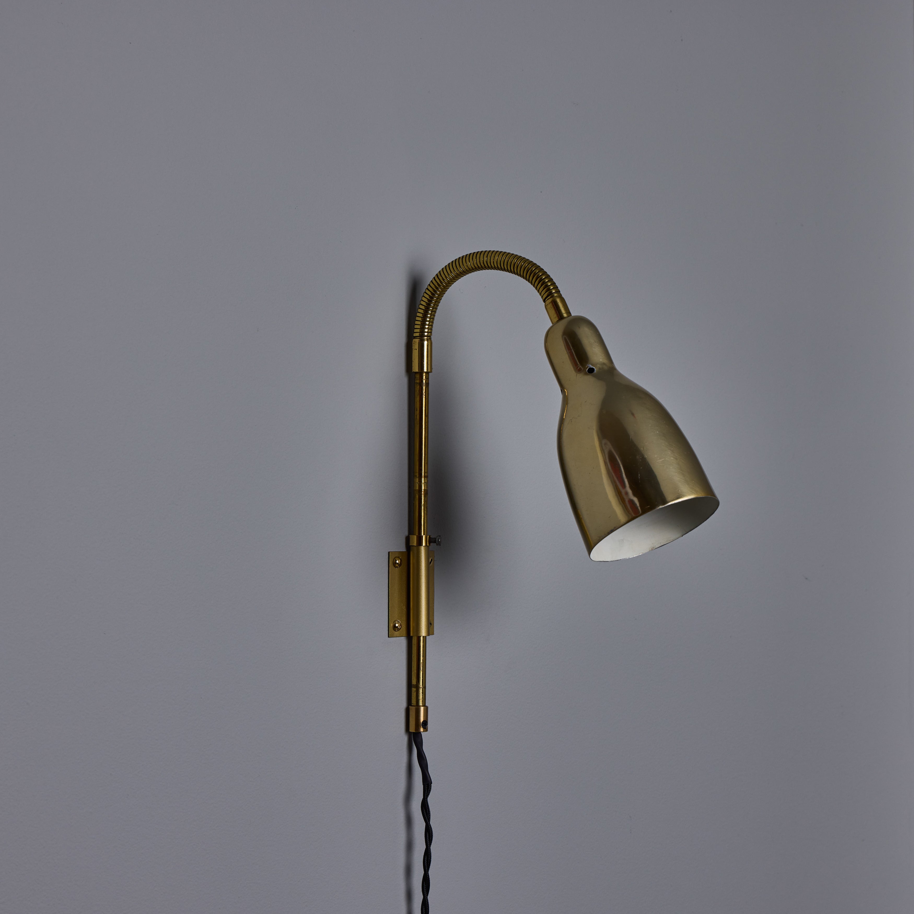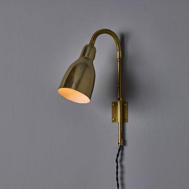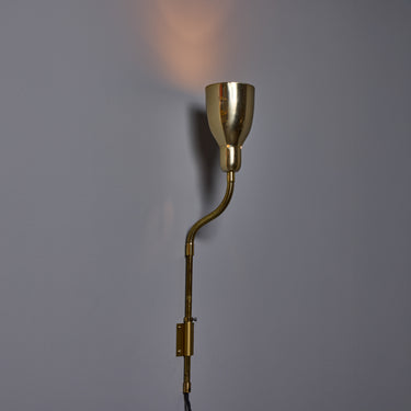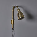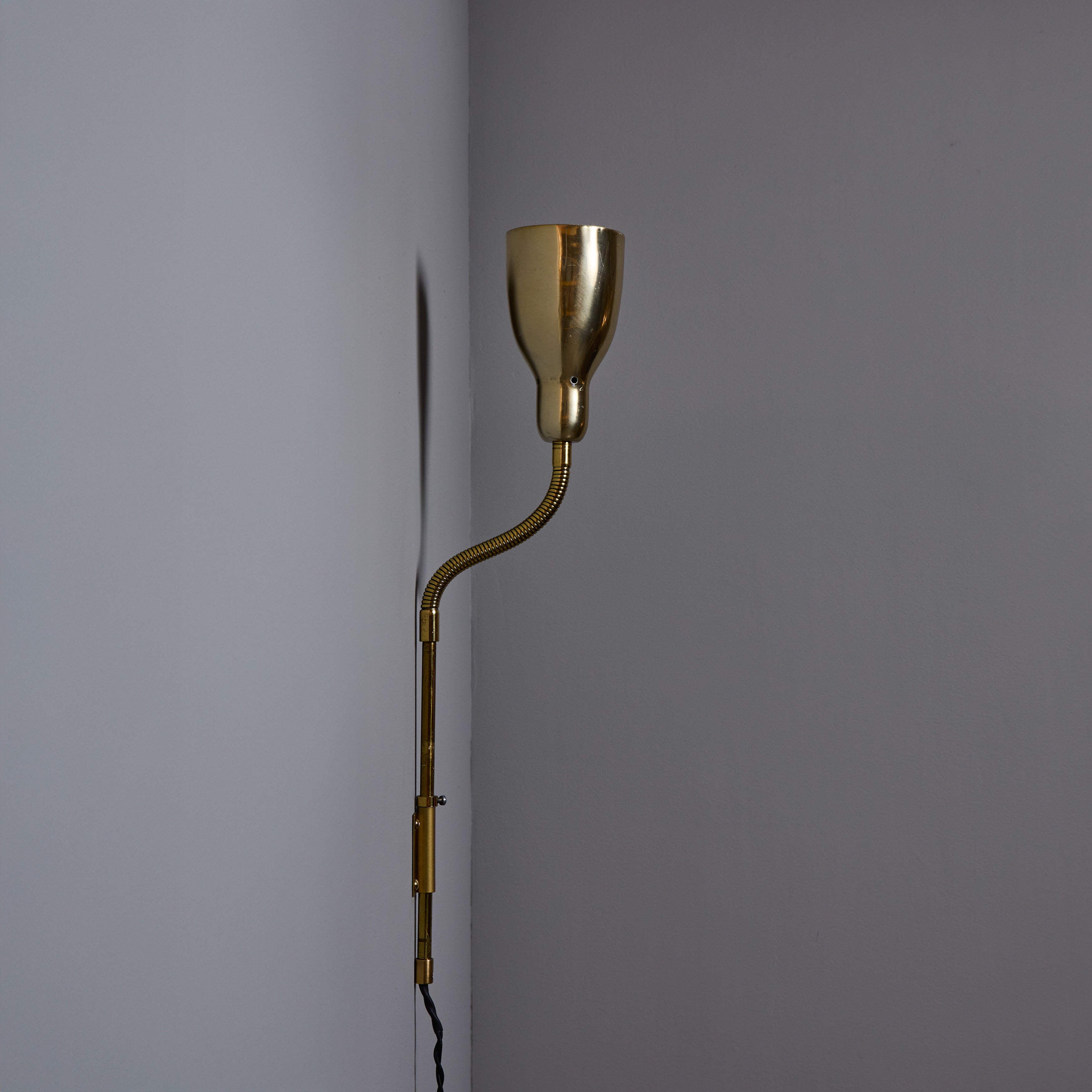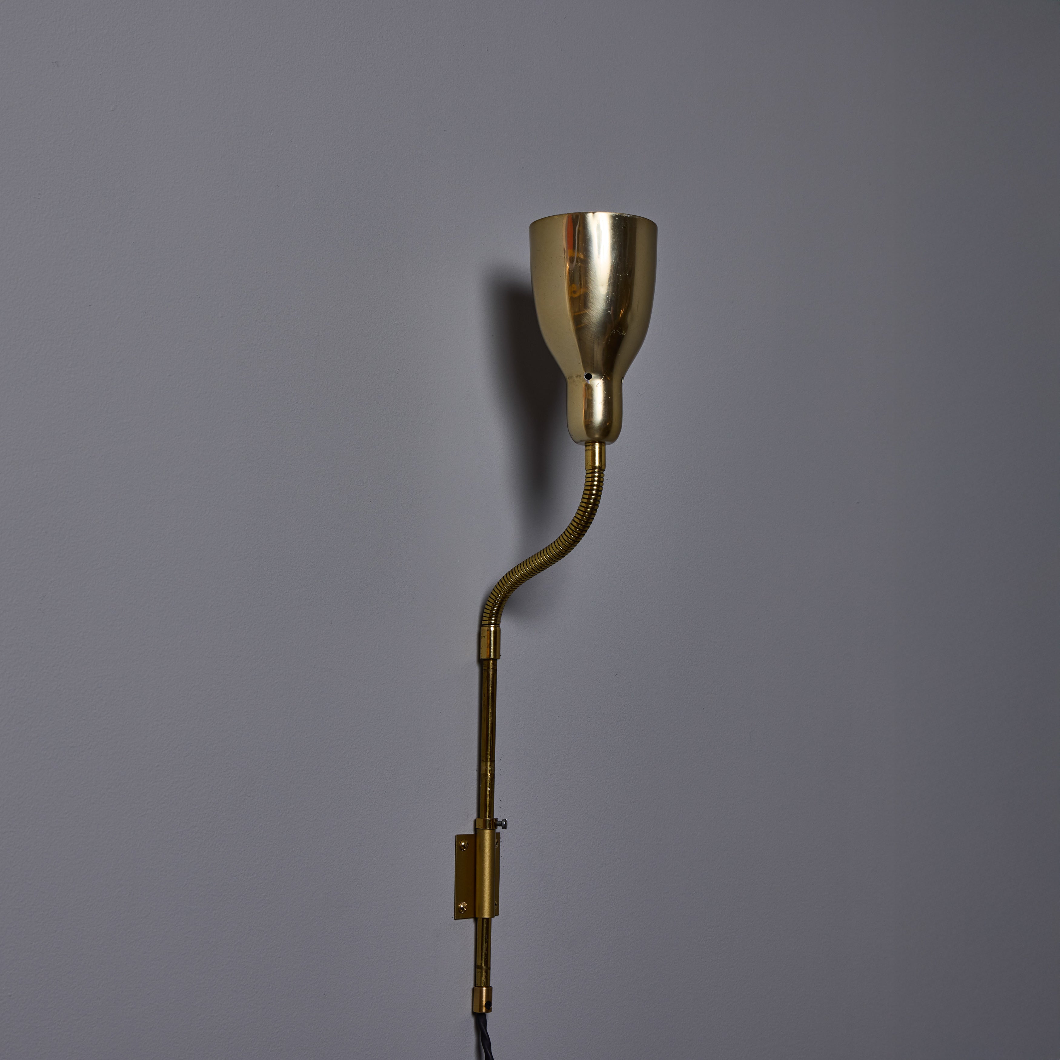 A pair of highly sculptural and functional wall lamps executed in brass with an elegant polished gooseneck adjustable brass stem to direct the light up or down.