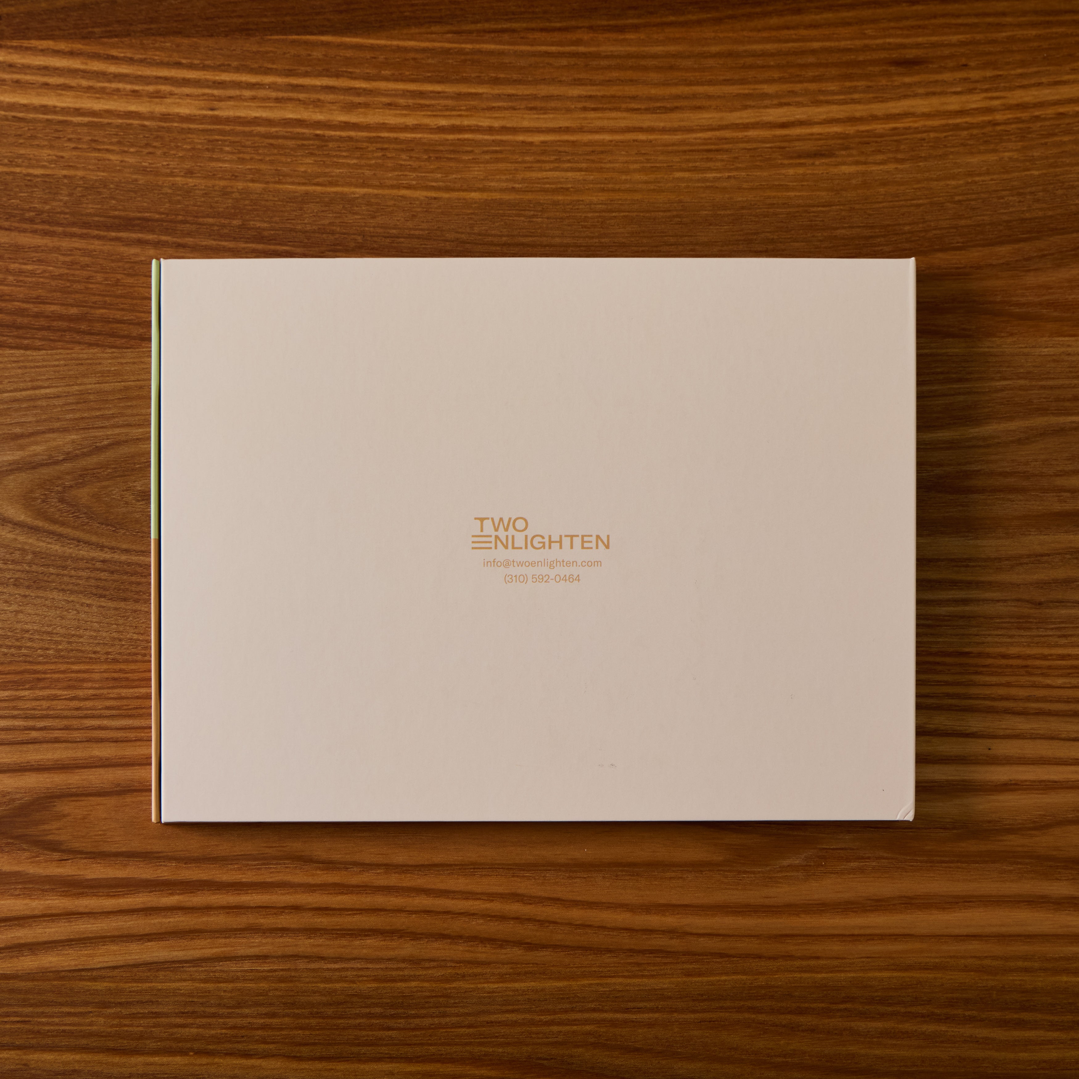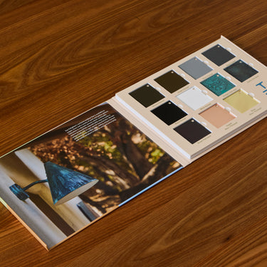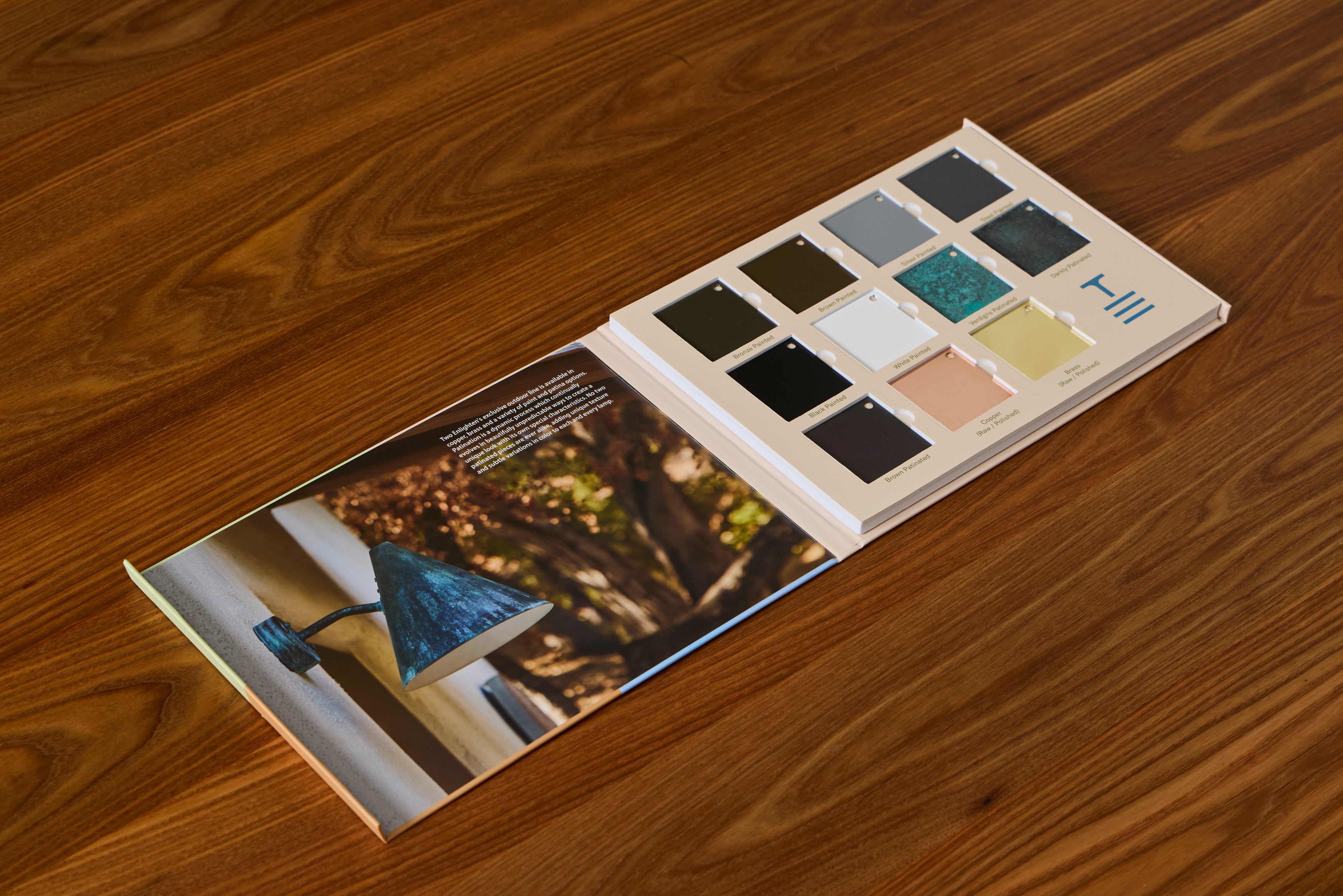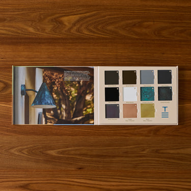 This sample book contains metal swatches of patinated and painted finishes offered on the Tratten line of wall lights and pendants, the Rulle, the Oxid, the Zuzu and the Gibson lights carried at Two Enlighten. Designed to be a reference to keep on hand for projects featuring 11 metal swatches that can be removed from the booklet if needed.