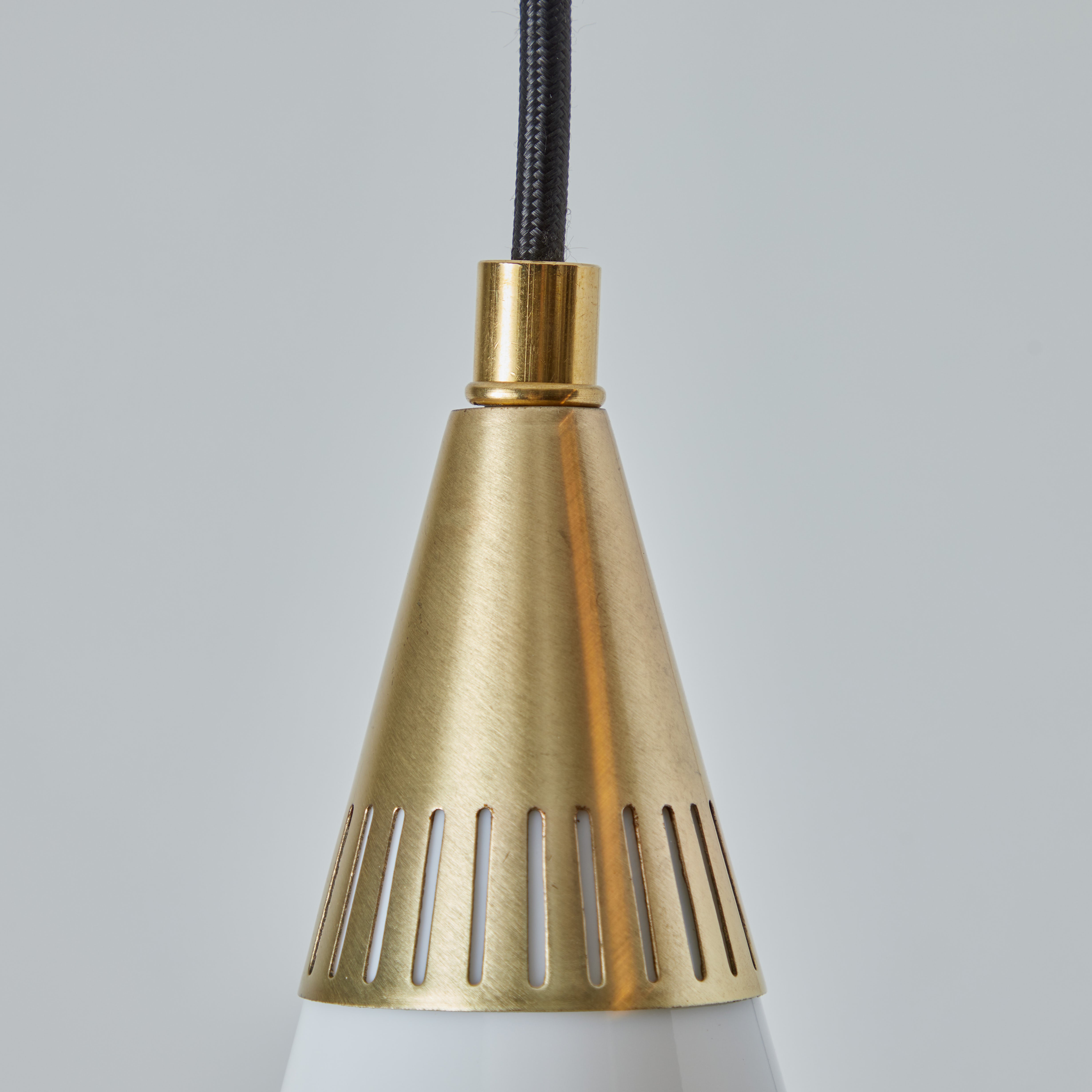 Executed in glossy opaline glass and brass with black cloth cord and custom fabricated period style brass canopy for mounting over a American j-box. Highly reminiscent of Paavo Tynell's iconic designs for Taito Oy. An incredibly refined design that is quintessentially Finnish. Unmarked.