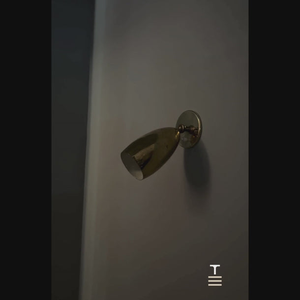 A contemporary of Paavo Tynell, the refined work of Mauri Almari has made him an increasingly valued midcentury Finnish designer by collectors in the know. Executed in beautifully patinated brass with perforations that create a stunning pattern of light and dark when illuminated. Shades freely rotate left/right and up/down on a sculpturally designed ball joint.