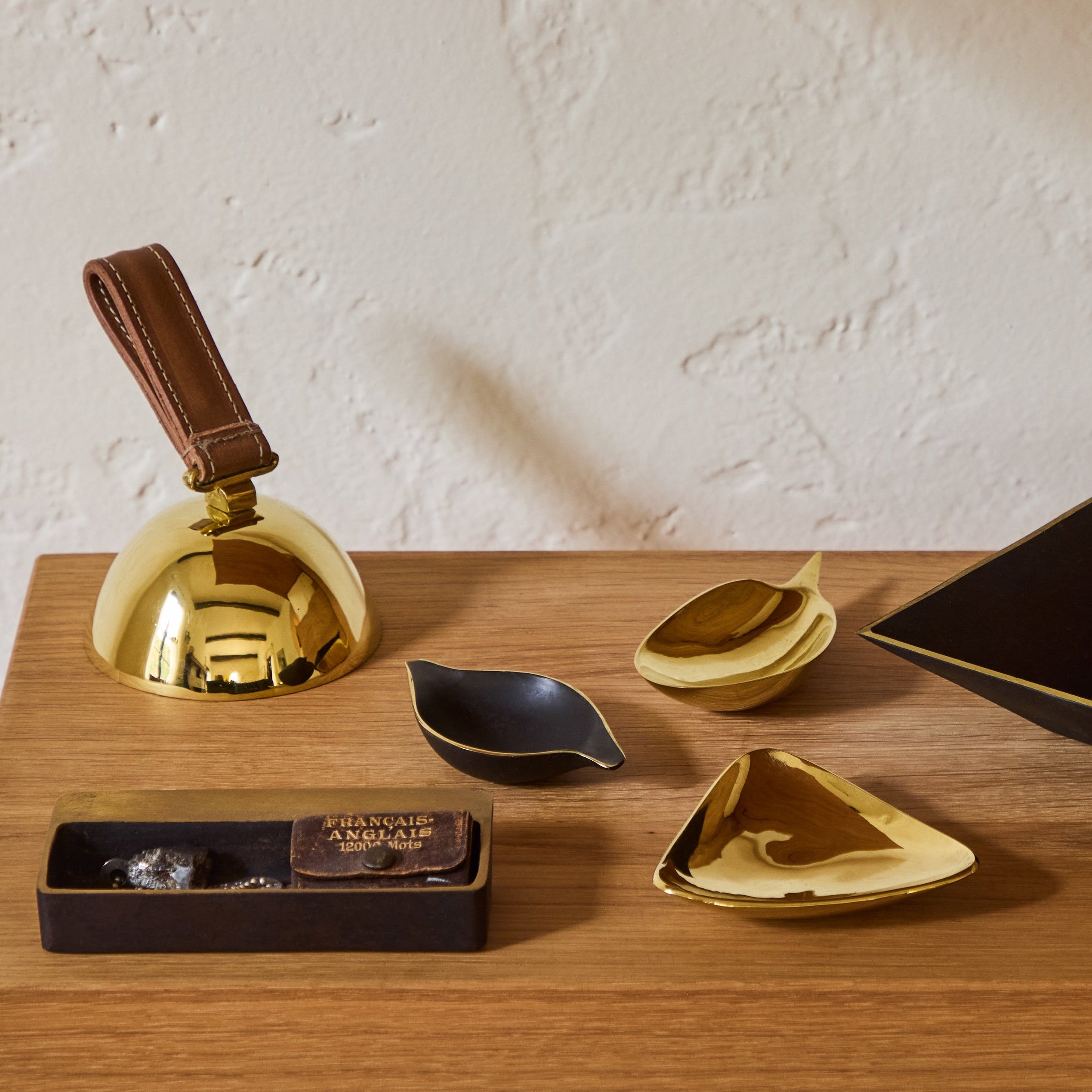 Designed in the 1950s, this incredibly refined and sculptural Viennese dish design is executed in either polished or darkly patinated brass and in two shapes. Originally conceived as an ashtray, this decorative vessel can be used for a variety of purposes, as a decorative object or catch-all. Each piece bears the "Auböck" stamp on the bottom.