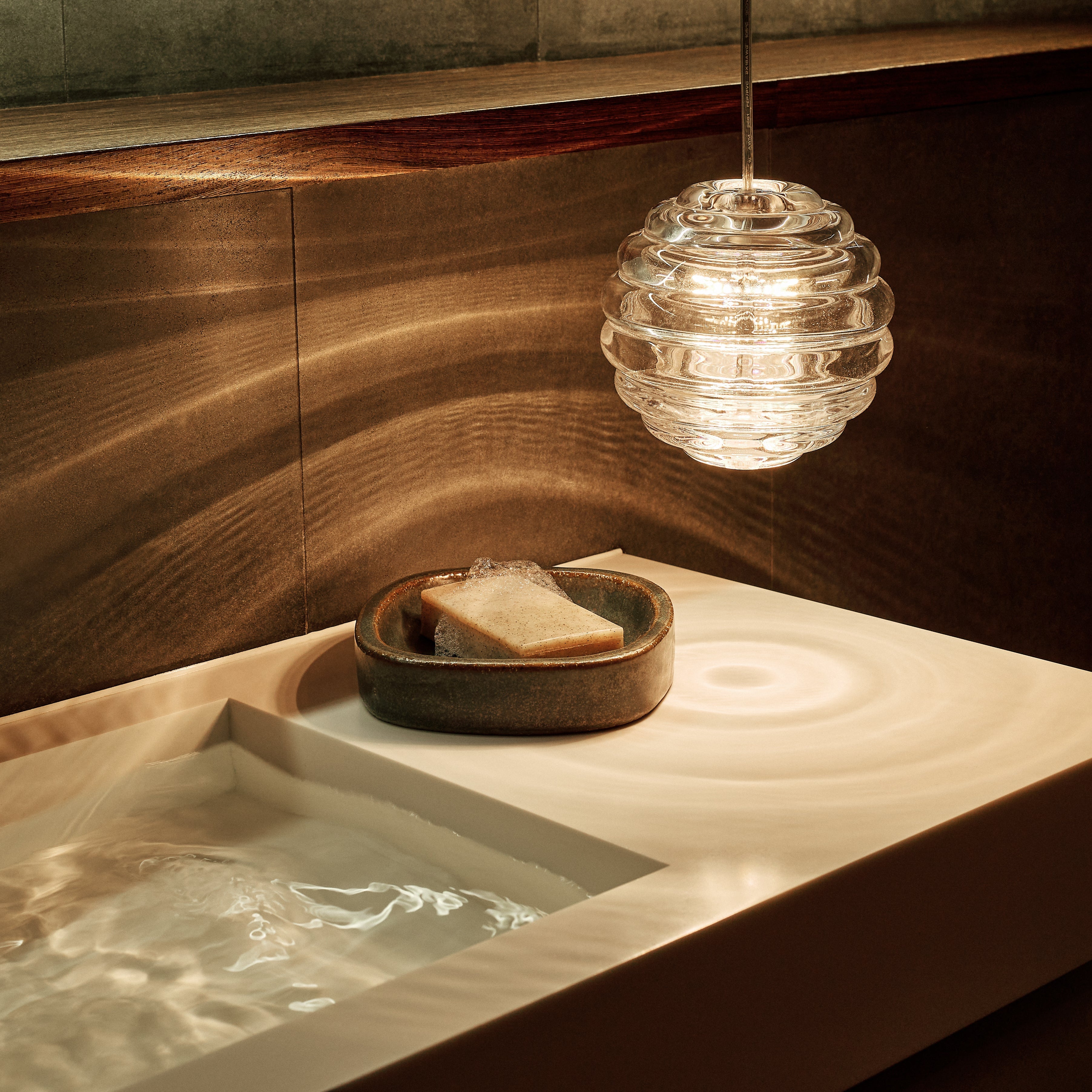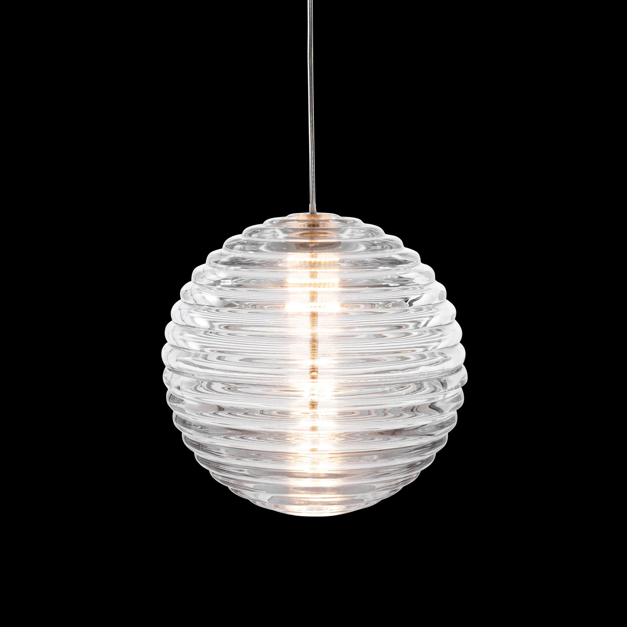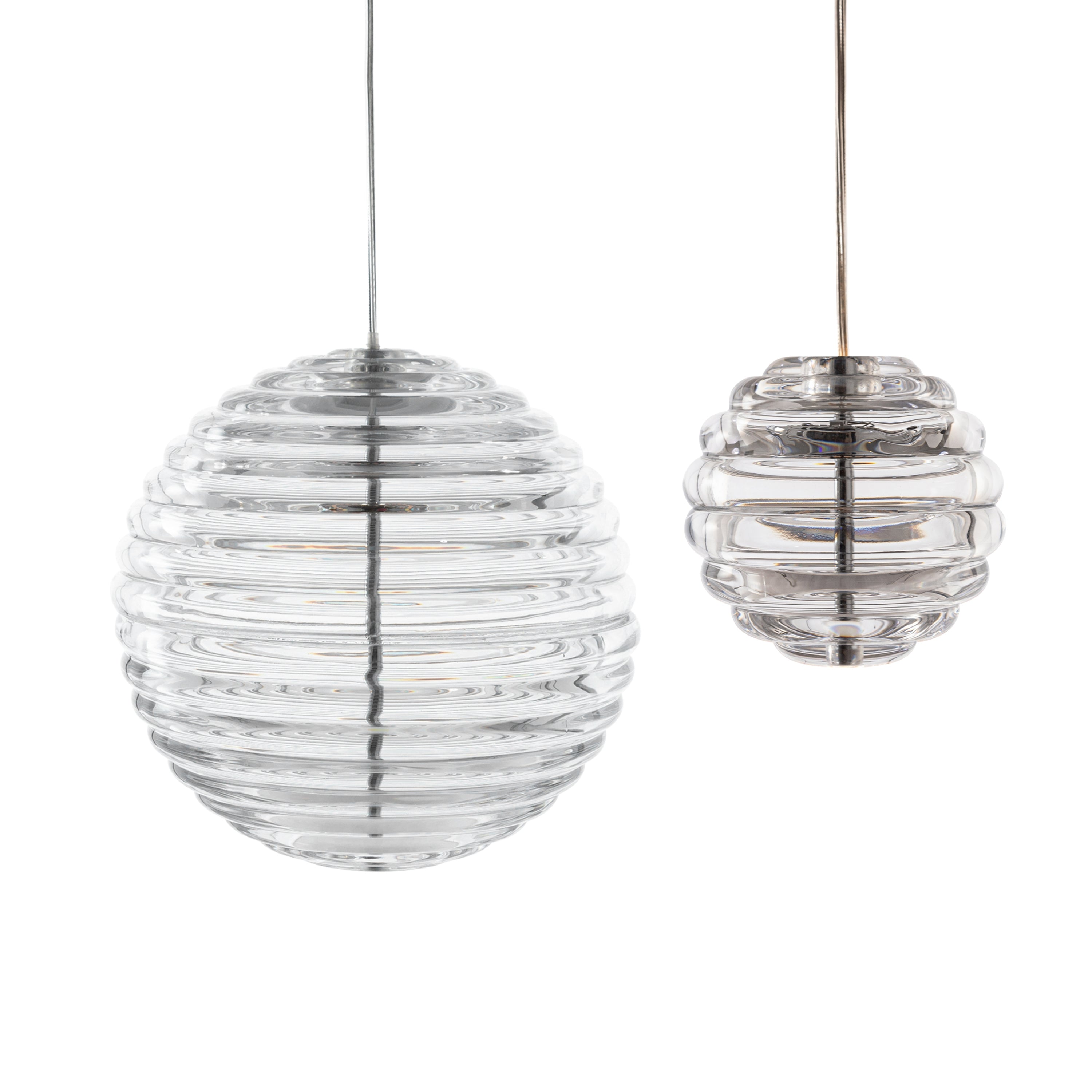 The 'Press' pendant is part of Dixon's series of LED lighting and accessories executed in thick pressed glass. Bold in silhouette and simple in function, the ribbed glass of the 'Press' refracts and diffuses the interior light source from the integrated LED. The diffuser is made of fat, chunky coils of clear glass that are pressed in iron molds to create heavyweight grooved glass. When lit, the glass projects linear patterns across the space.