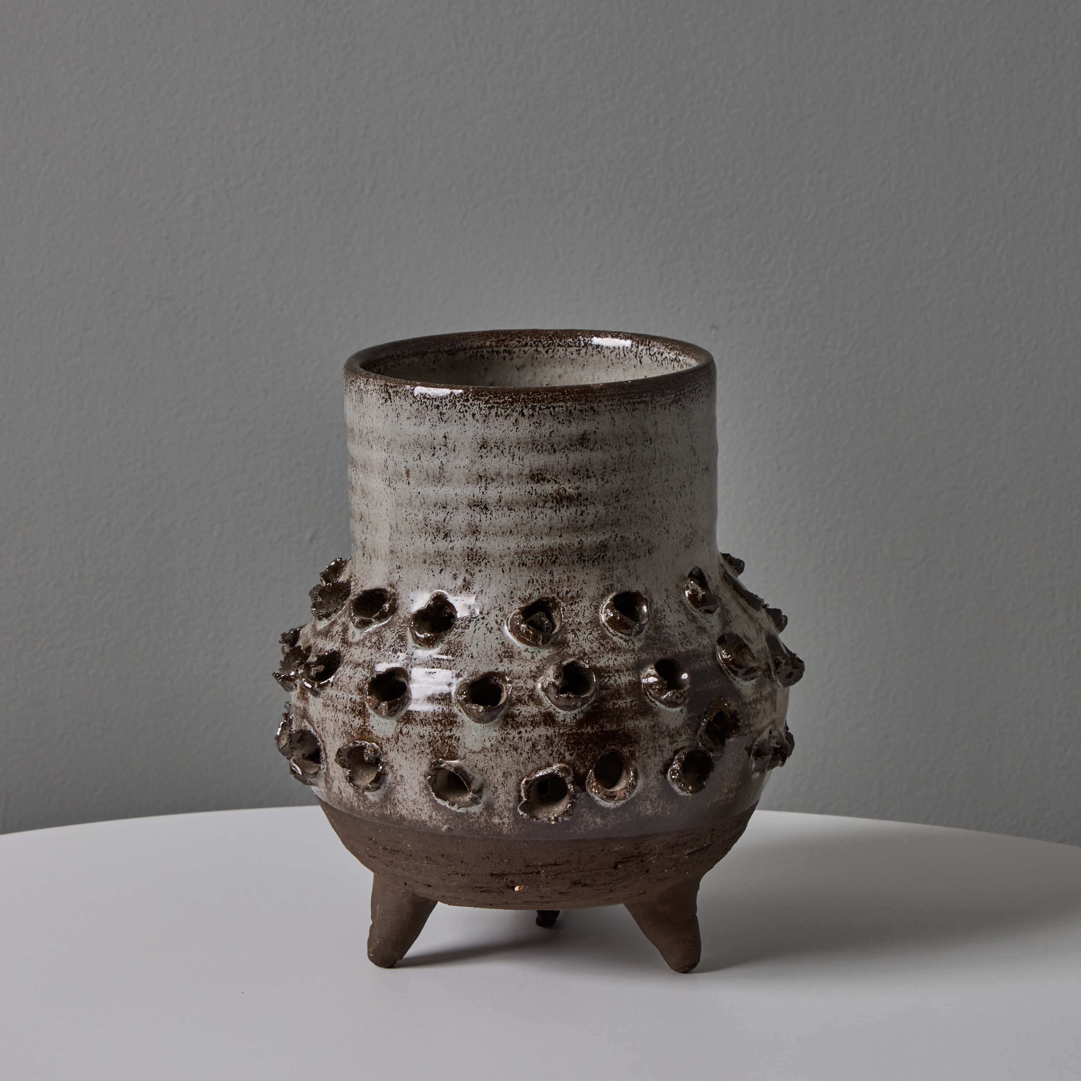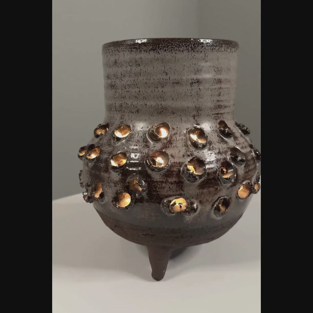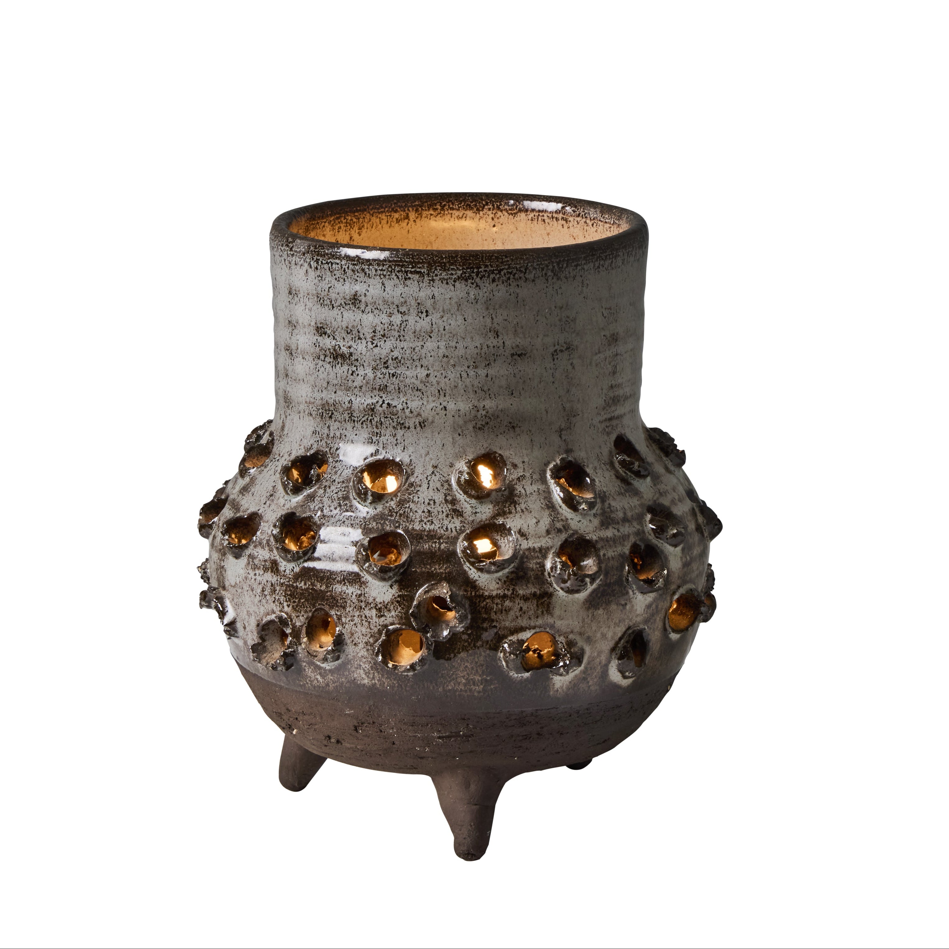 Executed in a rich gray glaze, this geometric one of a kind footed table lamp creates patterns of light and shadow when illuminated. Danish ceramicist Erik Glud crafted lighting and ceramics from his studio in Egebjerg up until the 1990s. His rustic designs and rich glazes make his pieces increasingly valued by collectors.