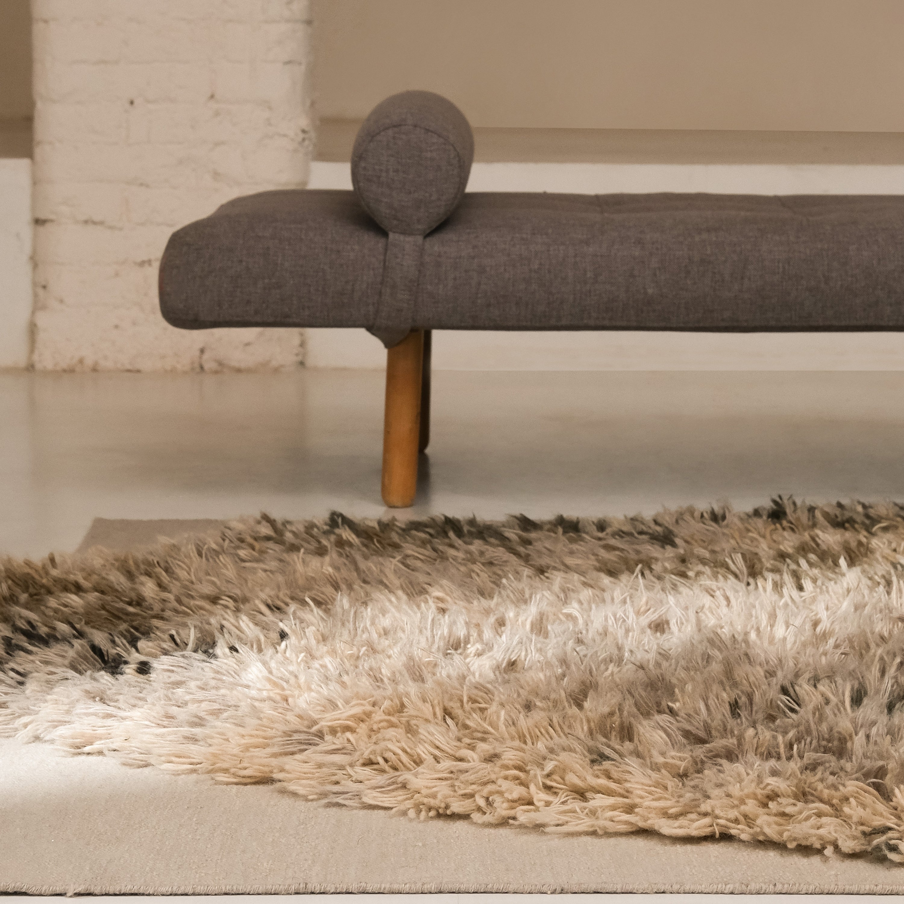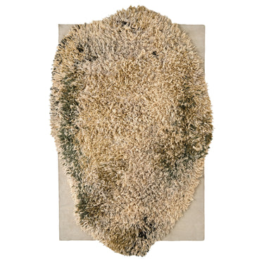 New for 2025, the striking Alga shag rug is a flowing organic shape woven using a hand-knotted technique and framed by a hand-loomed dhurrie. Inspired by the marine fields in the beaches of Spain, this deep-pile shag rug uses several fibers, thread densities, and color variations to achieve a voluminous, layered effect. Both hands and feet can perceive the rug's nuances, creating an intimate connection with the material and color. Nani Marquina carefully selected a neutral palette to create depth, with subtle yet deliberate touches of contrasting colors resulting in an organic color distribution that further enhances the rug’s sense of movement.