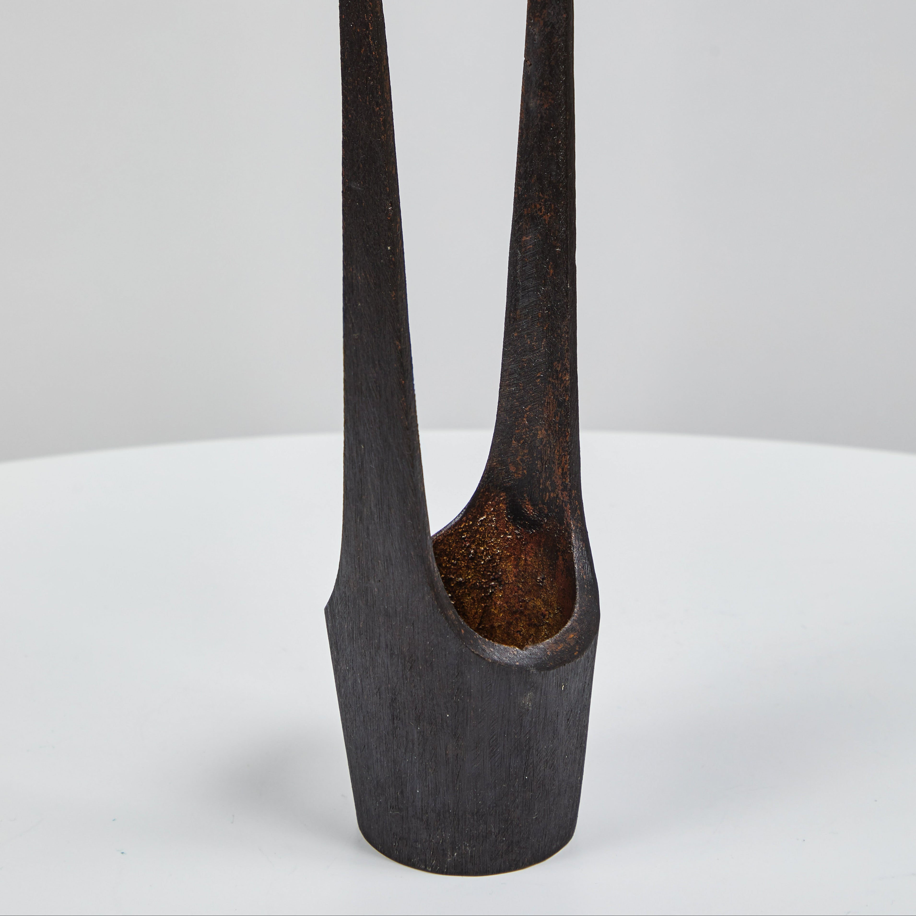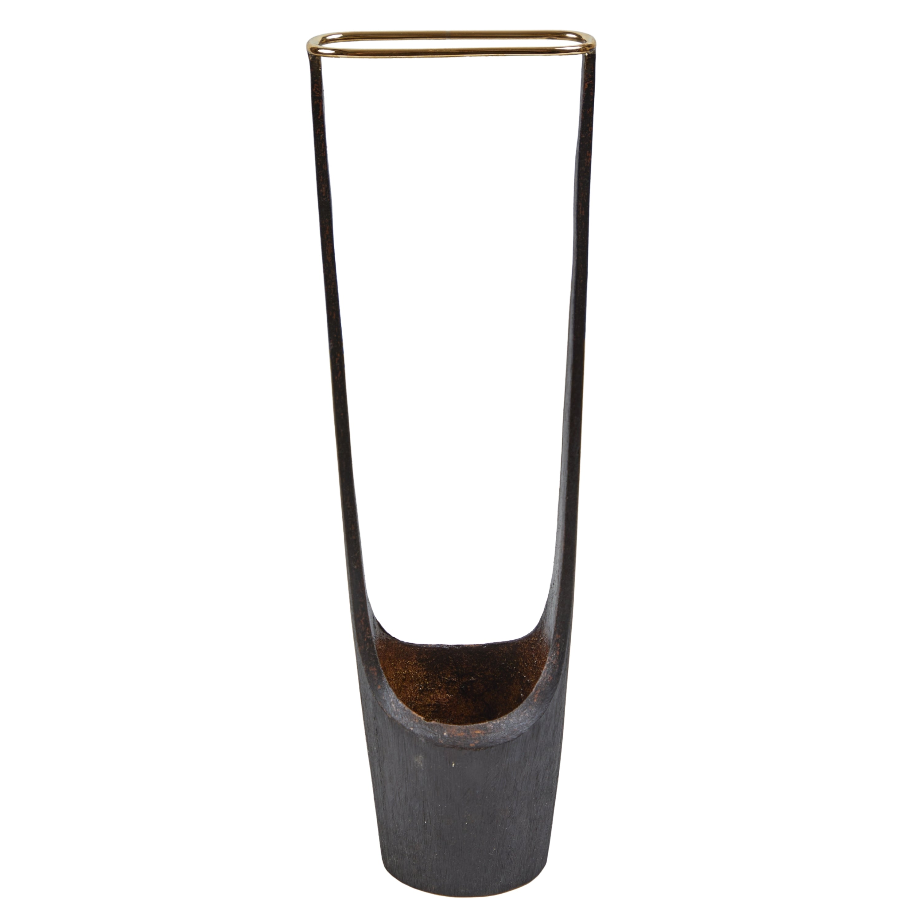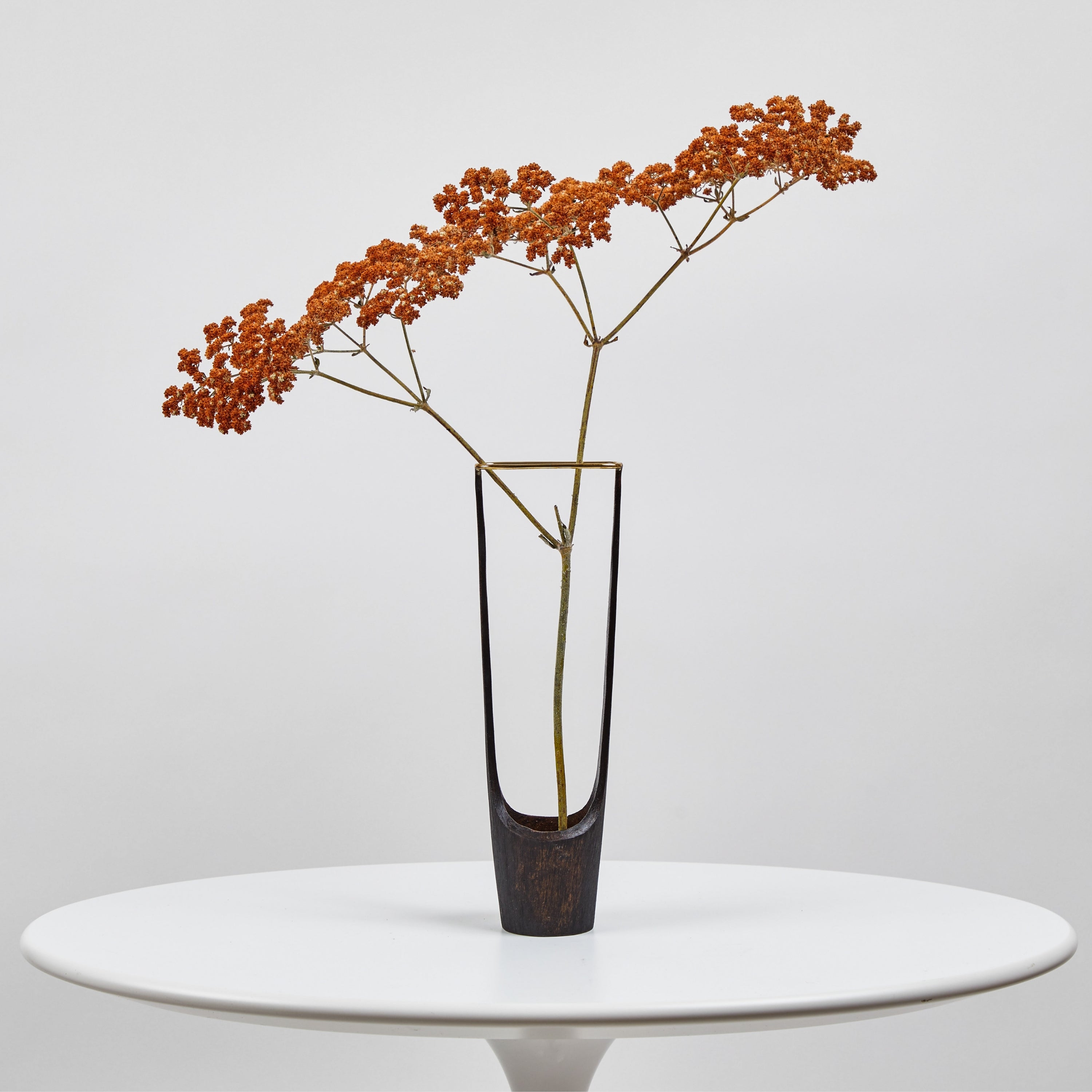 Designed in the 1950s, this incredibly refined and sculptural Viennese vase is executed in darkly patinated brass with polished brass accents by Werkstätte Carl Auböck, Austria. The well at the bottom of the vase holds water for fresh-cut stems or can be left empty to hold dried flowers. The bottom of each vase is stamped "Auböck."