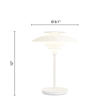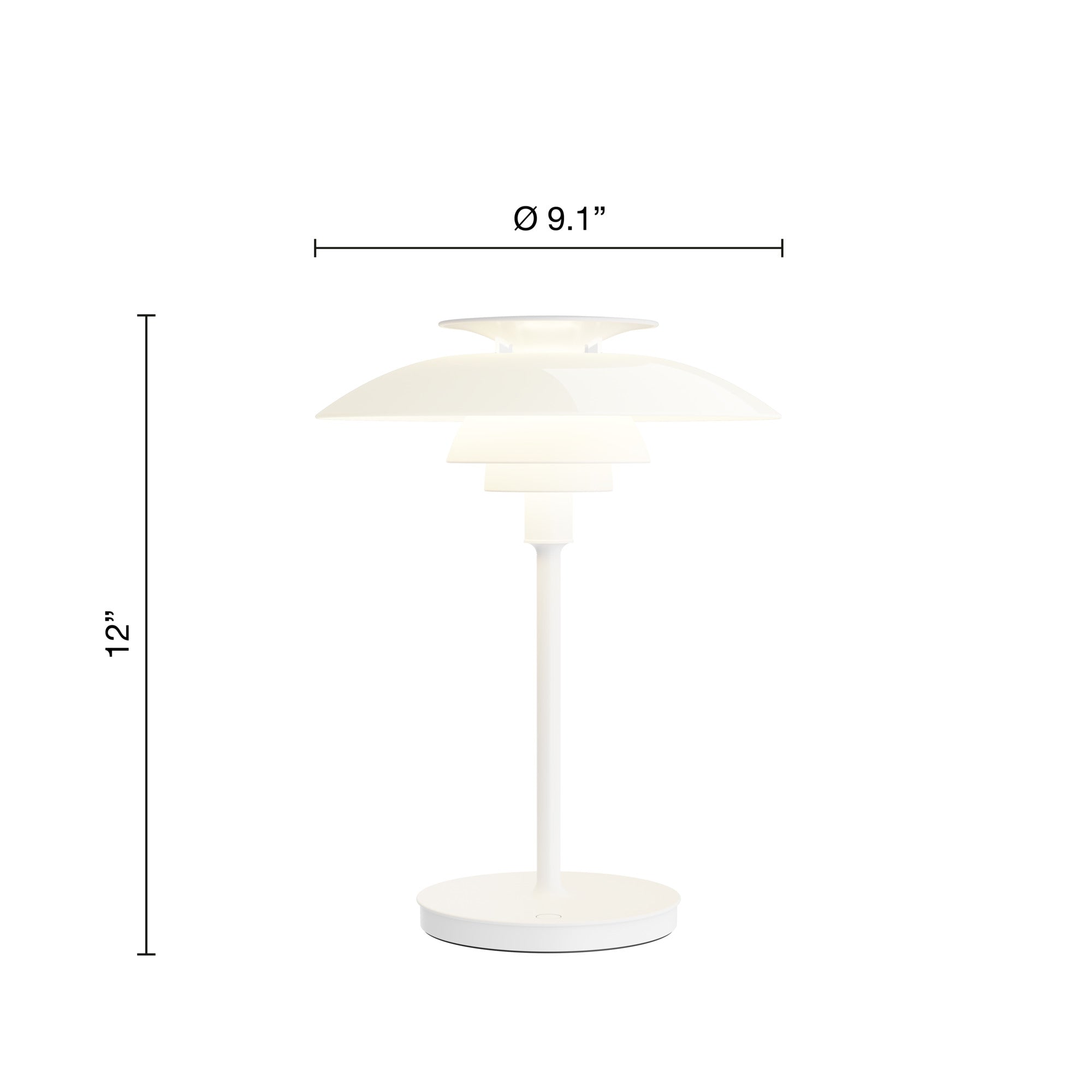 Executed in injection molded polycarbonate with die-cast aluminum base and extruded aluminum stem. The original PH 80 is part of Henningsen's famous "PH series" and follows his principles of creating glare-free lighting through a multi-shade design. The PH 80 Portable Lamp is both functional and aesthetic, providing comfortable, indirect lighting that is warm and diffuse, making it suitable for both private homes and professional environments.