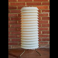 The 'Maija' table lamp, designed in 1955 by Ilmari Tapiovaara, was inspired from typical Baltic cities, where public lighting was scarce and instead streets were illuminated by light streaming through the window shades of adjacent homes. Featuring stacked metal discs through which the warm light filters outwards, the 'Maija' table lamp is executed in painted metal shades, matte brass legs and a white translucent methacrylate diffuser. Today the 'Maija' continues to be meticulously crafted to Santa & Cole's exacting standards using the highest quality materials available.