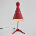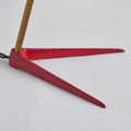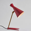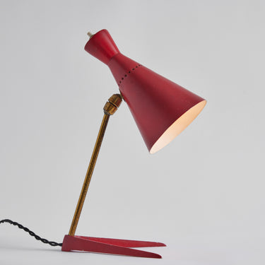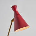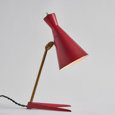 Executed in red painted wood and metal and brass. The shade is adjustable at two points for a flexible variety of lighting options. The brass stem has a lovely vintage patina.