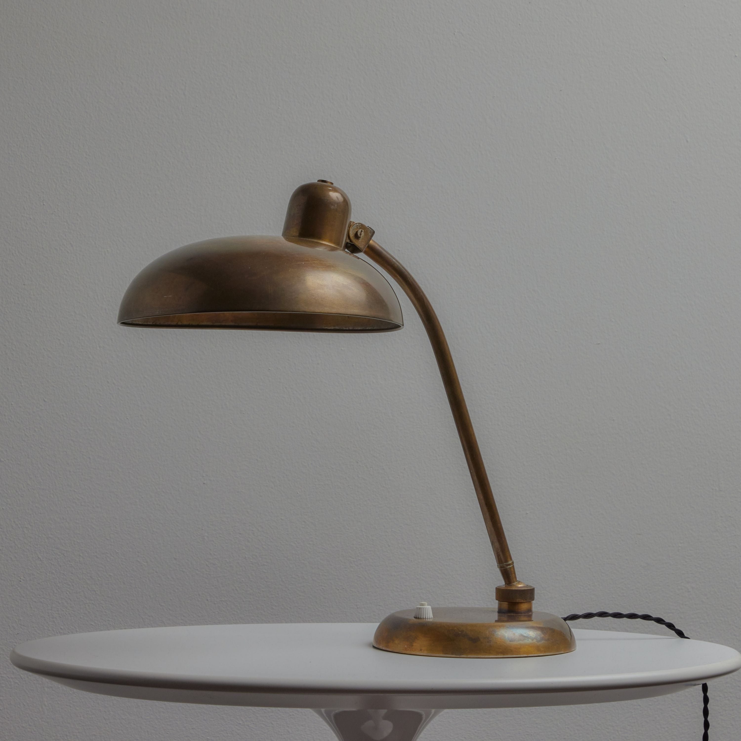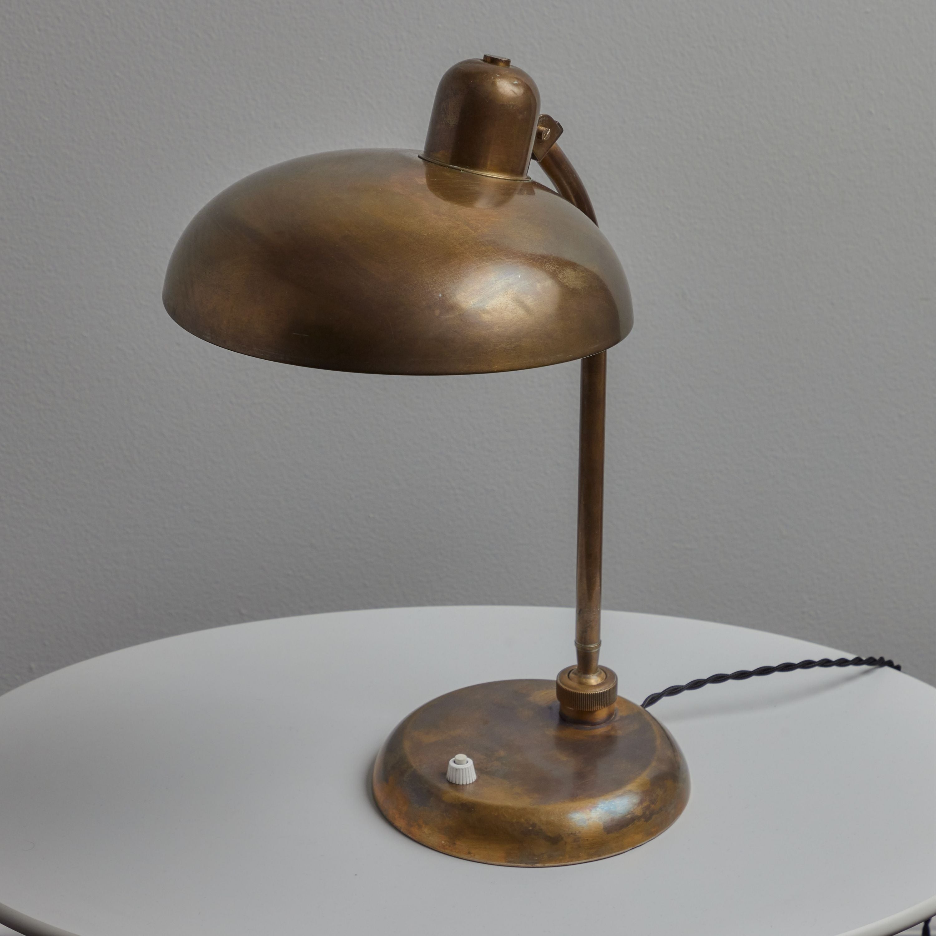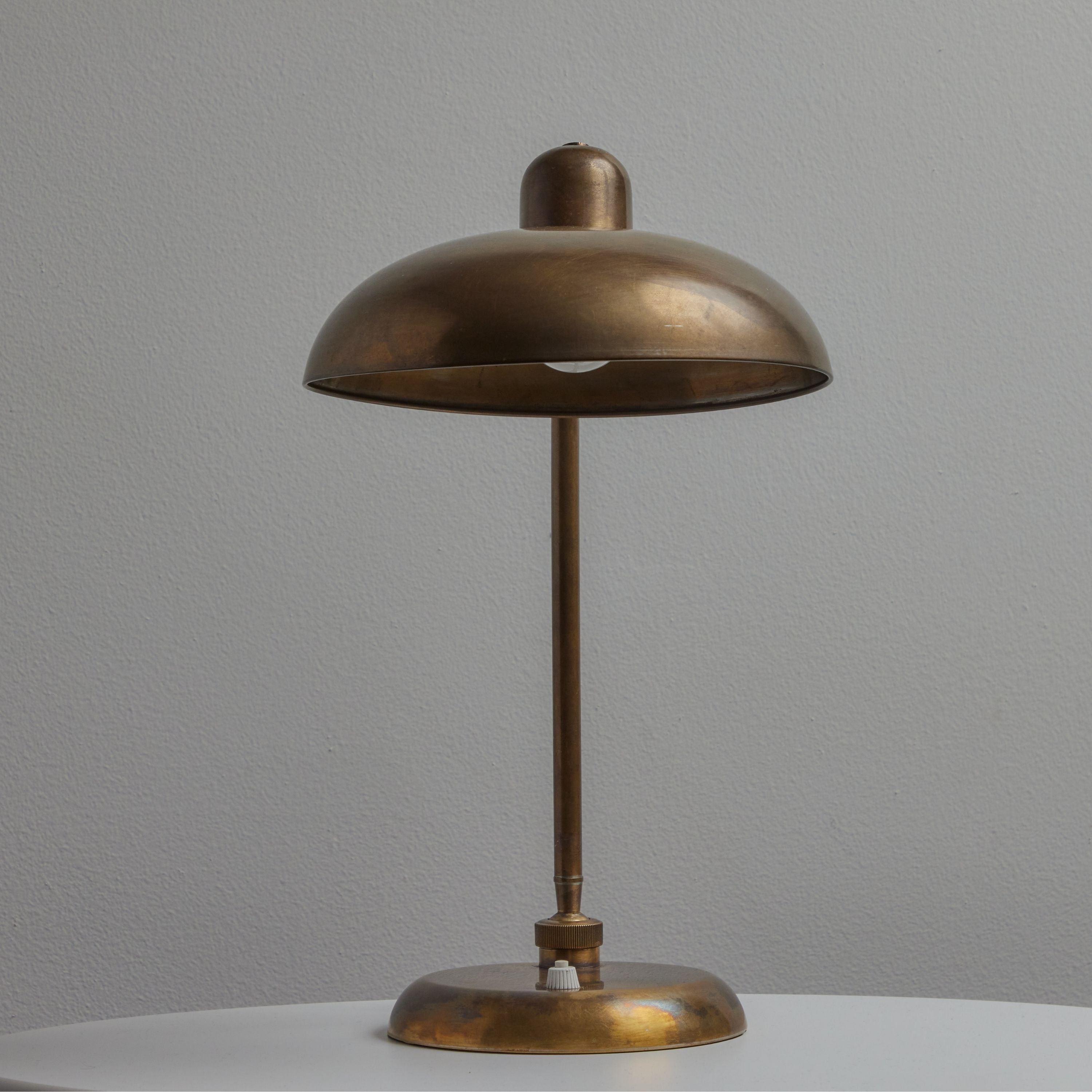 Produced circa 1940 and executed in richly patinated brass with swiveling arm and rotating adjustable shade. On/off switch on base. Reminiscent of the early designs of Kaiser Idell. An elegant desk or table lamp with beautiful scale and presence.