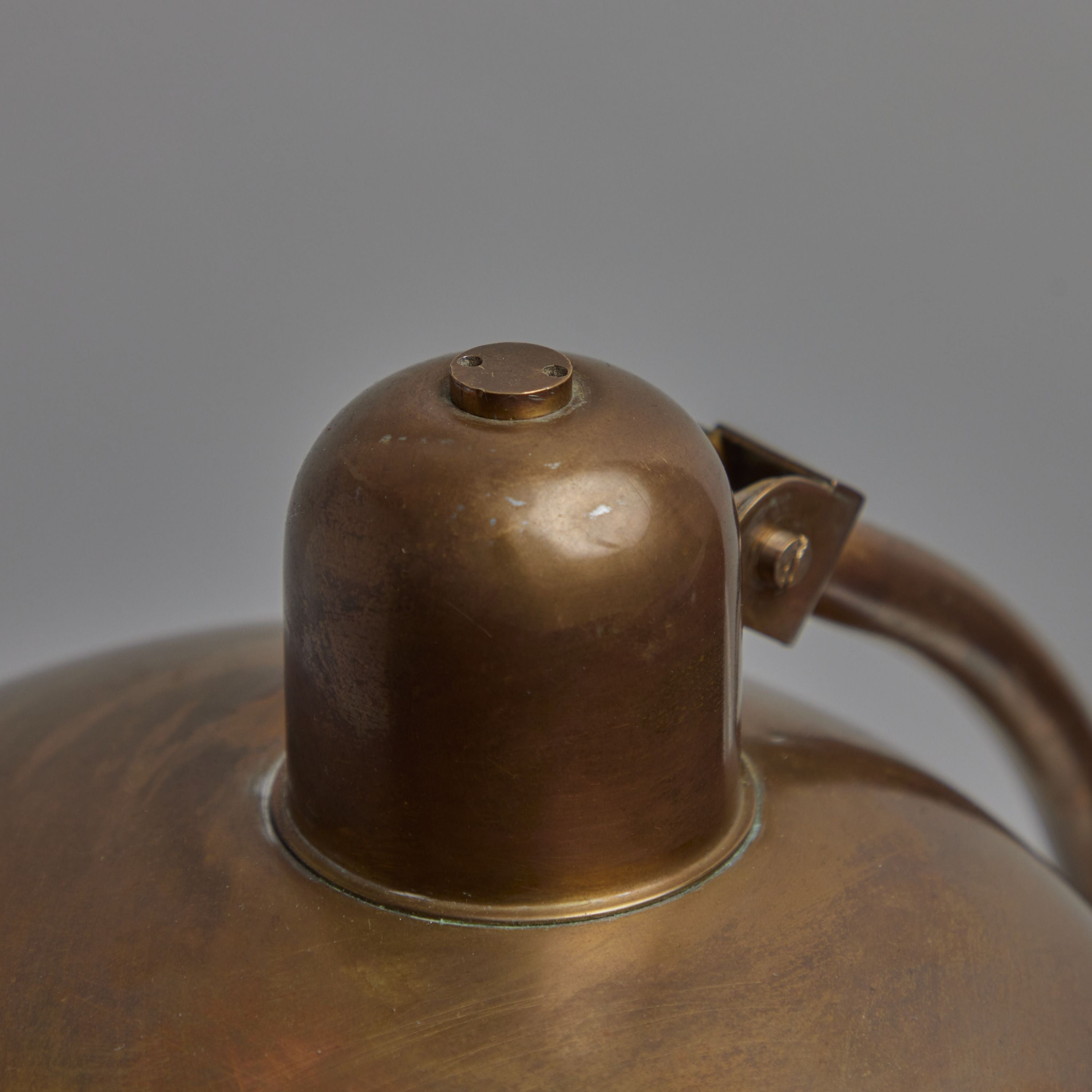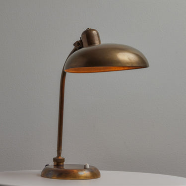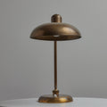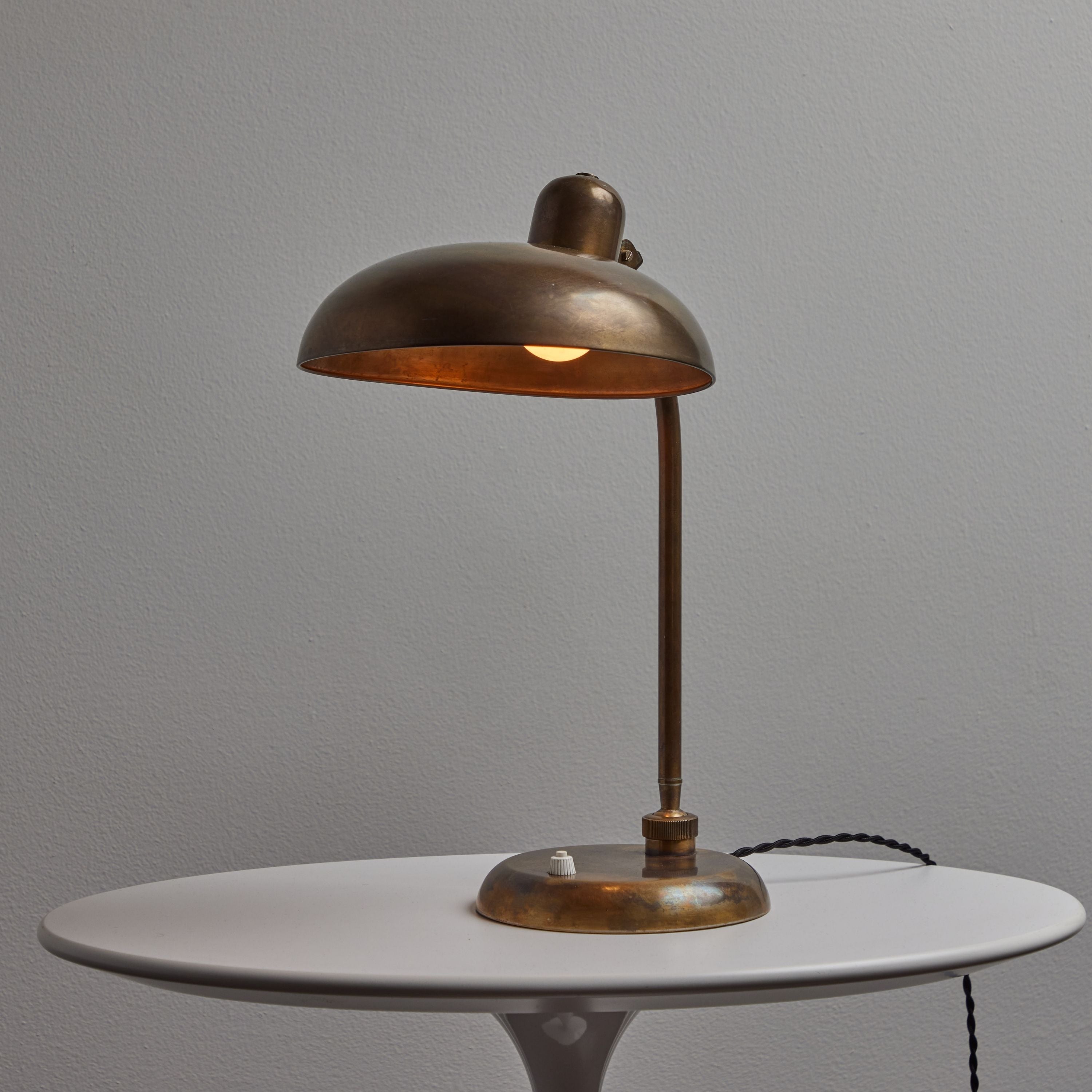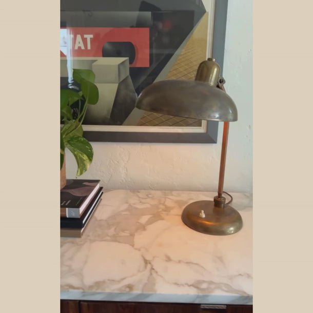 Produced circa 1940 and executed in richly patinated brass with swiveling arm and rotating adjustable shade. On/off switch on base. Reminiscent of the early designs of Kaiser Idell. An elegant desk or table lamp with beautiful scale and presence.