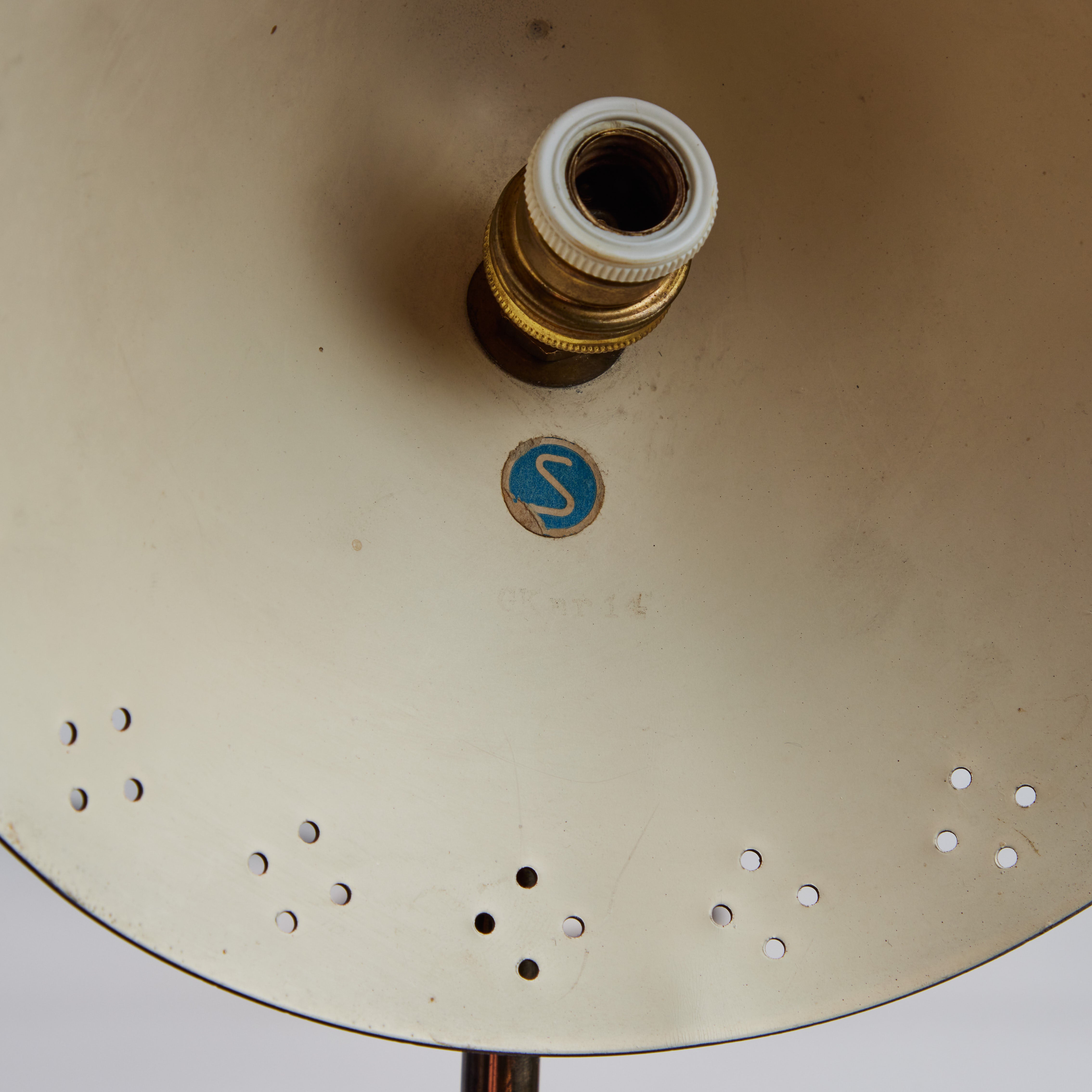 Executed in perforated red painted metal and patinated brass. Shade is adjustable and can be rotate up or down. Produced by Gnosjö Konstsmide Rydahls in Sweden in the mid-century. A highly refined pair of Scandinavian table lamp.