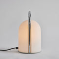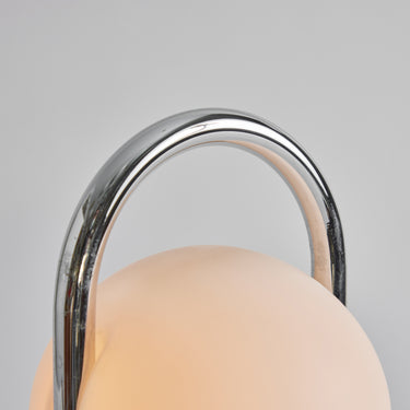 Executed in opaline glass and chromed metal finish, the 'Tender' is a modern take on 19th century railroad tender lights. The handle is functional, and allows the lamp to be lifted or moved. The Tender lamp handles were produced throughout the 1980s in a variety of colors, and the lamp was also produced in a larger floor lamp size. Please see our listings for availability.