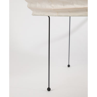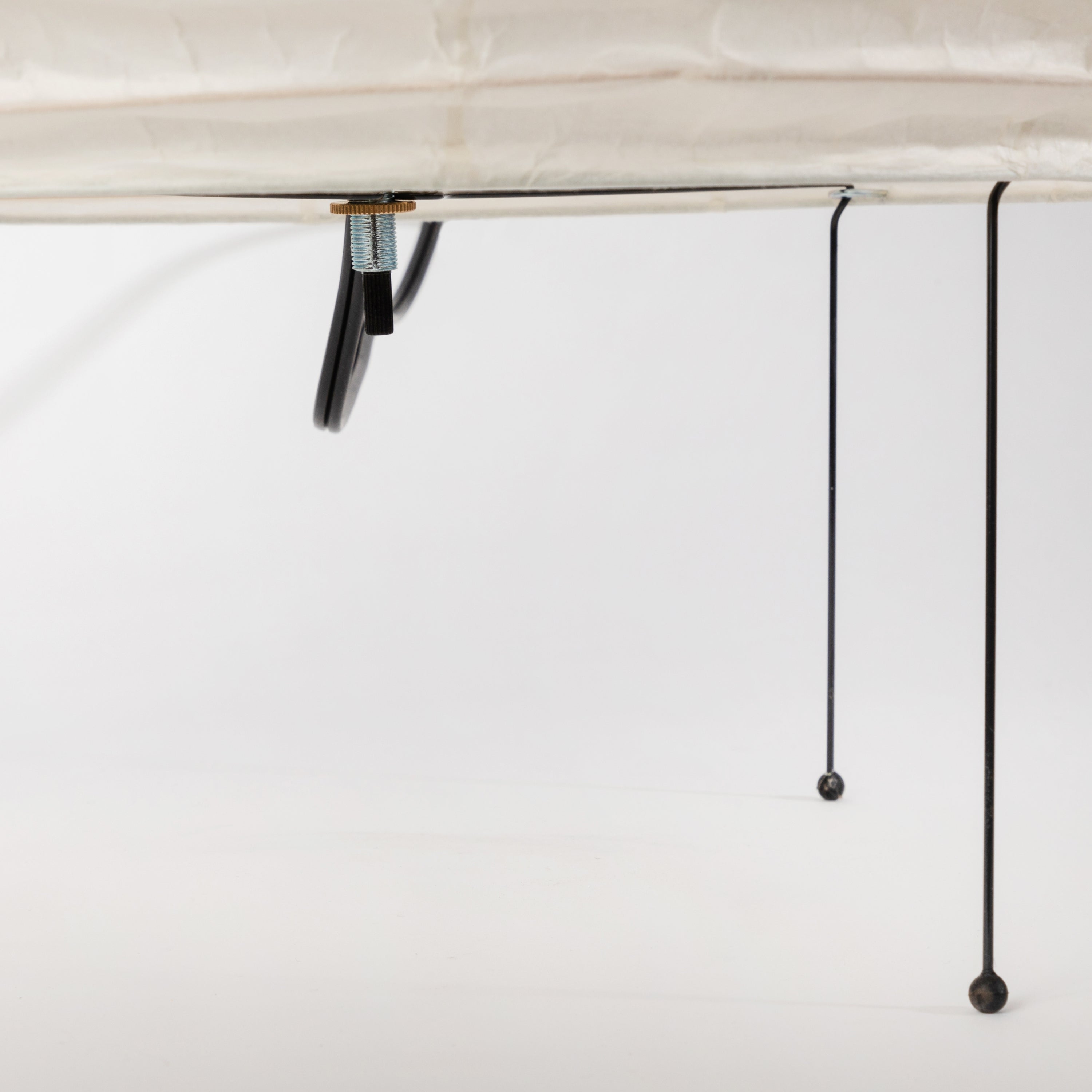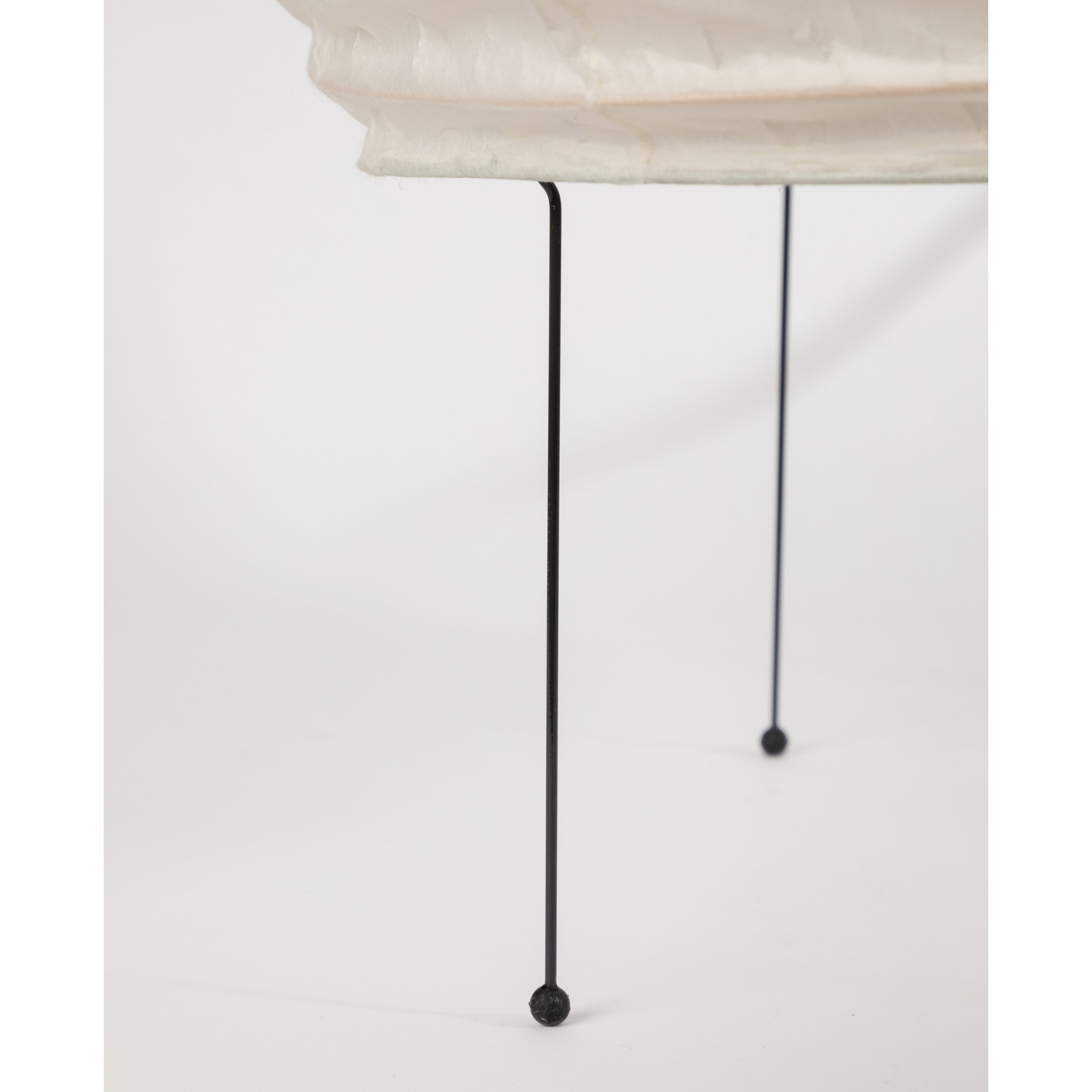 This table lamp has a shade made from handmade washi paper, ink and bamboo ribs with the original Noguchi Akari manufacturer's stamp. The lamp measures 24 inches from the feet to the top of the wire structure. The shade measures 16 inches at its widest point. The bulb casts a soft diffuse glow, providing a sculptural focal point in any space.