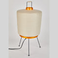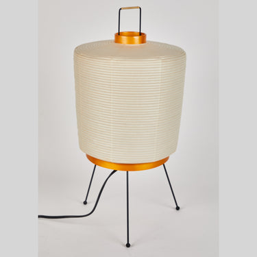 The shade is made from handmade washi paper, wood, and bamboo ribs with authentic Noguchi Akari manufacturer's stamp. The lamp measures 20 inches from the feet to the top of the wire structure. The shade measures 11 inches at its widest point. The bulb casts a soft diffuse glow, providing a sculptural focal point in any space.